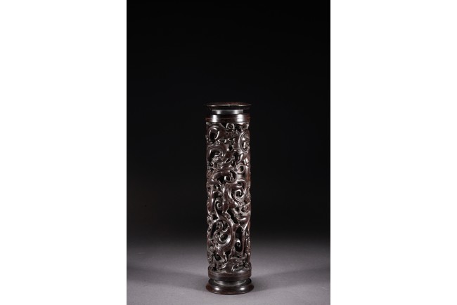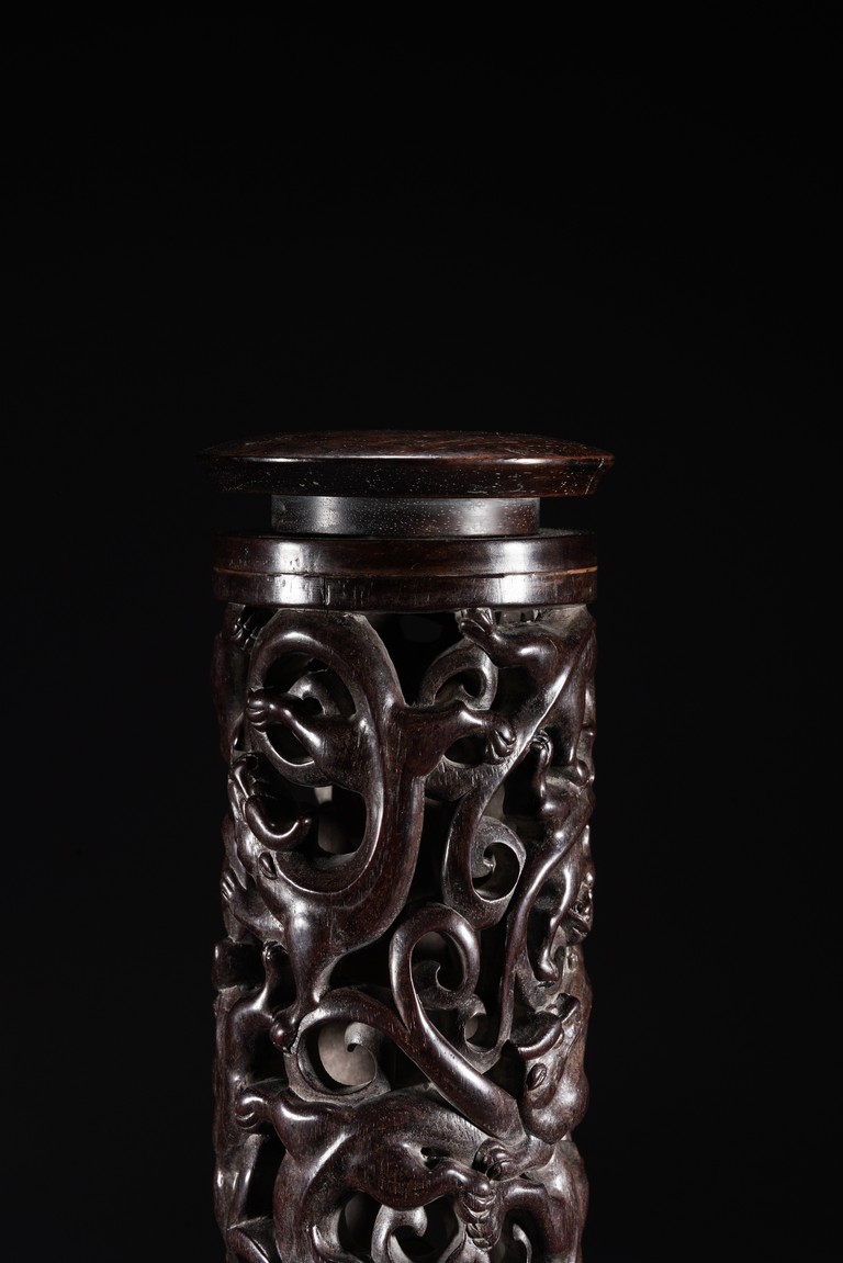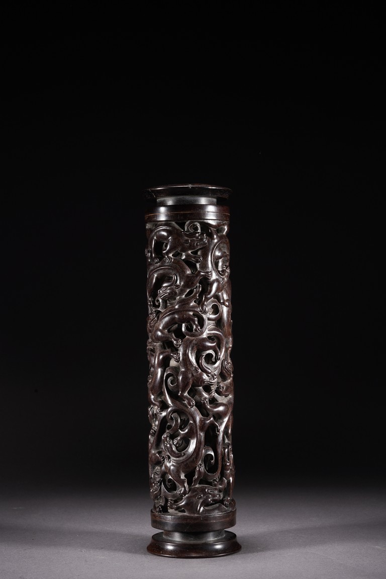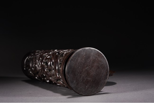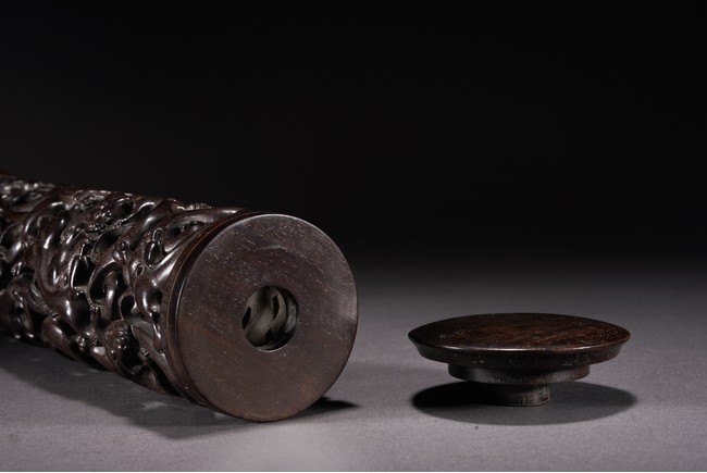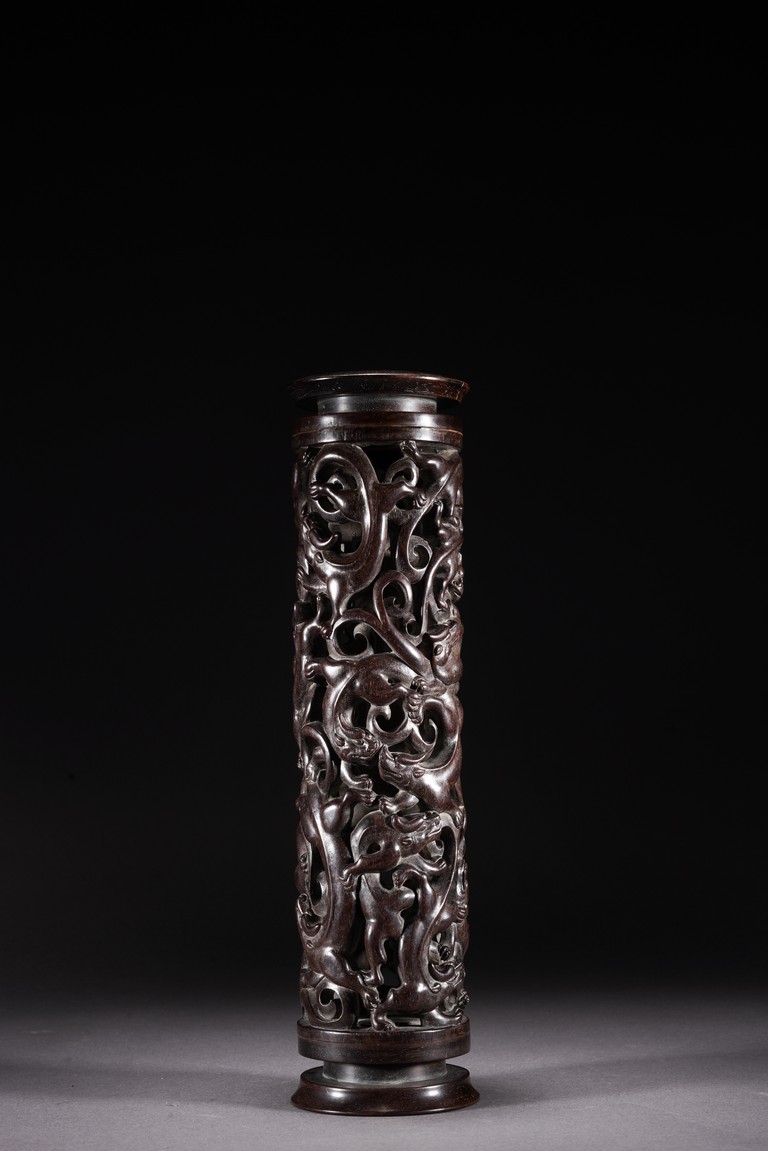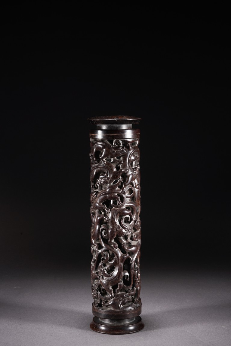 此香筒紫檀為材,色澤沉潤幽深,皮殼包漿濃厚,極具分量感。上下配蓋底,色澤搭配和諧雅緻。筒身鏤空雕刻螭龍紋,昂首奮鬣,張吻吐舌,俯仰相向,身尾跂足,蜿蜒環轉,佈滿全筒。雕刻刀法流暢,本品與王世襄舊藏明代竹雕雙螭紋透雕香筒極為相似,為木雕香筒之佳作。