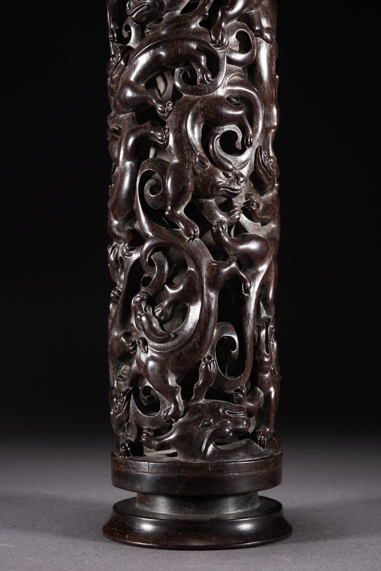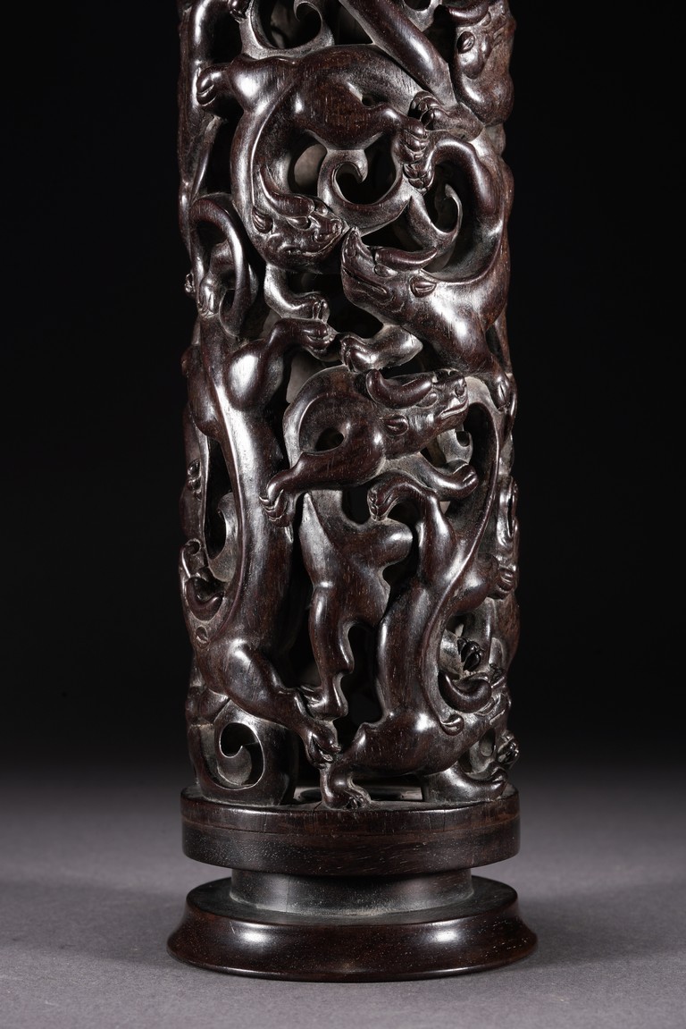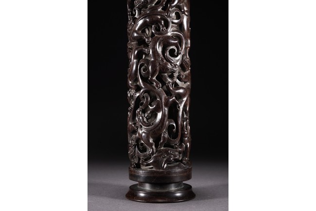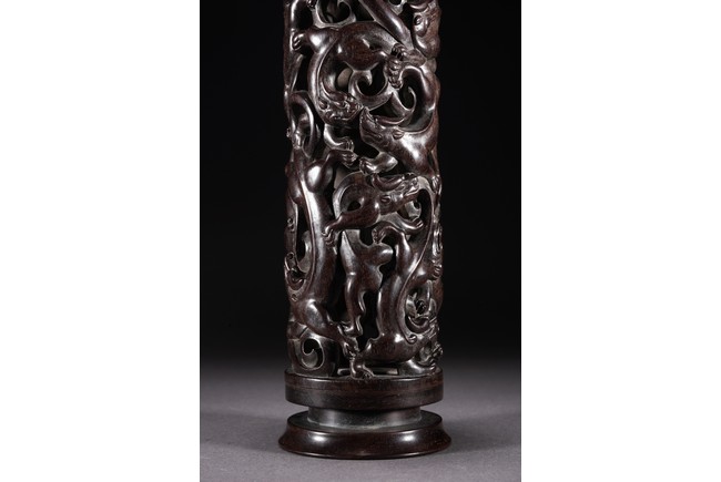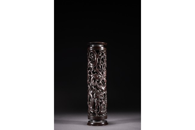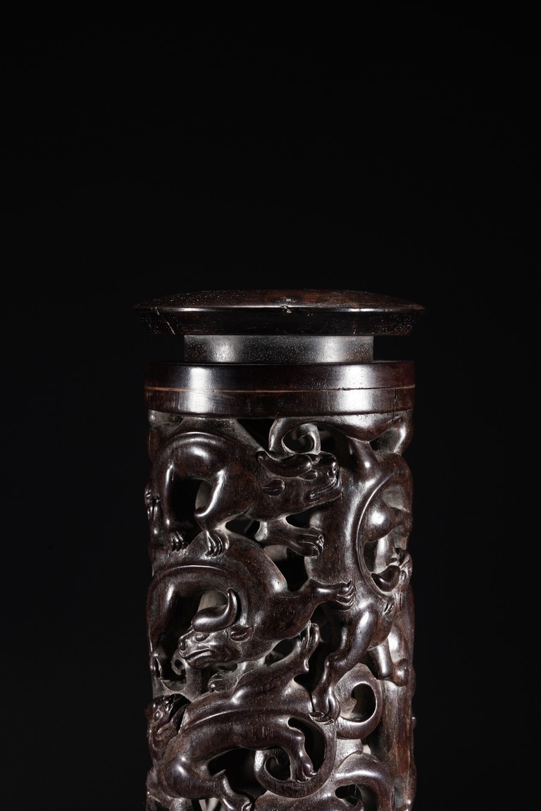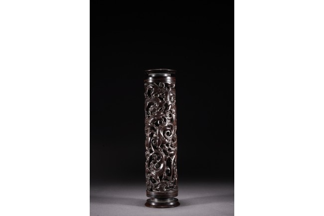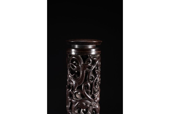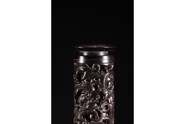 此香筒紫檀為材,色澤沉潤幽深,皮殼包漿濃厚,極具分量感。上下配蓋底,色澤搭配和諧雅緻。筒身鏤空雕刻螭龍紋,昂首奮鬣,張吻吐舌,俯仰相向,身尾跂足,蜿蜒環轉,佈滿全筒。雕刻刀法流暢,本品與王世襄舊藏明代竹雕雙螭紋透雕香筒極為相似,為木雕香筒之佳作。
