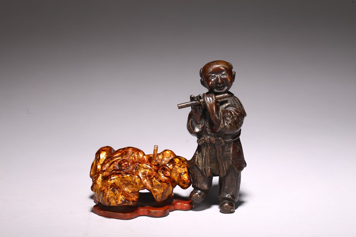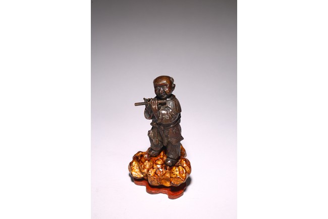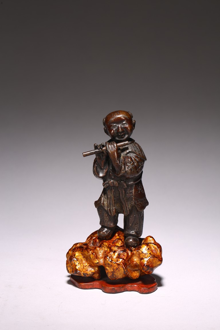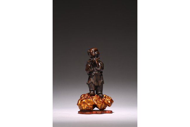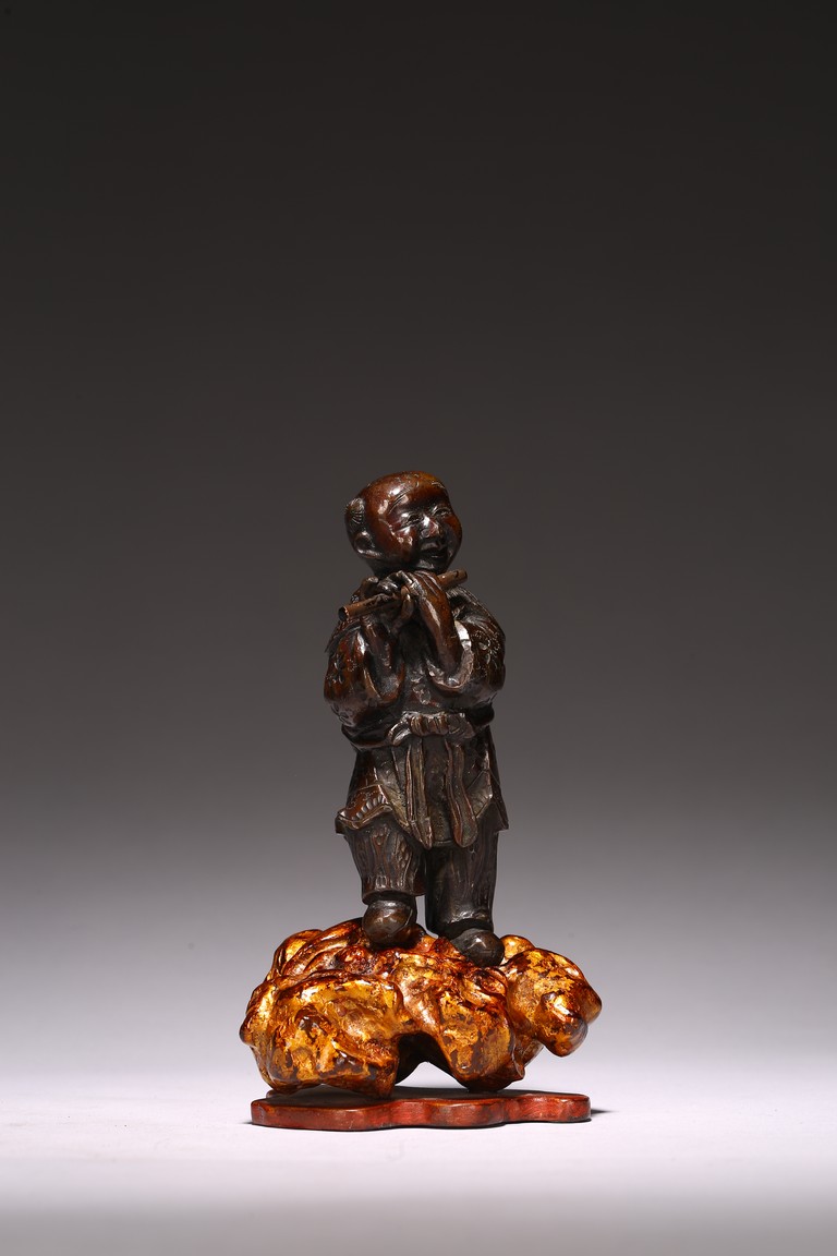 Chinese. The boy shown standing playing flute on a lacquered wood base resembling rock. Qing Dynasty period, 18th century.