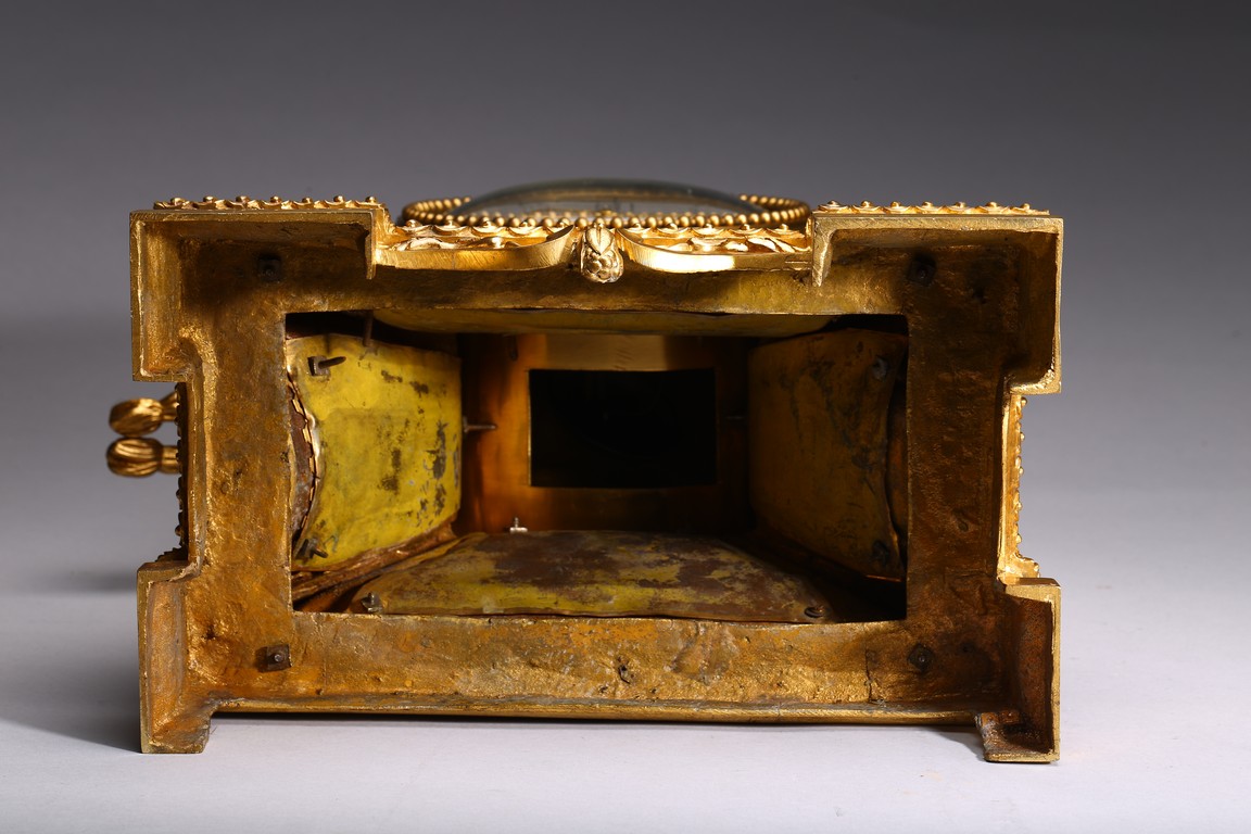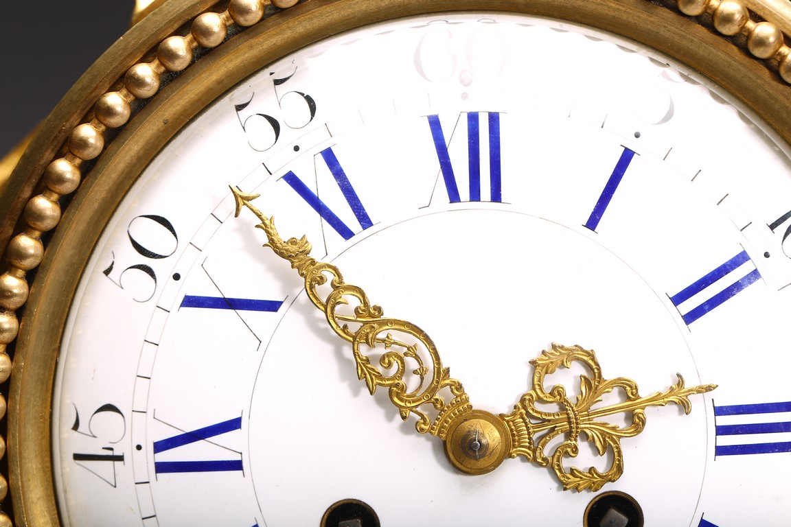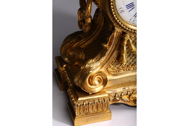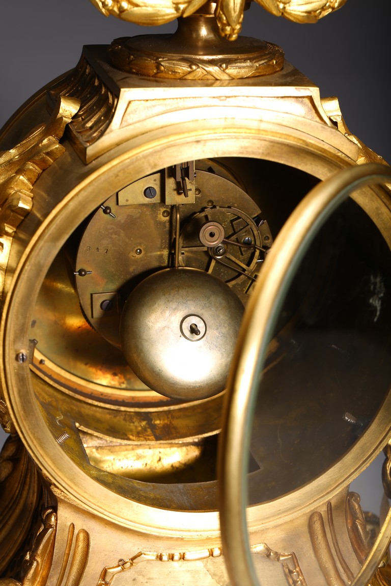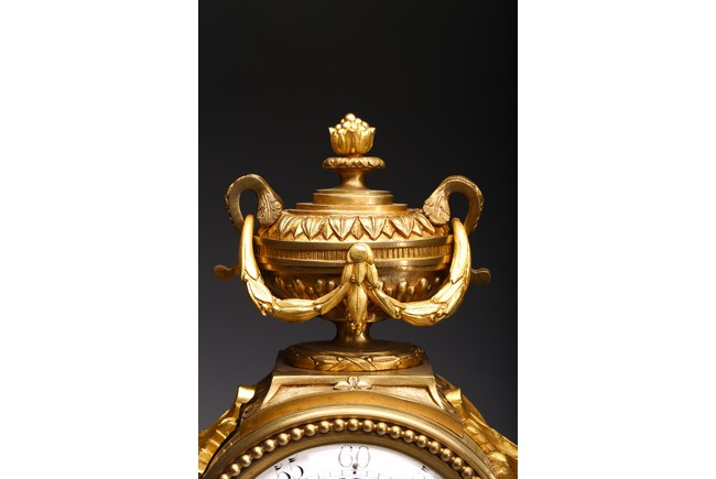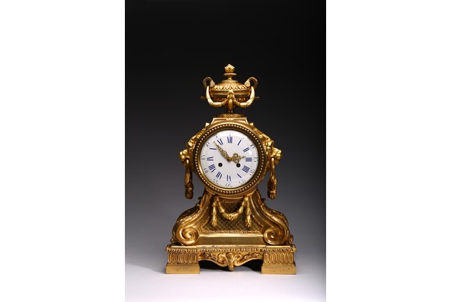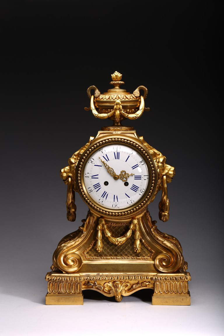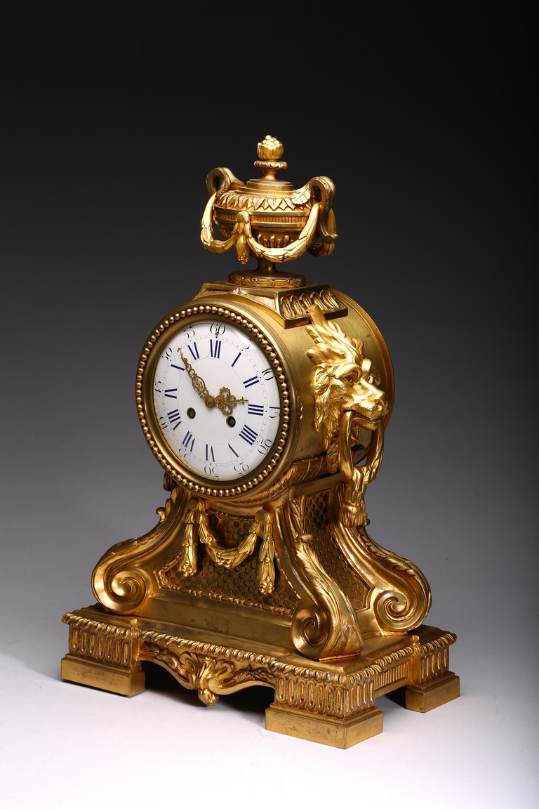 The circular case with enamel dial, flanked by large lion's masks with suspended swag handles, raised on a scrolled base and surmounted with a classical urn form finial. Circa 1900.