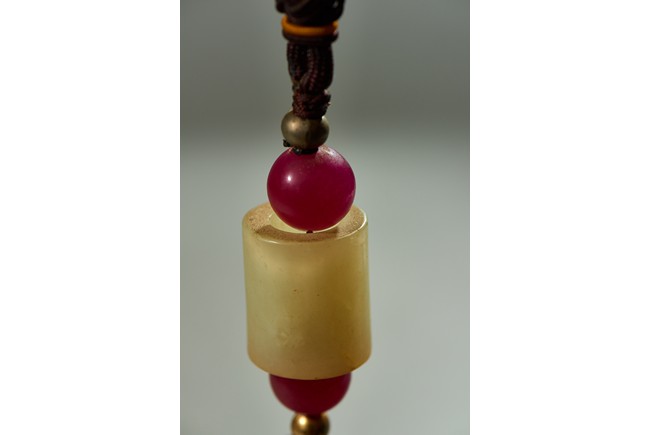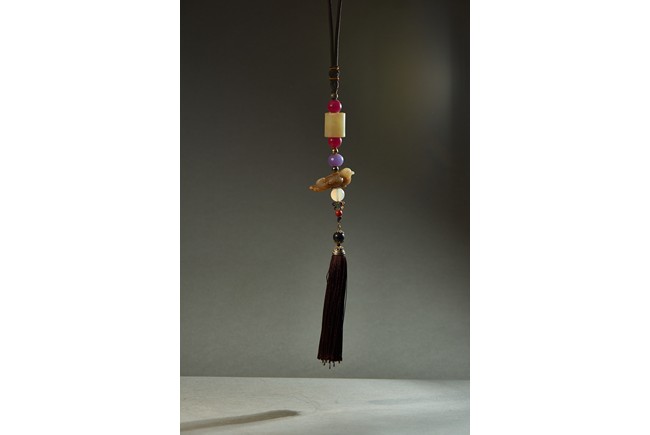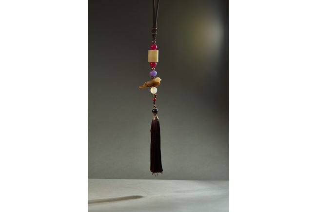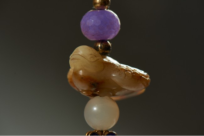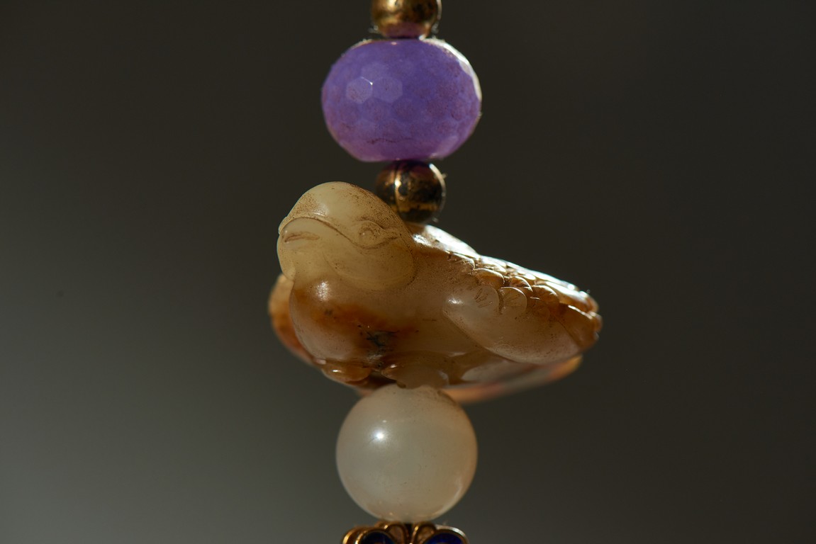 The jade pendant carved in the form of bird with detailed feather, the head with beak and rounded eyes.
