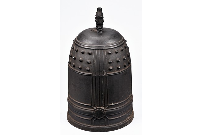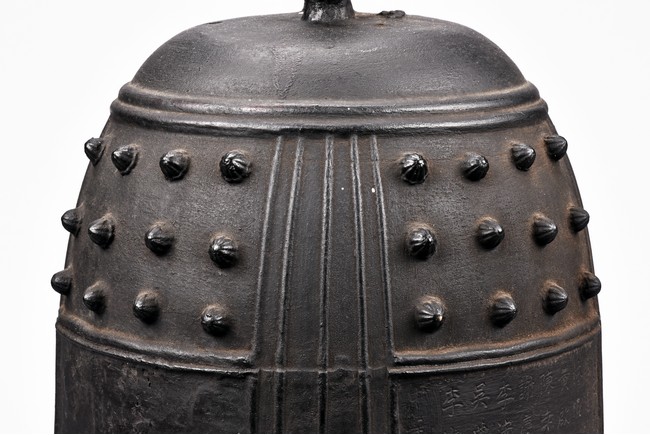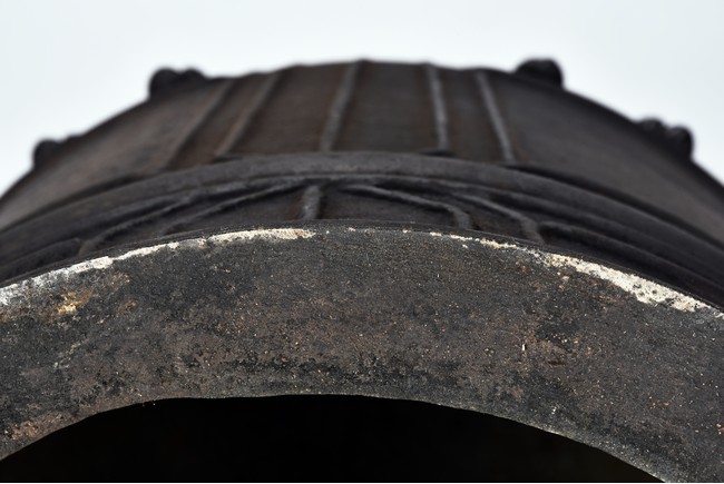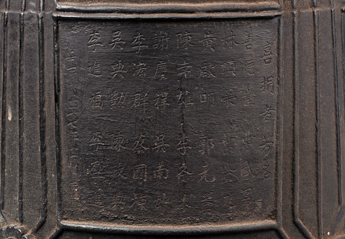 Cast with a double mythical beast loop handle, the deep sides slightly flaring, the body decorated with raised stubs and incised with names of donors. Republic period.