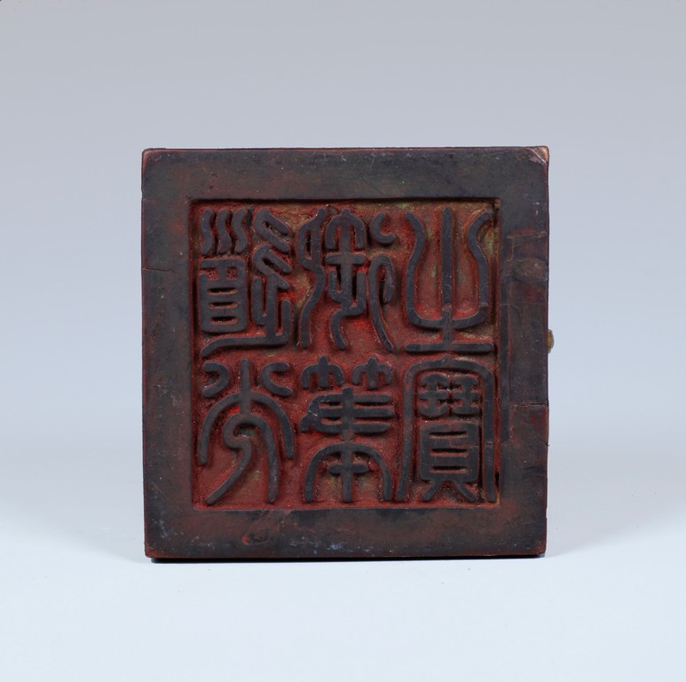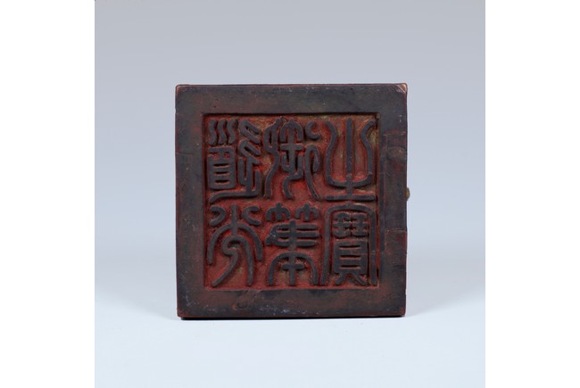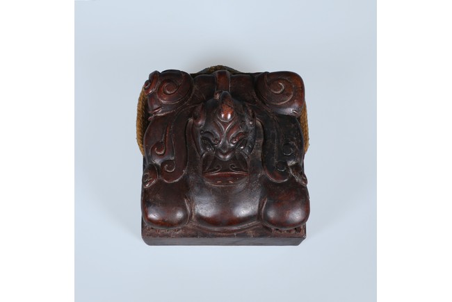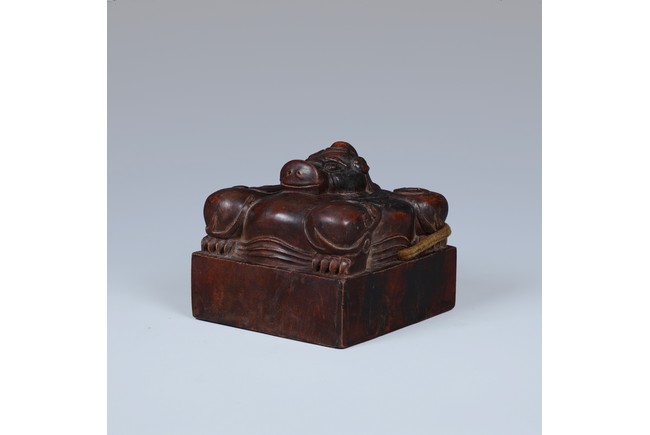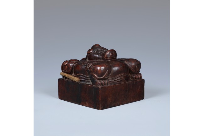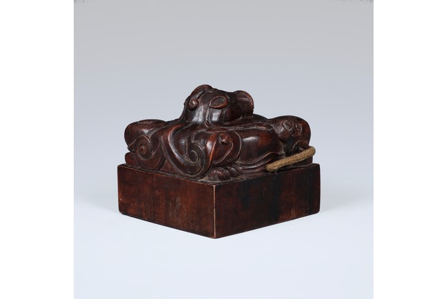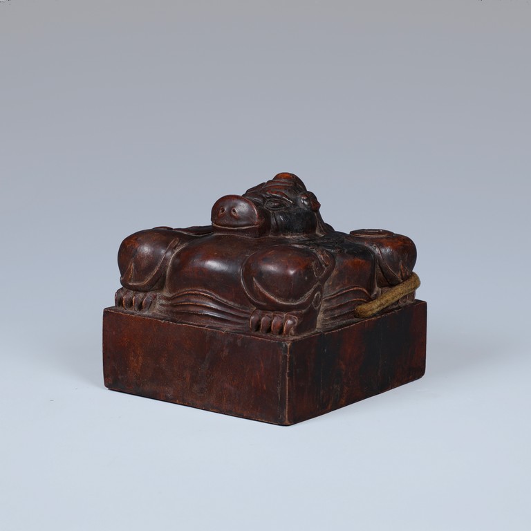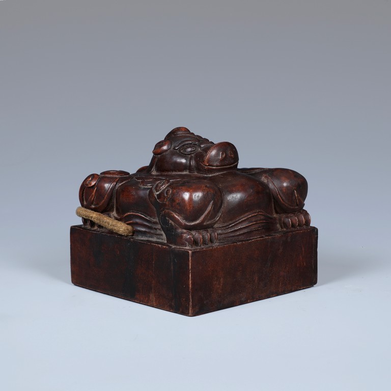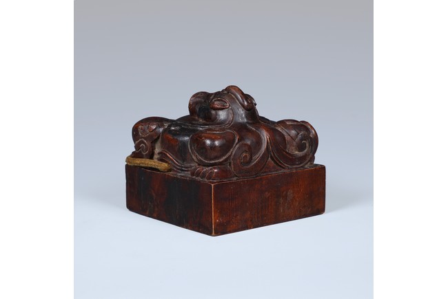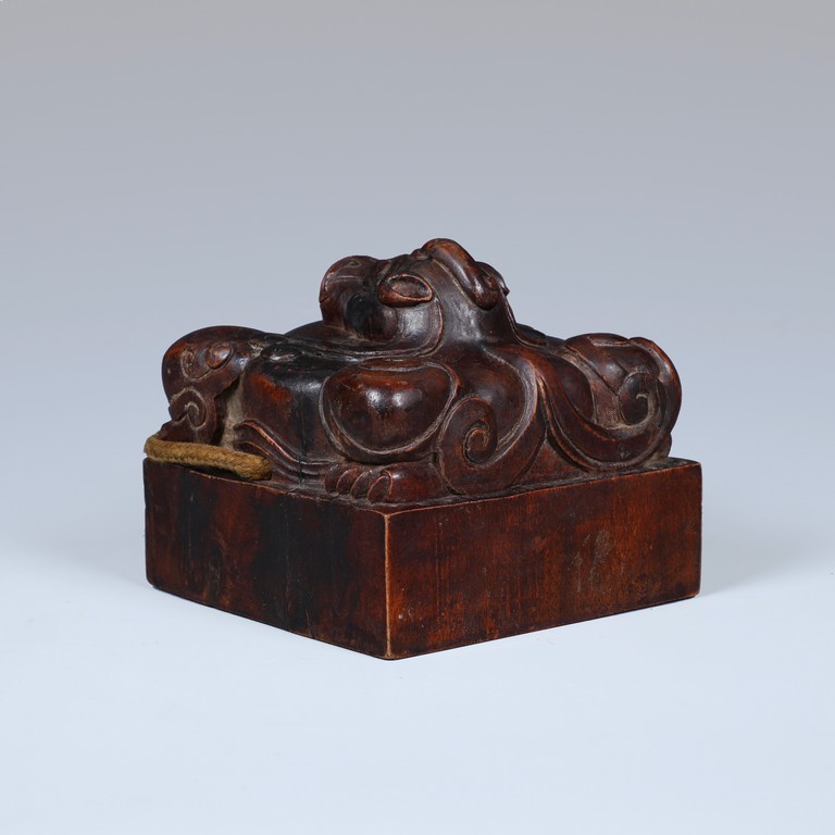 Of square form, the seal carved in high relief with a seated mythical beast, the seal face carved with six character, the wood is of characteristic aroma of sandalwood. Qing Dynasty period.