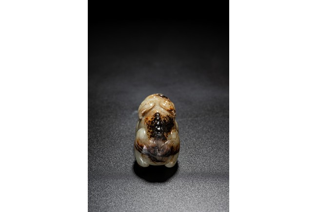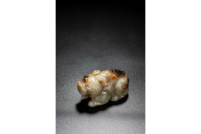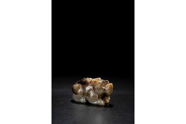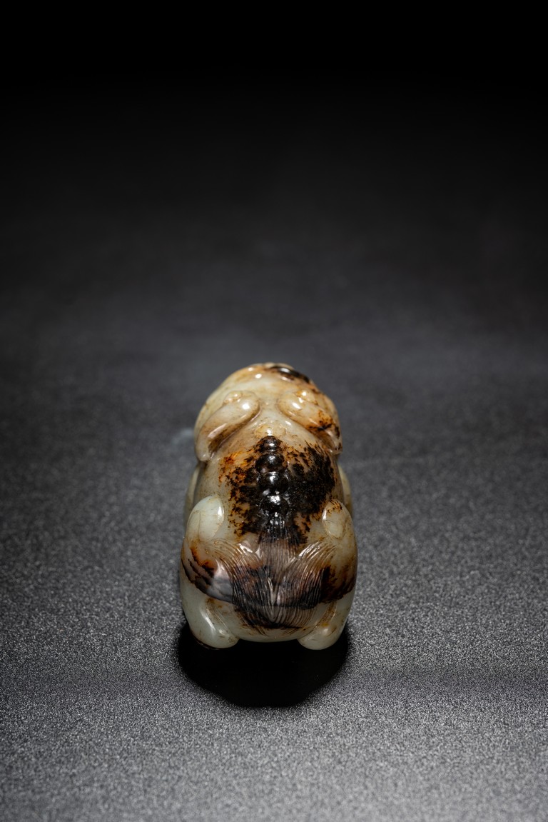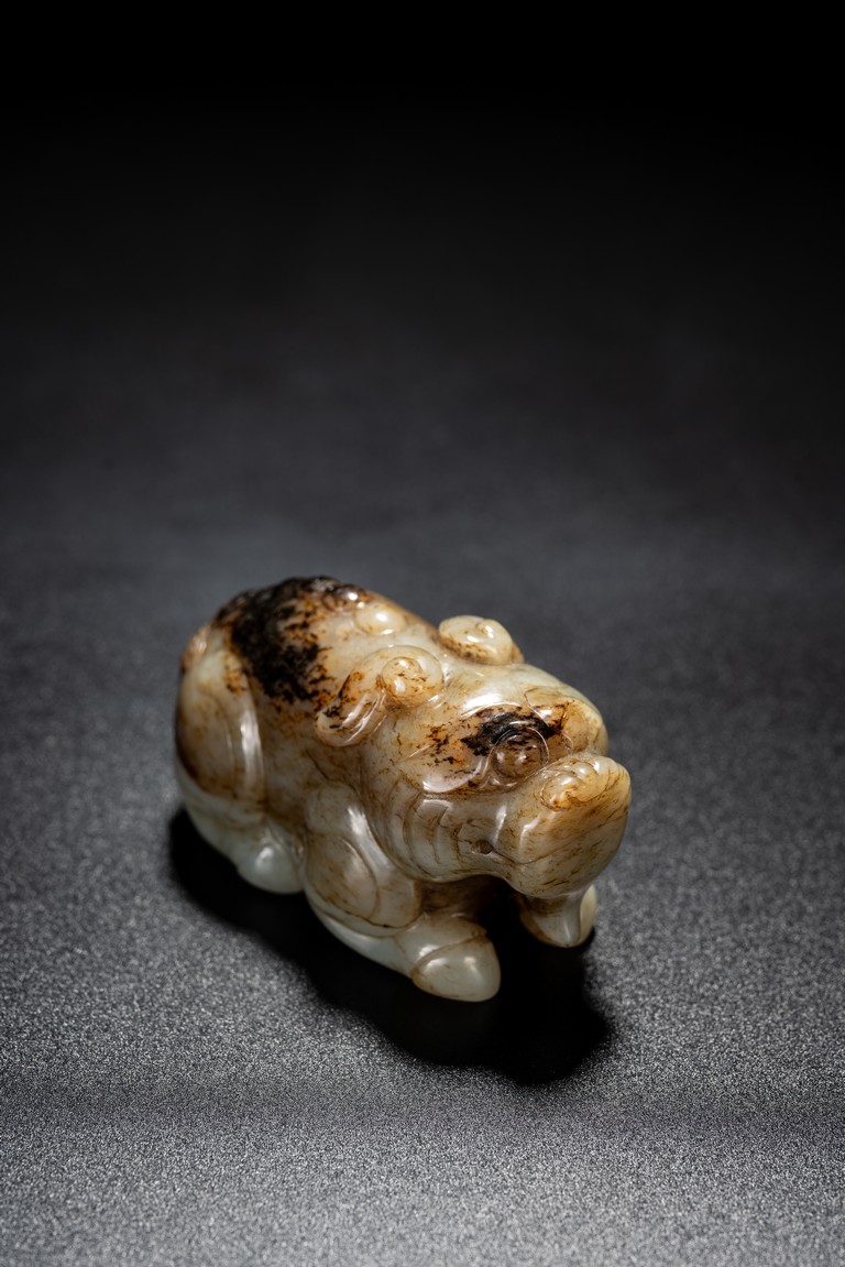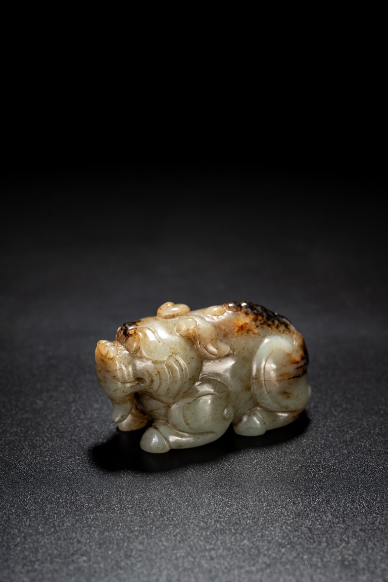 The recumbent mythical beast shown with protruding eyes and large flared nostrils, the celadon tone stone with extensive black and russet inclusions. Ming Dynasty period.