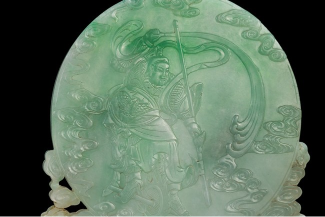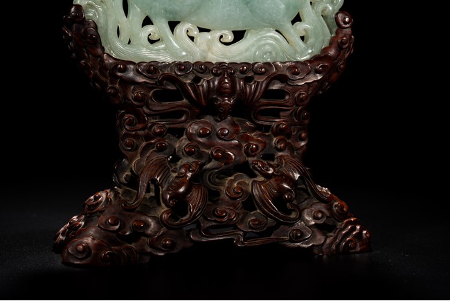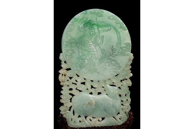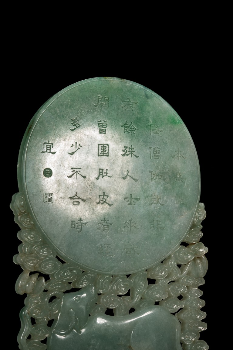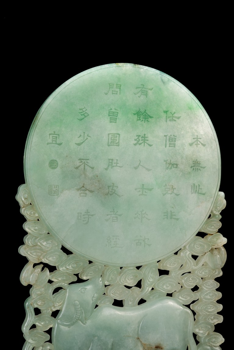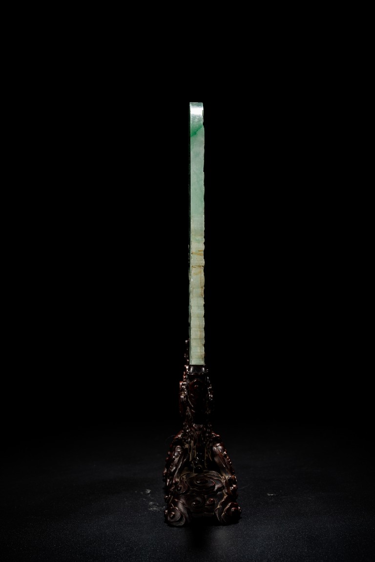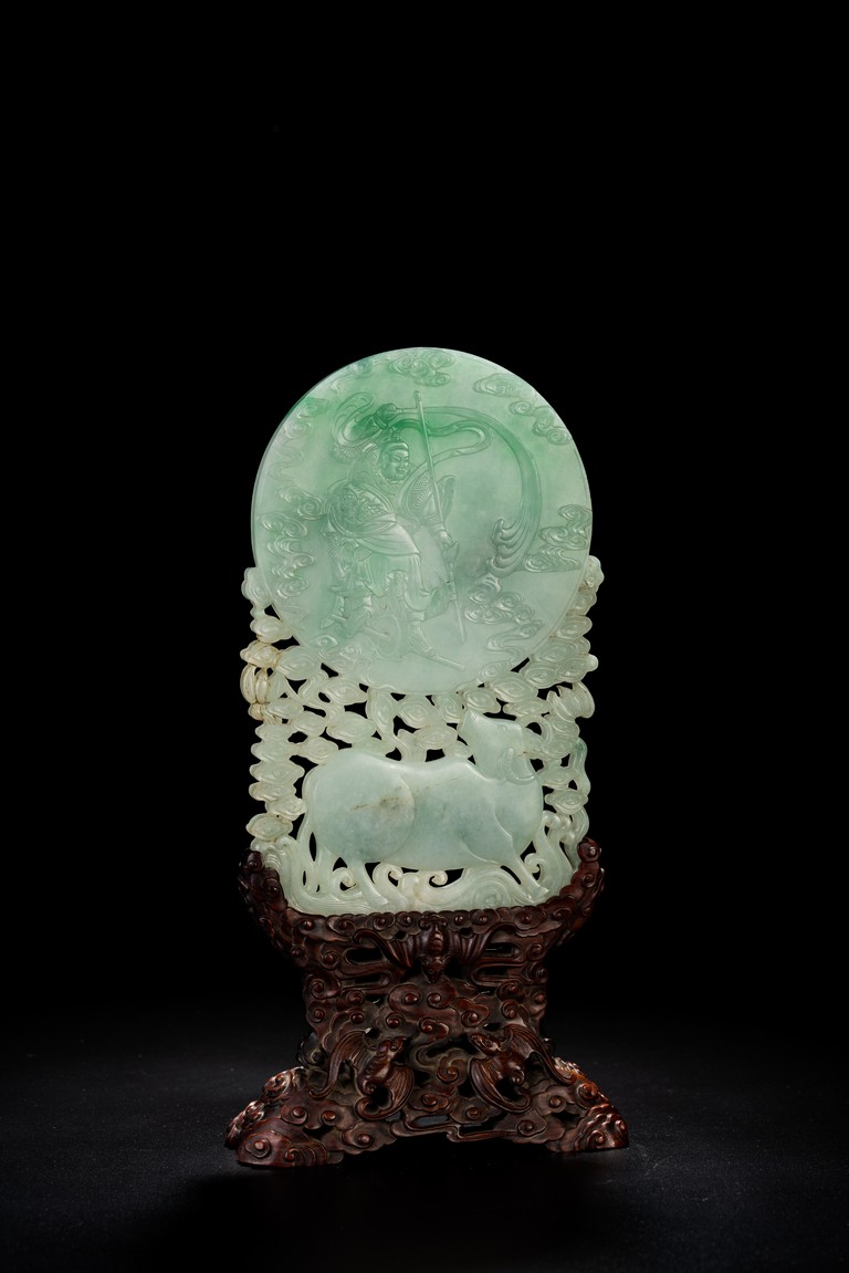 此插屏材料碩大,色澤溫潤翠綠,以犀牛望月為題材,採用漏雕、透雕、淺刻等技法,使故事情節栩栩如生,古意悠悠,令人神往,插屏刀法深峻有力,細膩流暢,佈局景物如畫,質料均佳,包漿潤澤,實為雋品。且有原配木座相輔,若置於書齋,可鑒詩意之美,亦得清賞之樂。來源:加拿大溫哥華私人藏家收藏 Provenance: Private collection, Vancouver, Canada