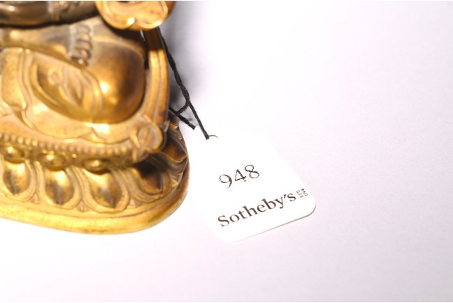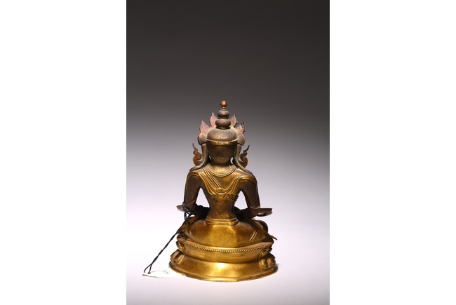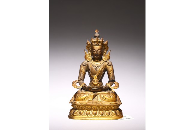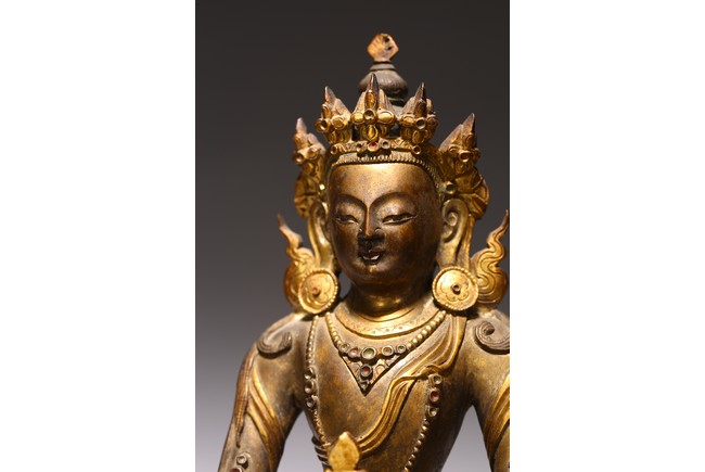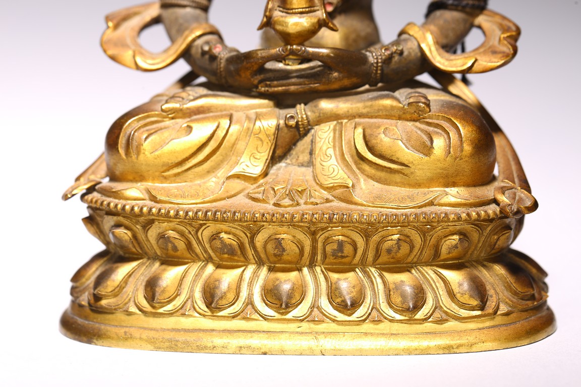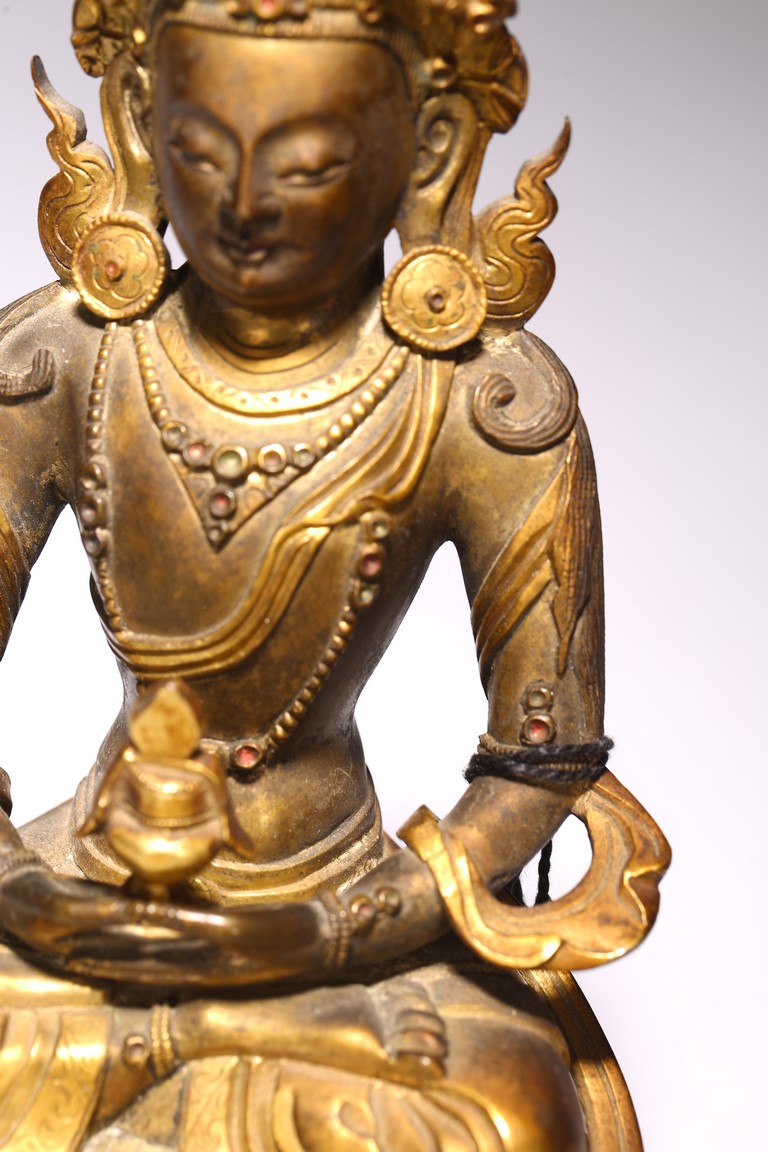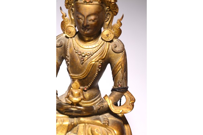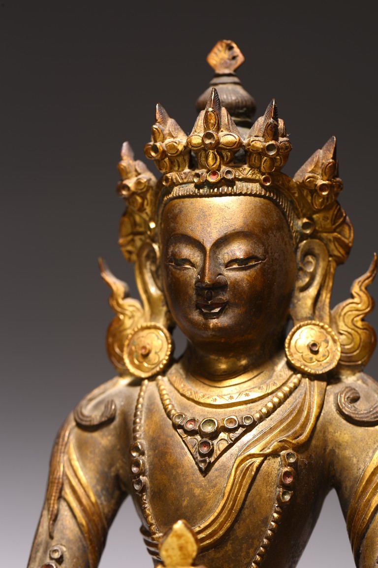 無量壽佛是佛教信仰中極為重要、流傳廣泛的尊神。能滿足現世人間眾生的對於壽命綿長的追求,亦能接引善良的眾生死後超脫輪迴之苦,故此是佛教信仰中廣泛流傳的神祗。無量壽佛即阿彌陀佛,為西方極樂淨土世界的教主,以無盡願力誓渡一切眾生,不捨悲願,以無量光明照獨行者,業障重罪皆可消減,凡持其名號者,生前獲佛護佑,消除一切災禍業苦;死後更可化生其極樂淨土,得享一切安樂,法力強大。此尊無量壽佛面龐方圓,頭戴五葉花冠,頂結高髮髻,耳側繒帶翻捲,耳垂圓形花璫。面容莊嚴肅穆,雙肩寬厚,腰部收束,顯得軀體柔軟。上身飾連珠式瓔珞和長鏈,手和足部穿釧躅,下身著長裙,雙肩披大帔帛。裙子與帔帛表現手法極為寫實,紋褶轉折起伏,流走自然,頗為灑脫生動,表現出絲織物的柔軟質感。結跏跌坐於雙層束腰蓮花寶座上,雙手持寶瓶置臍下結禪定印。蓮花座造型規範,花瓣飽滿有力,上下邊緣各飾一周圓形連珠紋,連珠顆粒飽滿,鑄造精緻。整器造型完美,材質優良,雕工精細,雍容華貴,流光溢彩,衣緣裙邊均有細密刻花裝飾,更彰顯其奢華。來源: 蘇富比紐約, 2019年3月, Lot 948 Provenance: Sotheby's New York, March 2019, Lot 948