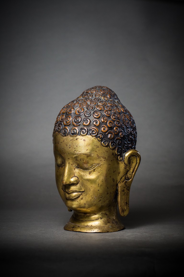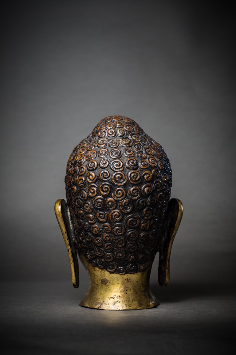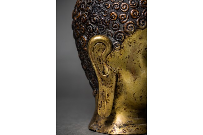 此尊佛頭體型巨大,十分罕見,頂有肉髻,細長的彎眉,雙眼俯視,隆鼻挺秀,雙唇微啟,大耳垂肩,一副慈善、笑意濃濃的面相豁然於眼前。整個佛首保留原裝鎏金,狀態完好,其整體造型典雅,氣韻不凡,端莊大氣,雄渾沉穩,不失為一件空間呈設之藝術上品。佛頭體型巨大,有如此巨大佛頭,可以想像當年完整佛身應是何等壯觀,著實讓人感嘆古人鑄造技藝之高超,敬佛崇聖之心誠。