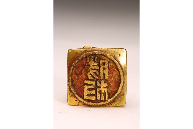 Ming Dynasty period or later. Of square section, the seal surmounted with a coiled chilong with protruding eyes, the seal face in circular form cast with two characters.