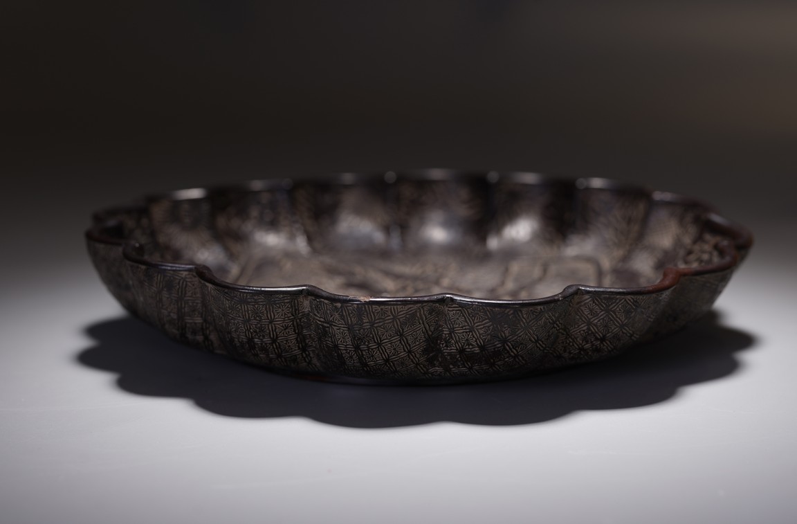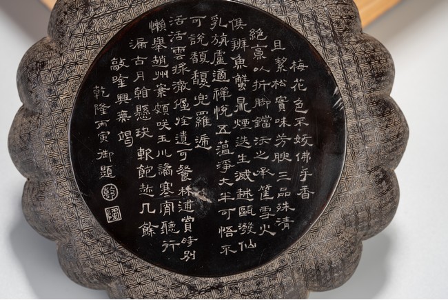 Of lobed form, the interior carved and lacquered in black with bird and flowers, the base inscribed with imperial poem and seal marks.