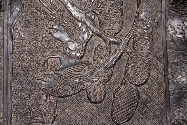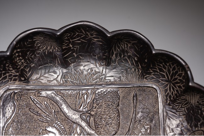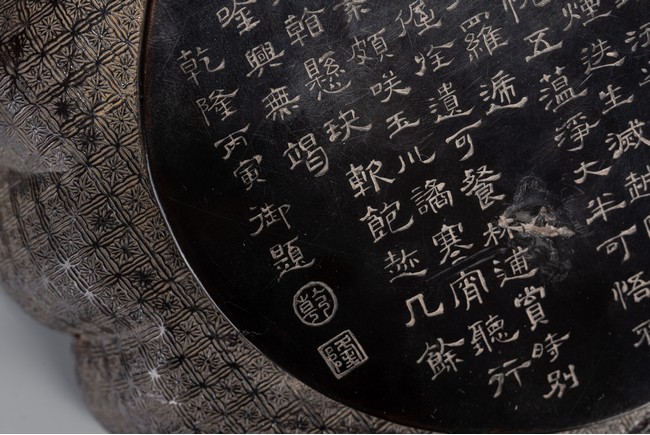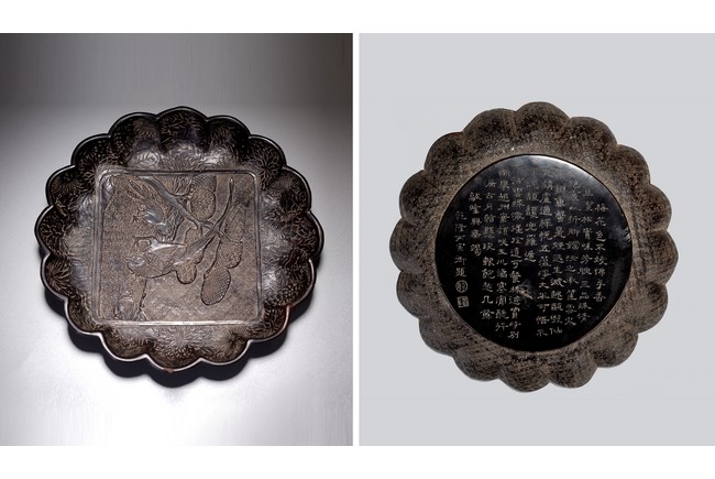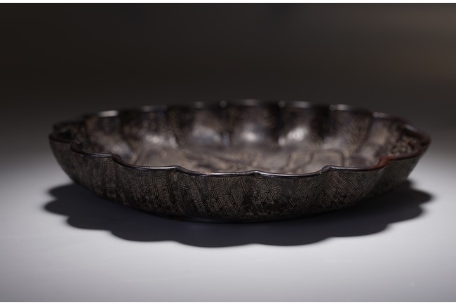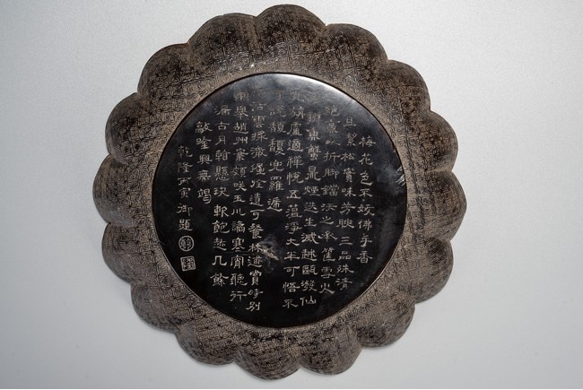 此盤整體呈黑漆面,木胎,胎骨端正,漆盤週邊起翹呈蓮花花瓣狀,盤心精細雕琢花鳥紋飾,工藝精準脫俗,盤底刻御制詩文,雕工勁道有力,多年摩挲,保存尚好,是極具收藏價值的一款漆盤。