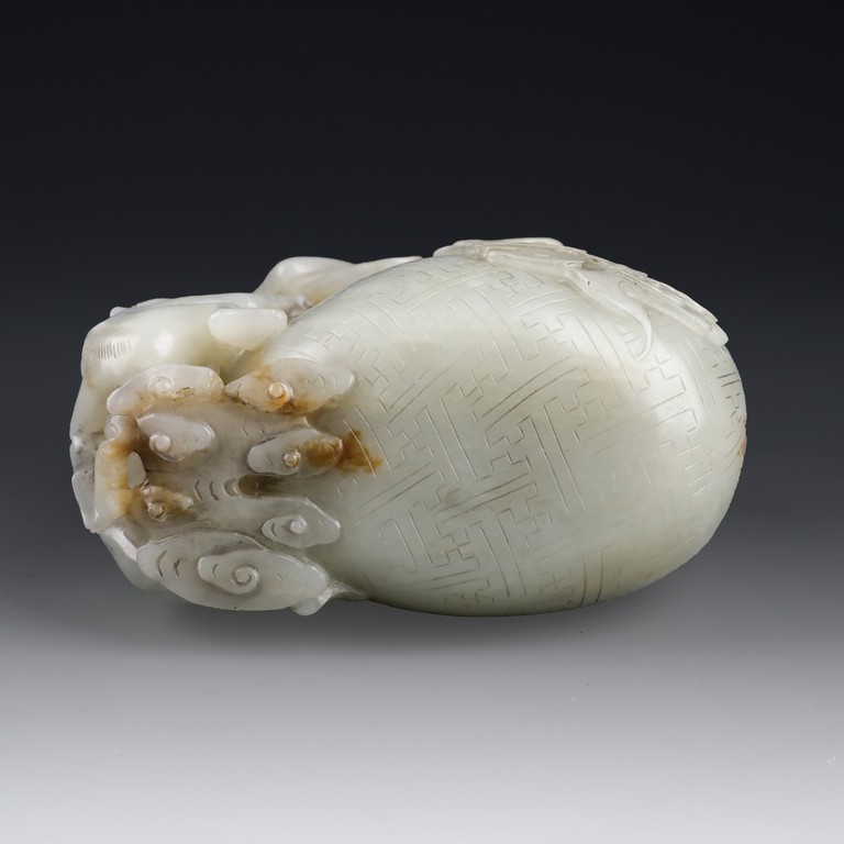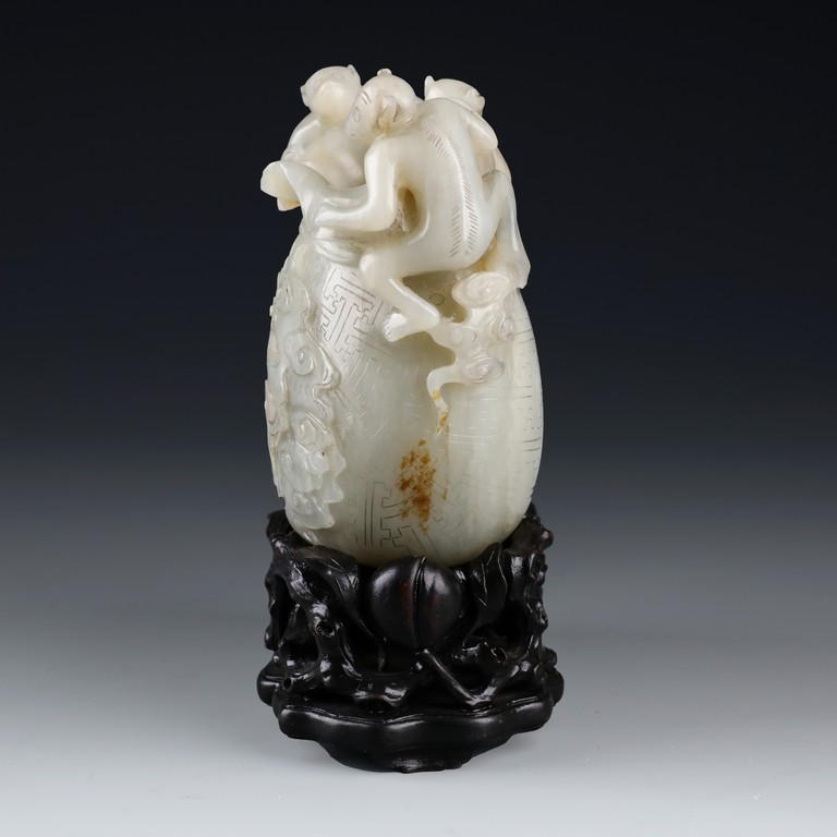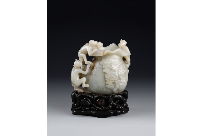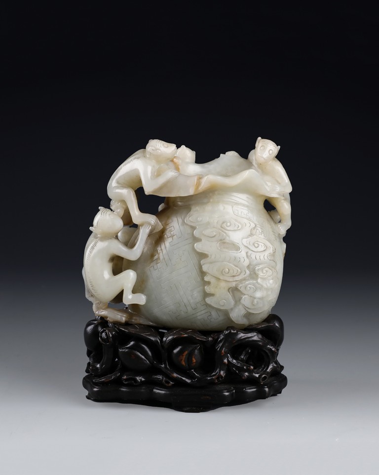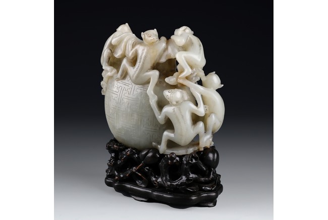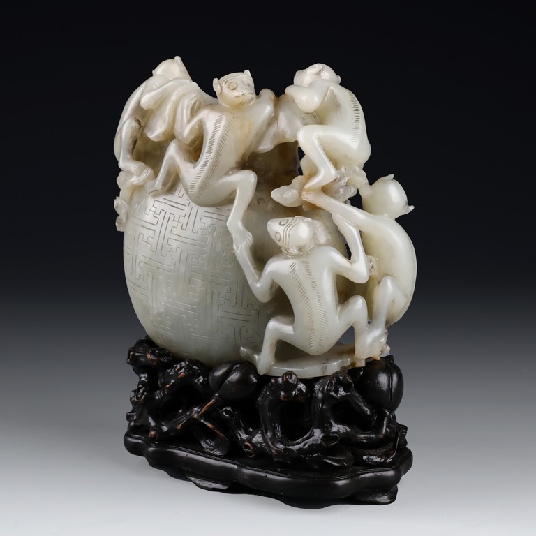 Carved in the form of monkeys clambering on the exterior of a cloth bag, with an auspicious meaning 'being officials in every generations' in Chinese, with hardwood stand. Qing Dynasty period.