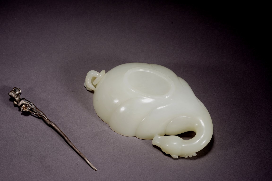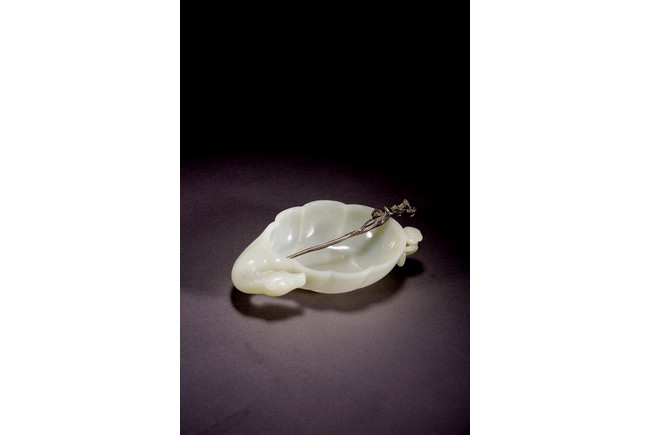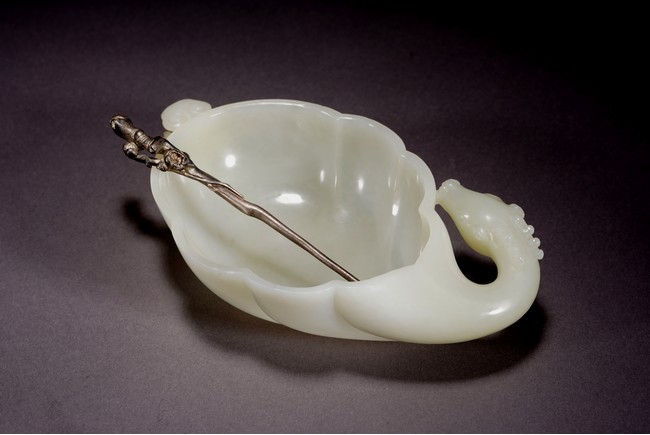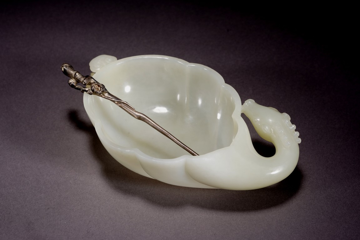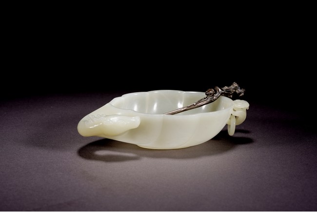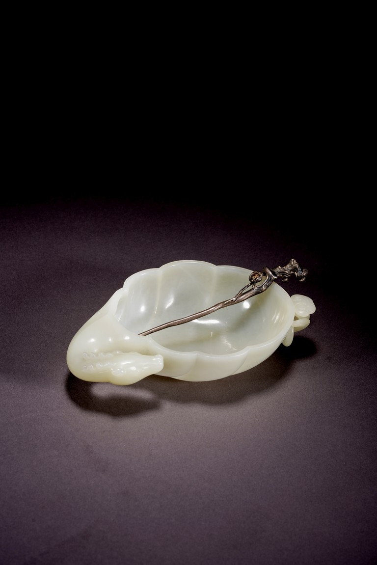 Qing Dynasty period. Of lobed and curved sides, set to one end with a ram-head handle, the stone of even white polished tone, the other end with a ruyi head loop with ring, bronze spoon.