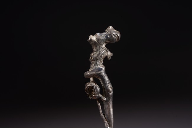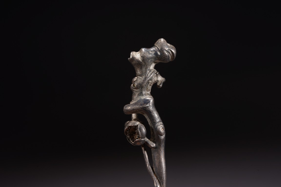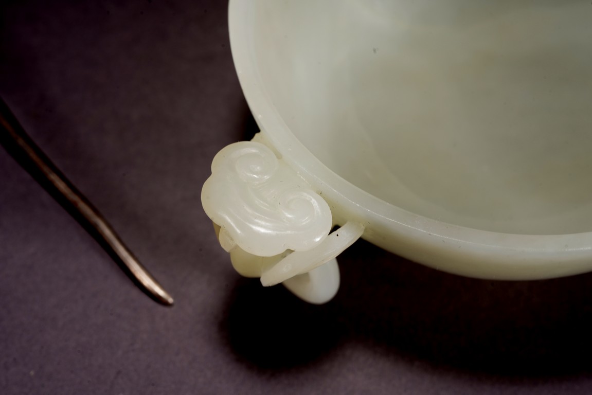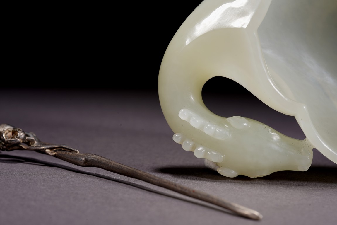 Qing Dynasty period. Of lobed and curved sides, set to one end with a ram-head handle, the stone of even white polished tone, the other end with a ruyi head loop with ring, bronze spoon.