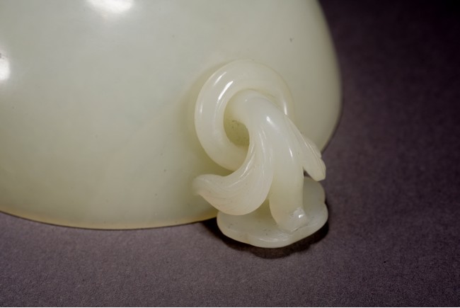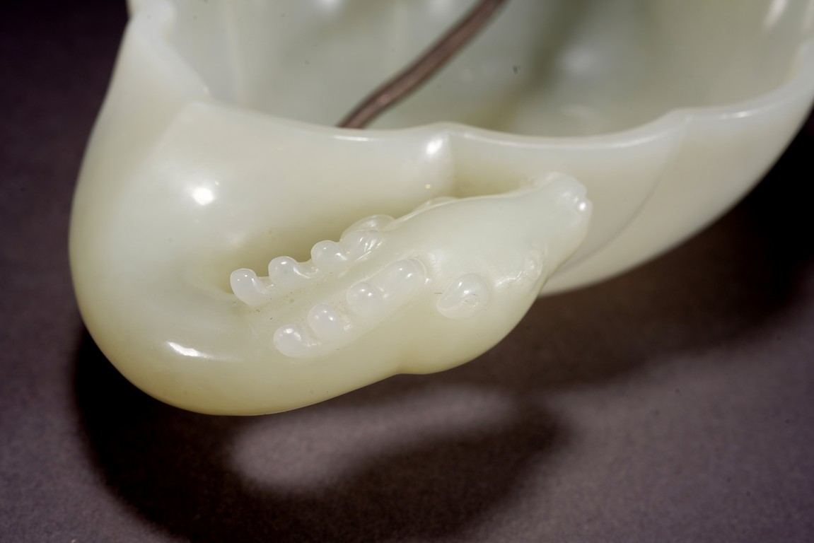 白玉質,玉泛米湯色,質地溫潤,上手有油脂感。筆洗葵口,整體琢成瑞鹿形象,瑞鹿顧首,靈芝雕其後,身上光素無紋。腹身掏塘成筆洗,內壁琢磨平滑細膩,整體造型曲線優美,充滿動感。
