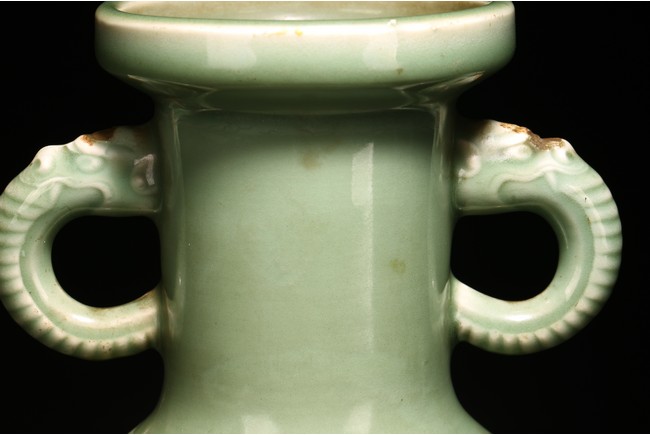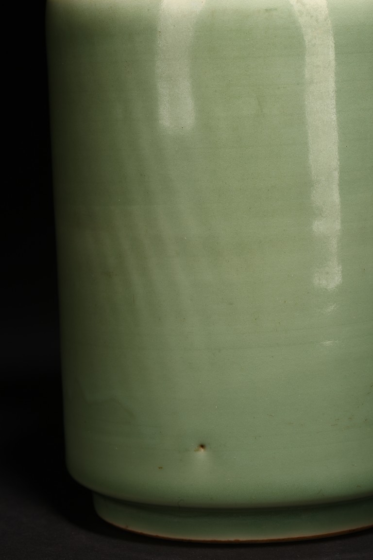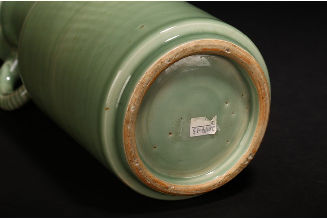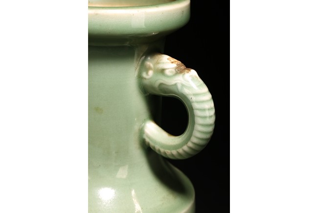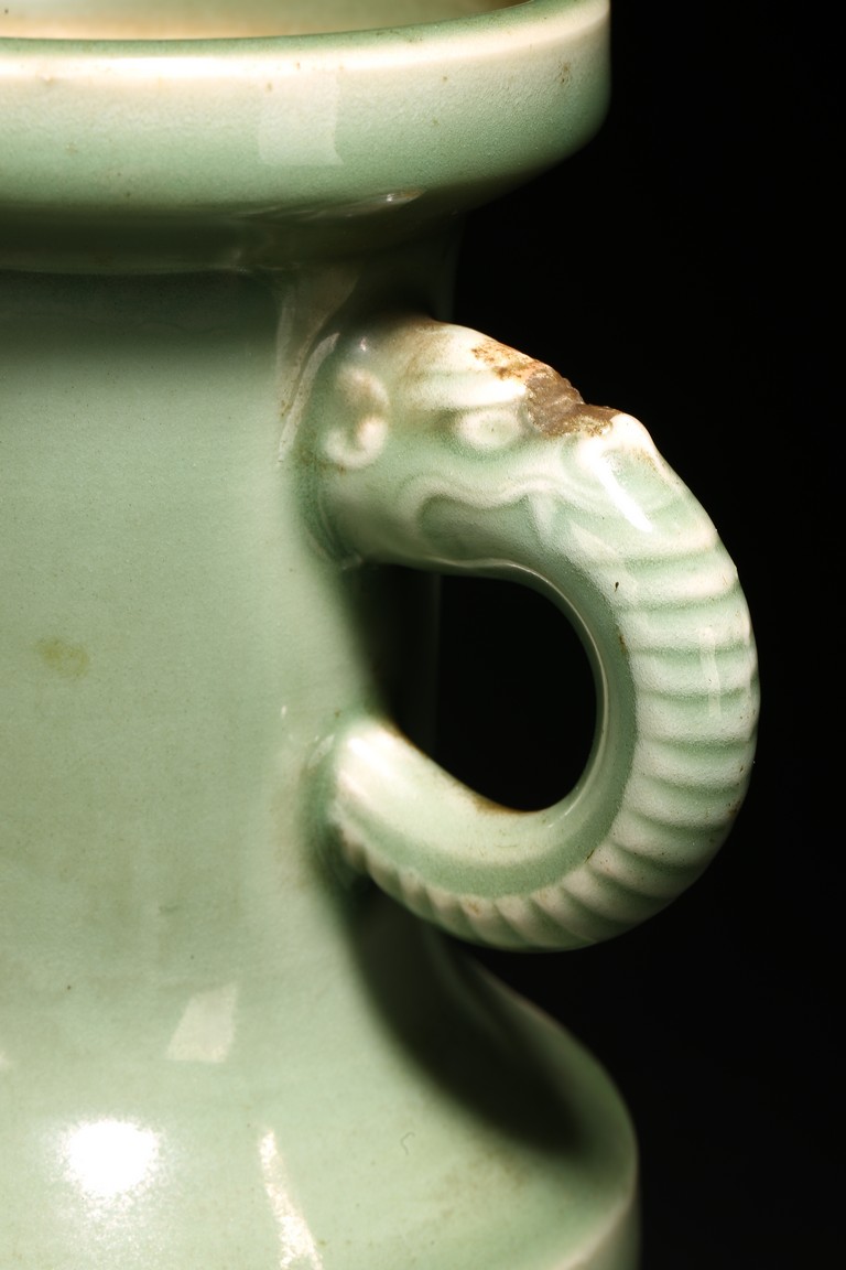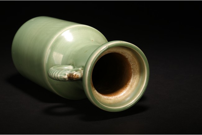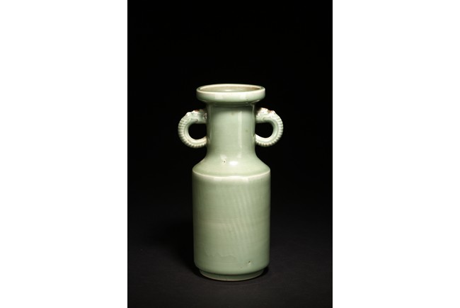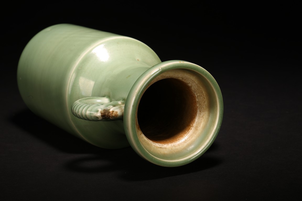 直口,直頸,直腹,圈足。飾雙龍耳,古雅神秘。器身通施青釉,青綠淡雅,釉面光澤柔和,釉汁肥厚,成色素雅勻淨。來源:南加州私人收藏,早年購於日本東京骨董市場 Provenance: Property from a southern california collection, orginally bought in Tokyo, Japan in the early years.