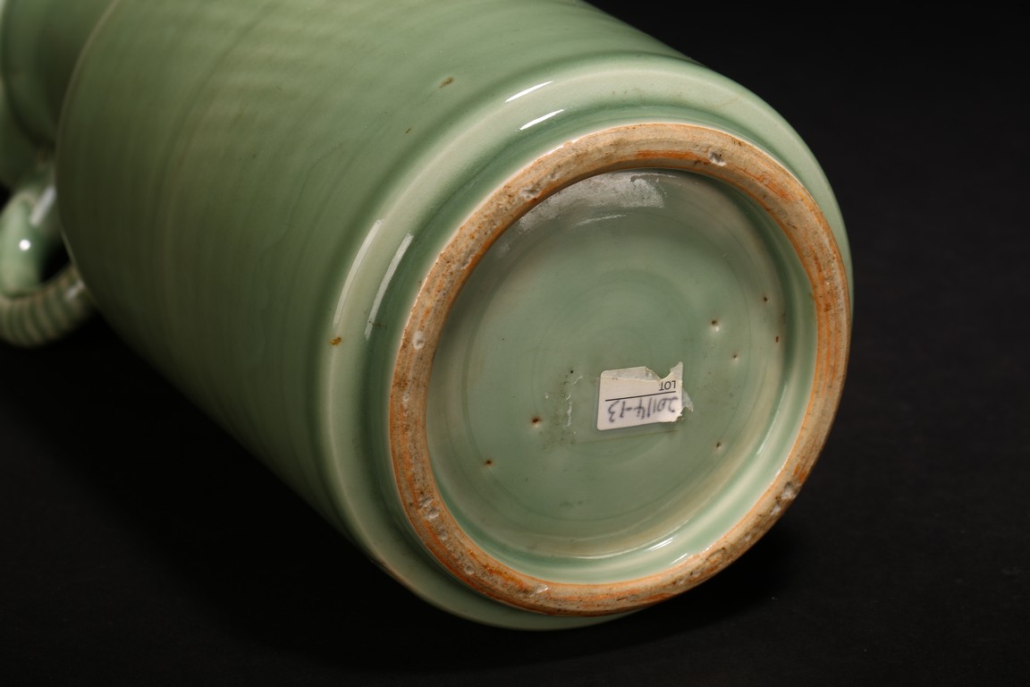Chinese. The tapering cylindrical body surmounted by a tall columnar neck and flanked by a pair of mask headed handles, covered overall save for the unglazed foot rim with an even sea-green glaze. Song Dynasty period.
