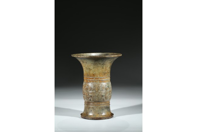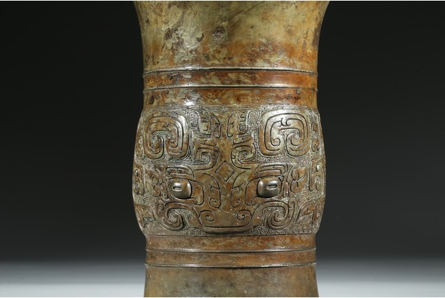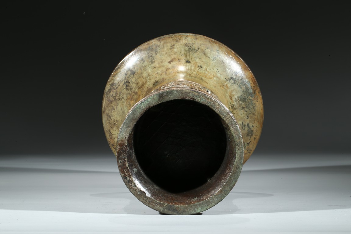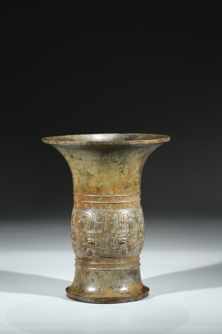 敞口,束頸,鼓腹,高圈足外撇。腹部雕刻饕餮紋,紋飾靜素,內有銘文,器形古樸。此花觚造型優美大方,雕琢精細,線條流暢,是一件陳設收藏的佳器。來源:紐約市重要私人藏家提供 Provenance: From a private New York City collection