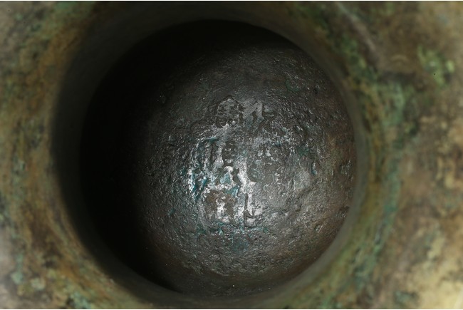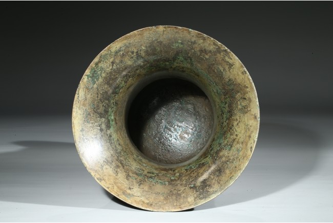The central bulb cast in relief with a pair of taotie masks with bulging eyes among scrollwork decorations, set between a pair of raised lines on tall flaring neck and spreading foot cast, the bronze with the patina of warm greenish brown tone, the interior of the base cast with six characters. Western Zhou Dynasty period.