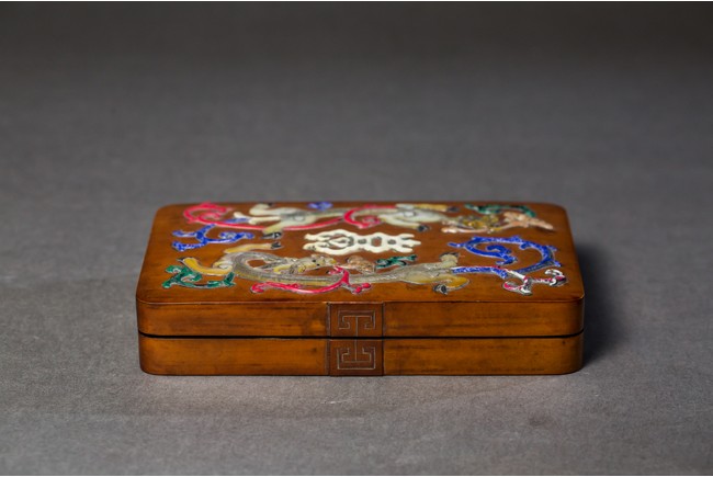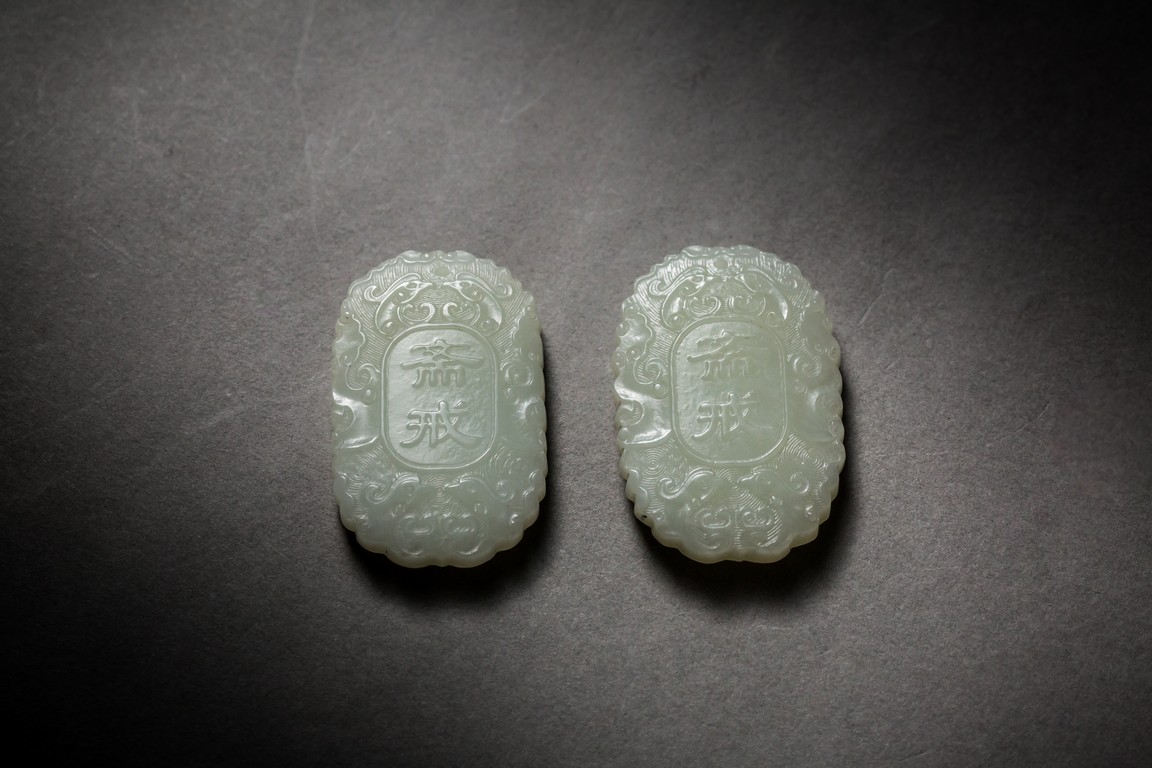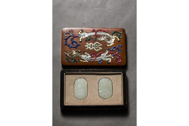 齋戒牌創自清康雍年間,為清代皇帝及文武官員祭祀時掛於身上之祀牌,以期彼此觀瞻,起到簡束身心、竭誠致敬之效。玉牌形制小巧,以“海水鳳鳥紋”為地,正面雕琢陽文“齋戒”二字,以楷書為體,字形端正,大氣嚴謹。另一面以滿文書就,字形略長,滿文筆畫連貫,字體雕琢氣韻流暢,與背面楷書相互映襯,各具特色。玉質潔白無瑕,溫潤細膩,成對保存完好,配有原裝嵌百寶黃楊木盒,木盒嵌有雙龍,所嵌雙龍威猛、形態自然,為典型的清代宮廷藏品。