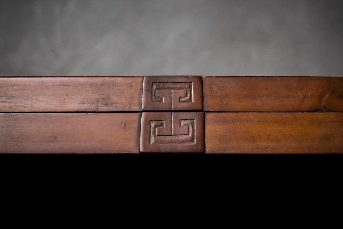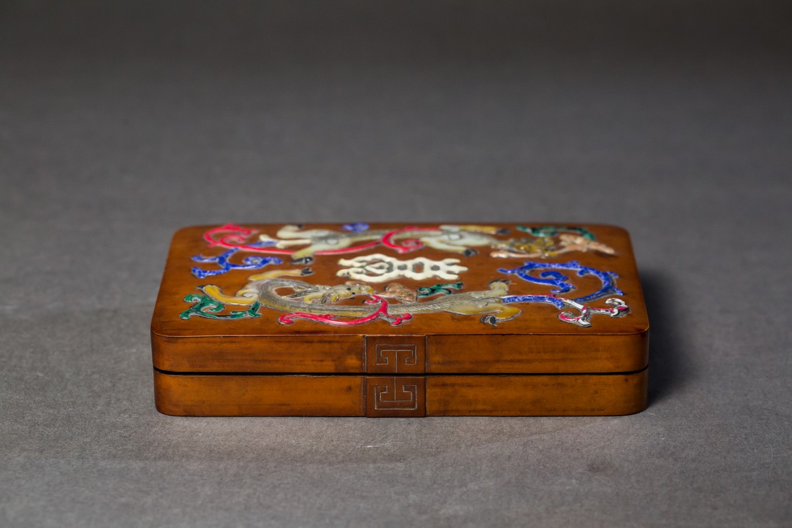 Each plaque carved with two character Zhai Jie, flanked by pair of confronting phoenix heads to the top and bottom, fitted in Huangyangmu box inlaid to depict pair of sinuous chilong dragons. Qing Dynasty period.