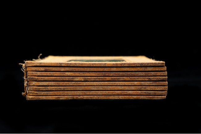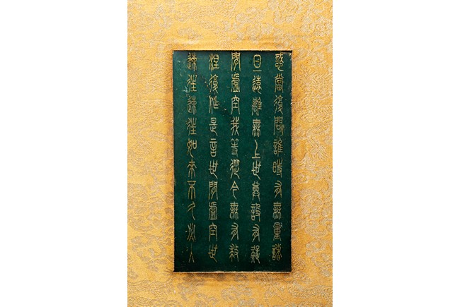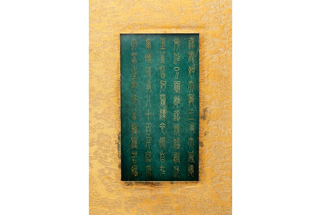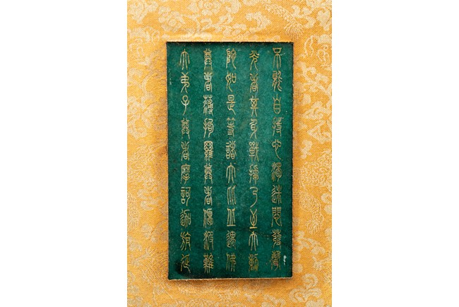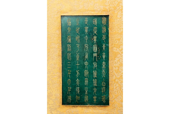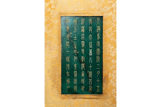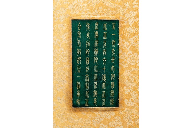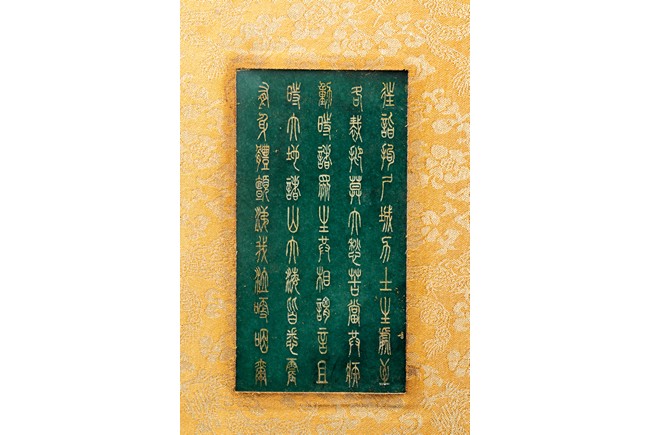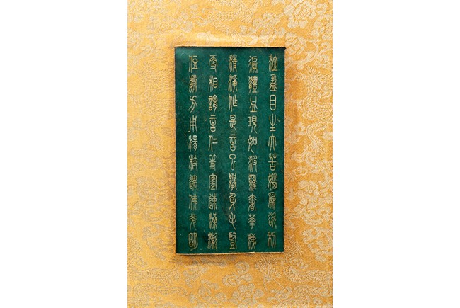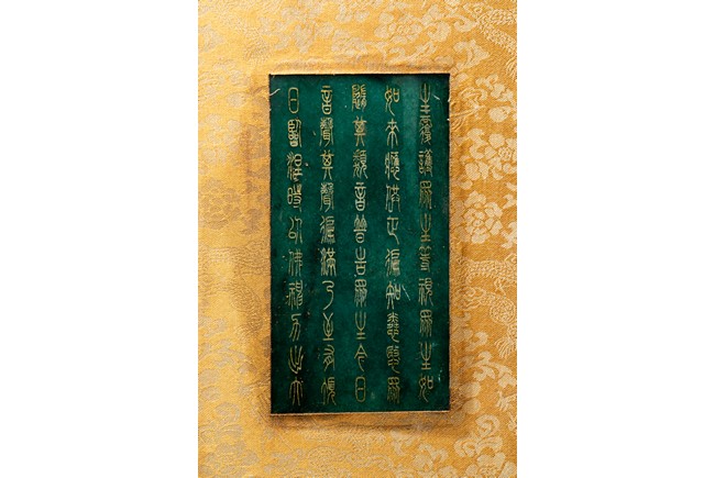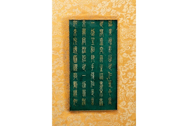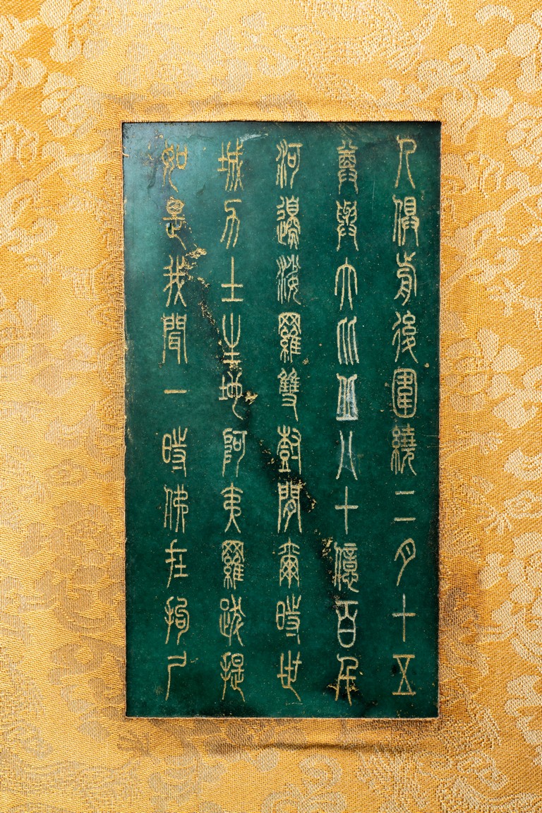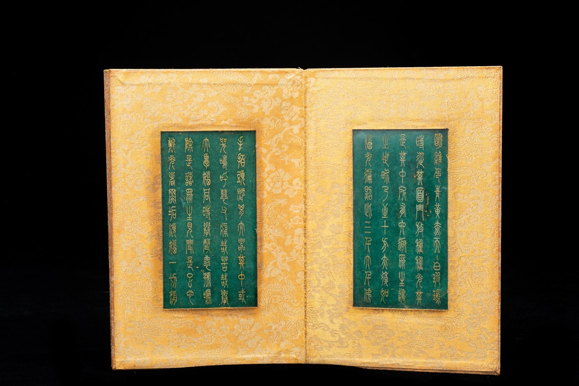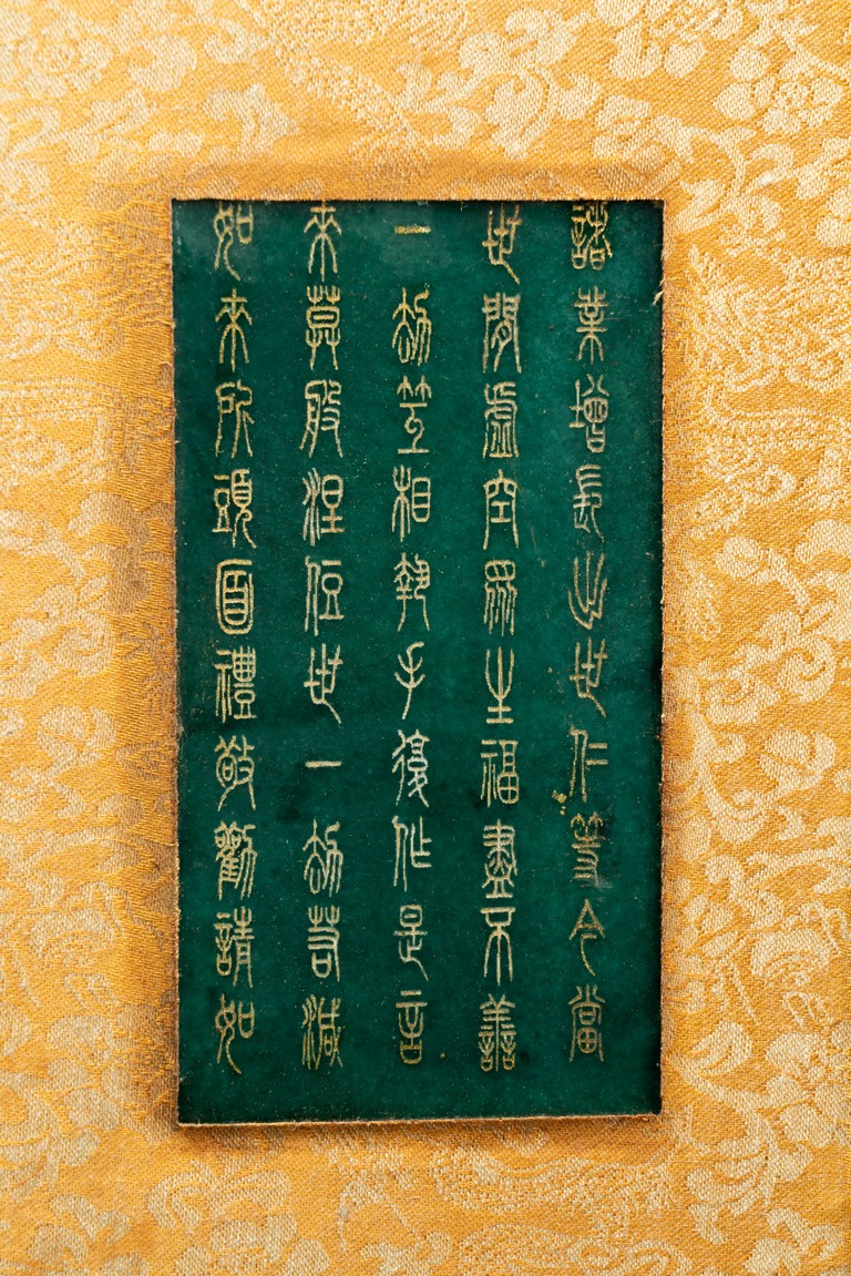 碧玉製成,共八片,從每片的呈色分佈來看,顯然為同塊和闐山料玉剖解而成。每片正背二面,均陰刻文字或圖案。首面左右陰刻龍紋,威武霸氣,中間帶框書“大本涅槃經”,下飾海水江。其餘均填金陰刻其內容,字跡排列規矩,工整大方。尾面填金陰刻文殊菩薩,文殊頭戴五葉寶冠,柳葉眉,杏眼細長,挺鼻小嘴,雙耳垂於肩上,左手持劍,右手持蓮,安坐於蓮瓣之上。圖騰與文字鐫刻細膩,流線順暢,猶如用筆直接寫在玉片之上。十分難得。來源: 德州達拉斯私人收藏 Provenance: From a private collection in Dallas, Texas