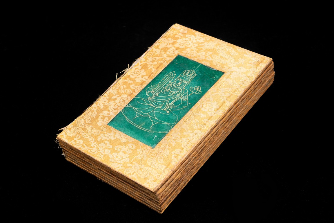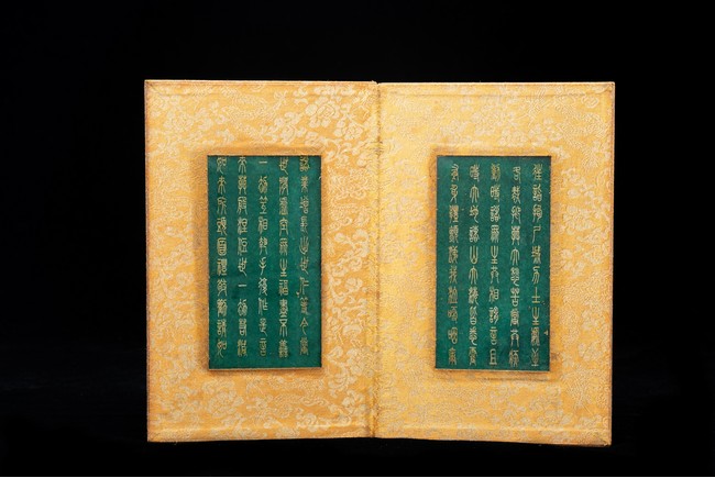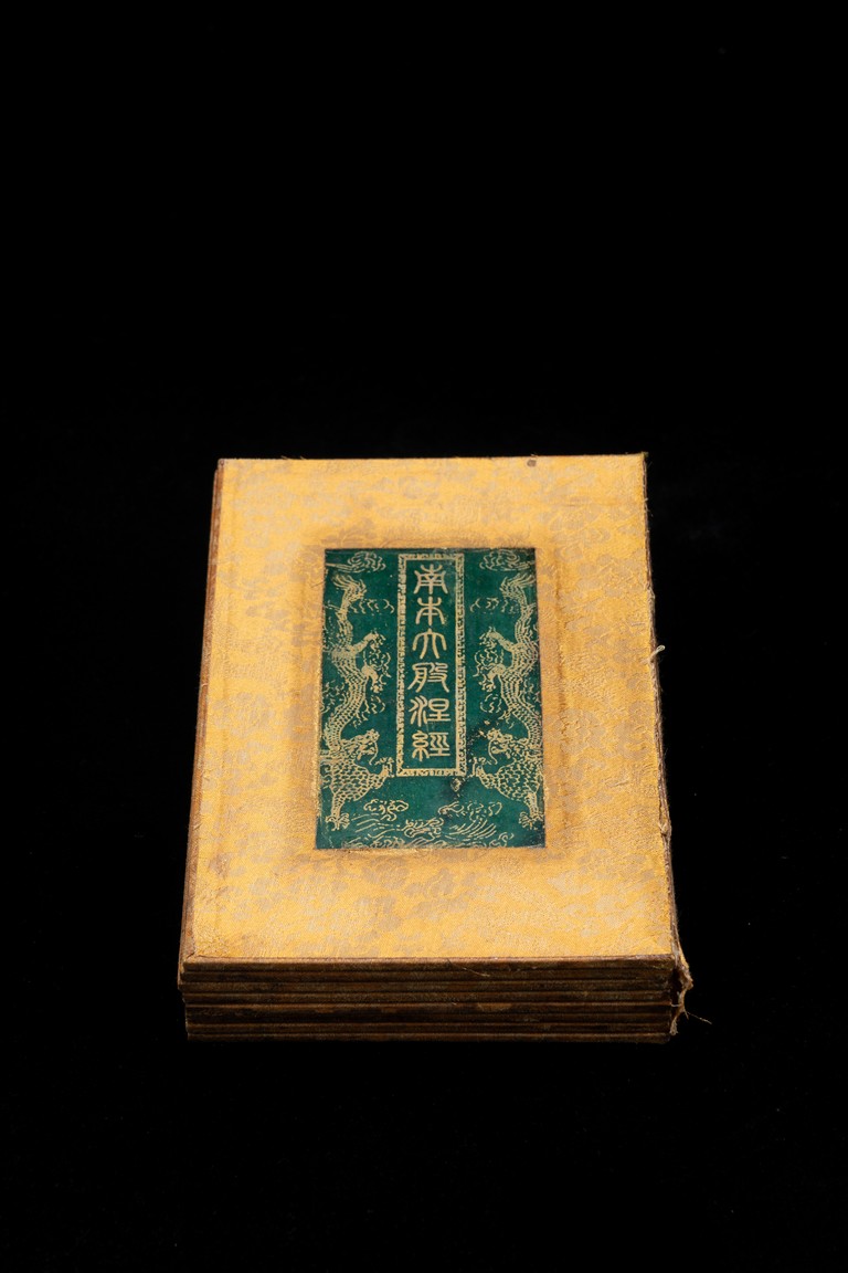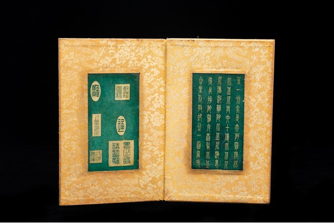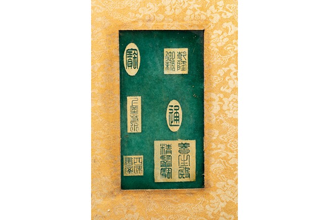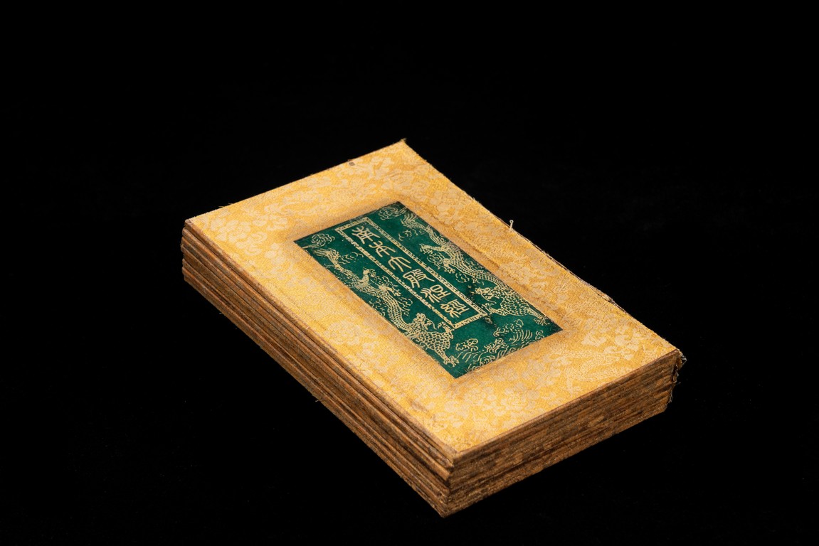 Chinese. Comprising eight panels inscribed with imperial marks and buddhist script in seal scripts , bound silk cloth. Late Qing Dynasty period or later.