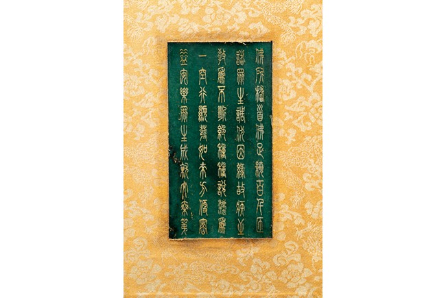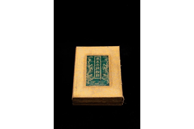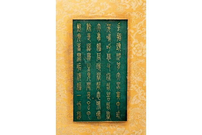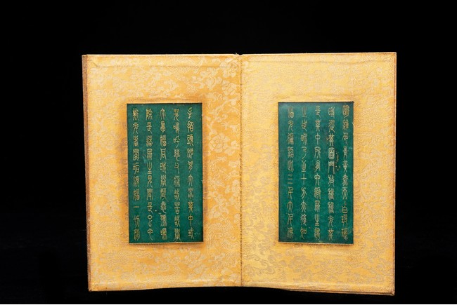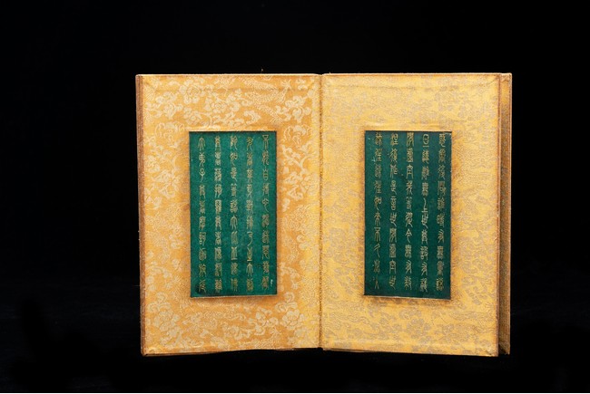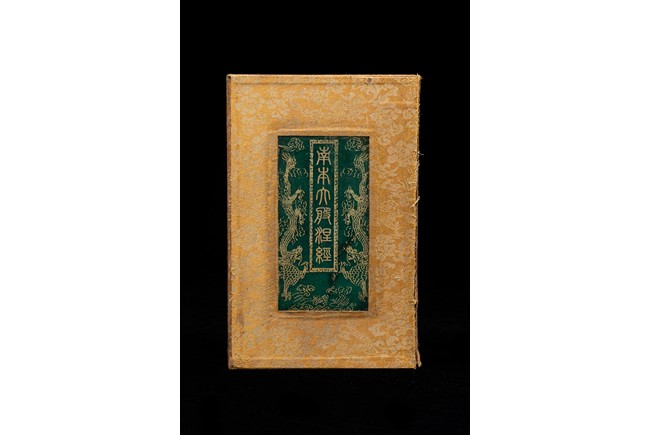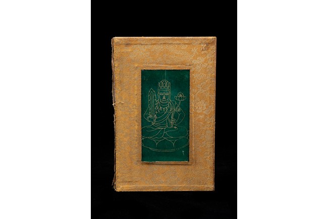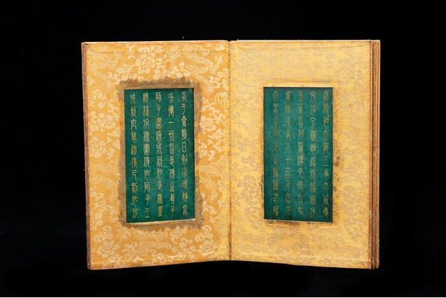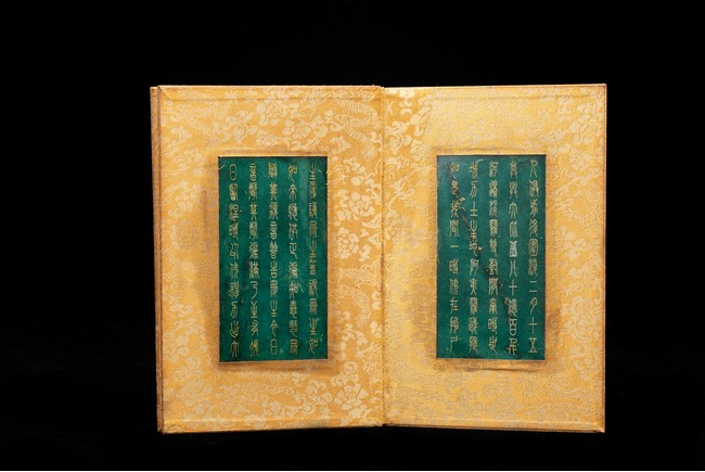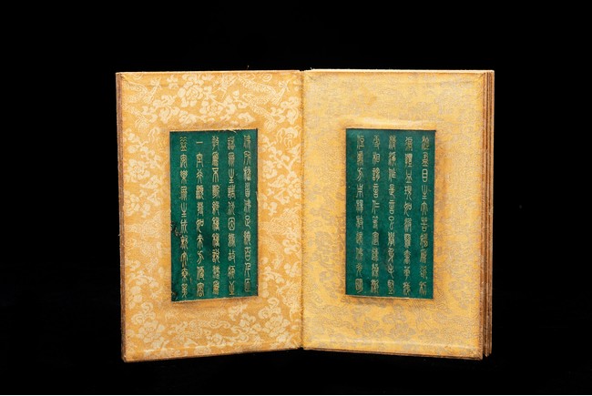 Chinese. Comprising eight panels inscribed with imperial marks and buddhist script in seal scripts , bound silk cloth. Late Qing Dynasty period or later.