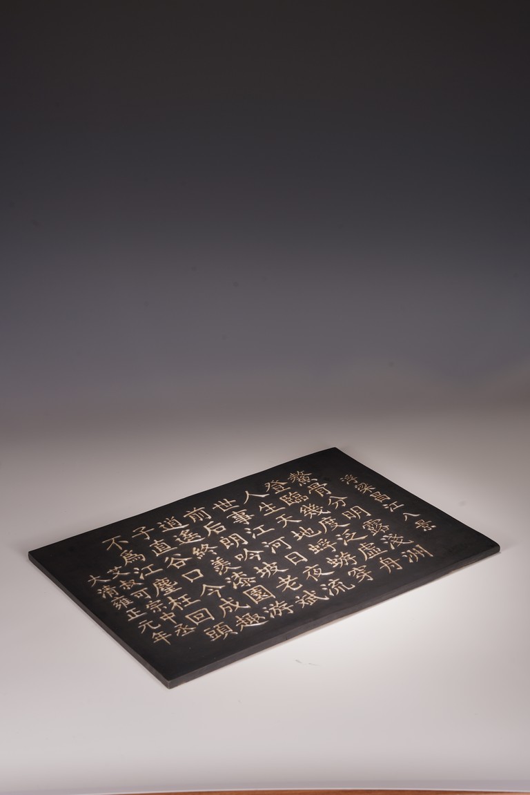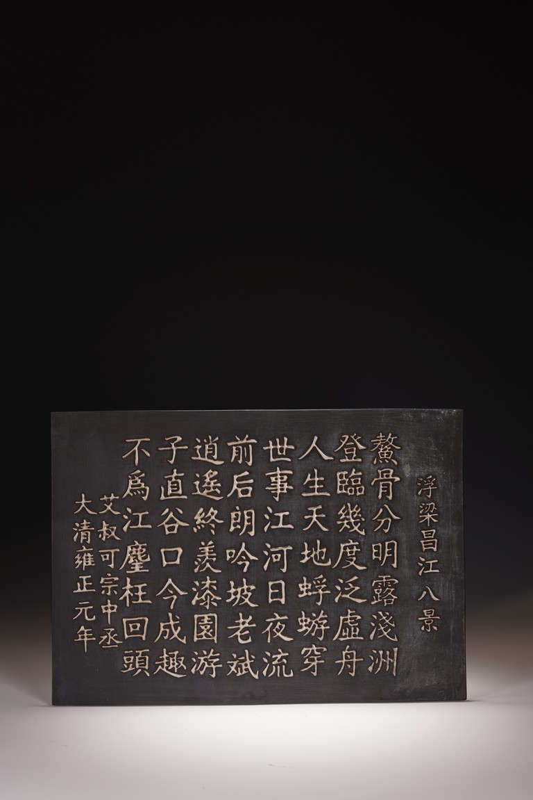 瓷板以黑漆為地,用白釉雕寫詩句,其製作之奇特,常人知之甚少。白釉溫潤如玉,與之形成鮮明對比,更能凸顯主題。由於字形結構不一,寬窄厚薄不均,燒成過程極容易變形窯裂,本品卻十分完好。本器字體規整,行筆遒勁灑脫,文氣十足。 “鰲骨分明露淺洲,登臨幾度泛虛舟。人生天地蜉蝣穿,世事江河日夜流。前後朗吟坡老賦,逍遙終羨漆園遊。子真谷口今成趣,不為紅塵枉回頭。 ”“艾叔可宗中丞”“大清雍正元年”。