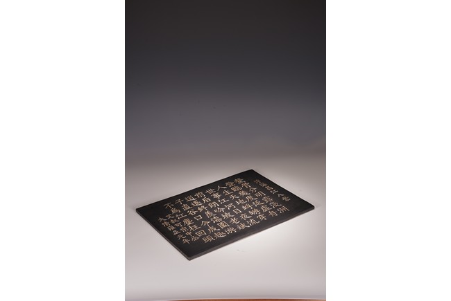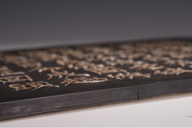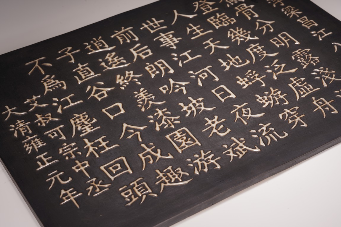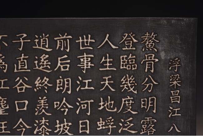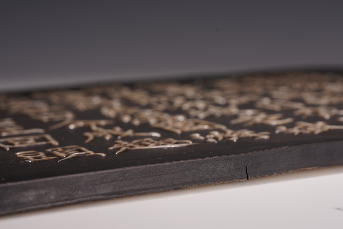 The wall panel is of rectangular form, with a black tone ground, applied in eleven vertical lines with the regular script inscription, each character cast in white glaze ceramic, signature dated to first year of Yongzheng reign.