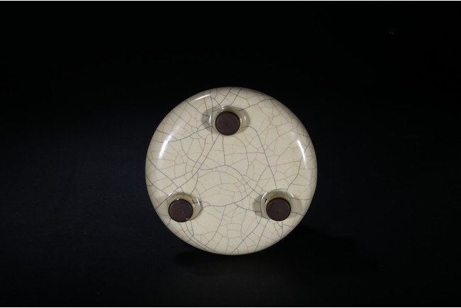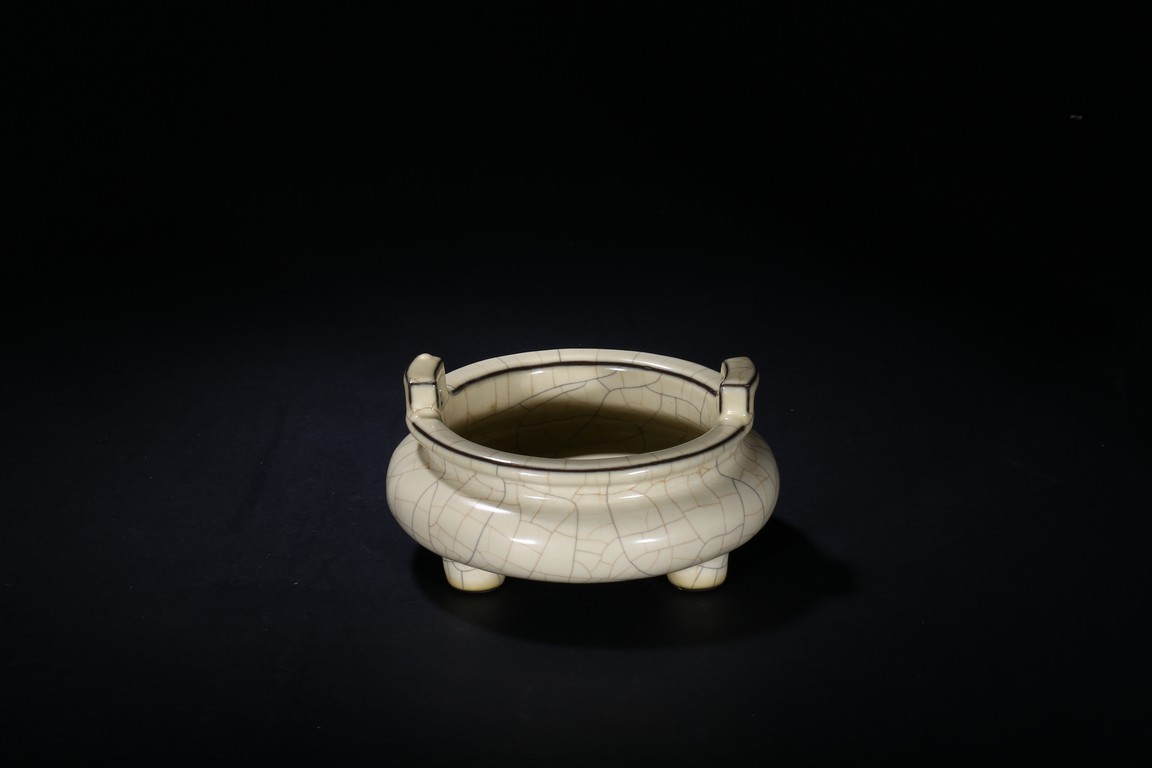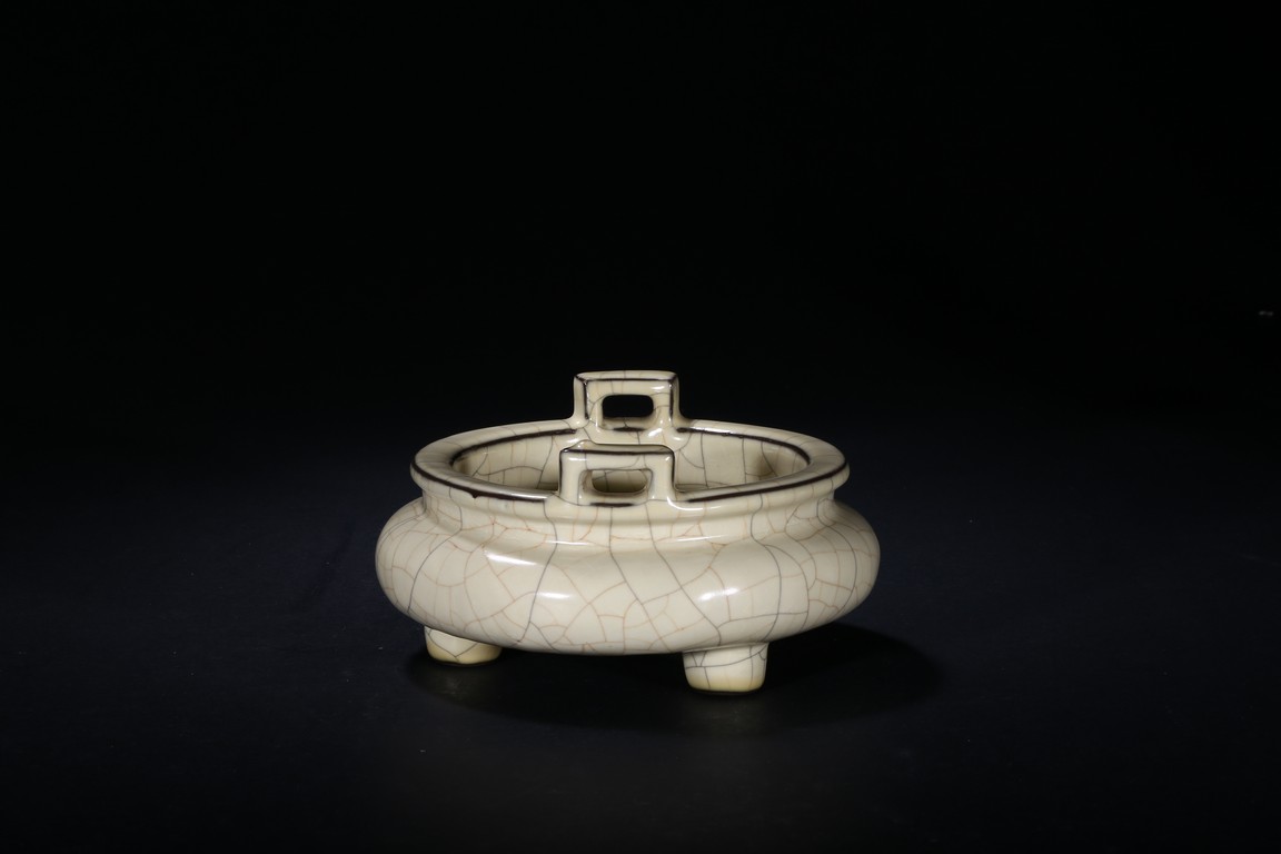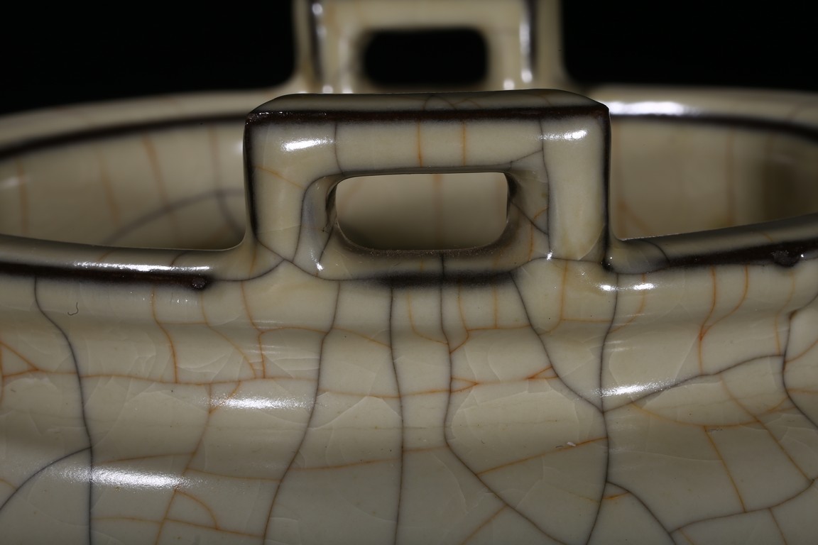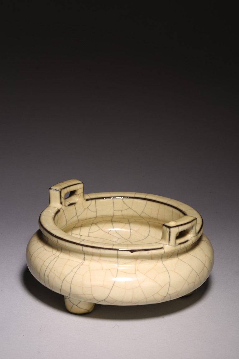 of compressed circular form, the shallow sides rising to an everted rim, set to either side with a pair of upright lug handles, all supported on three short tapering feet, the rounded base with circular recess at the center, covered overall in an opaque pale gray glaze suffused with a network of crackles in simulating the 'iron wire' and 'gold thread' of Song dynasty Guan ware.Qing Dynasty period.