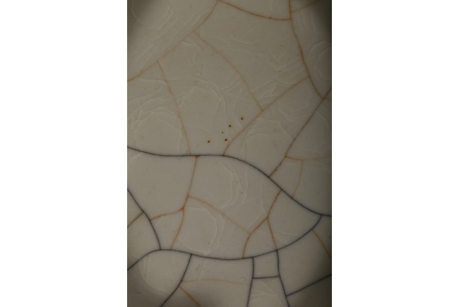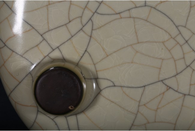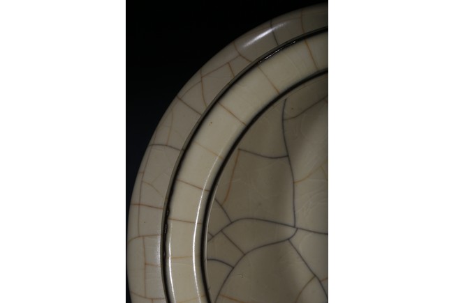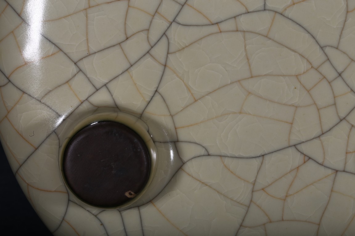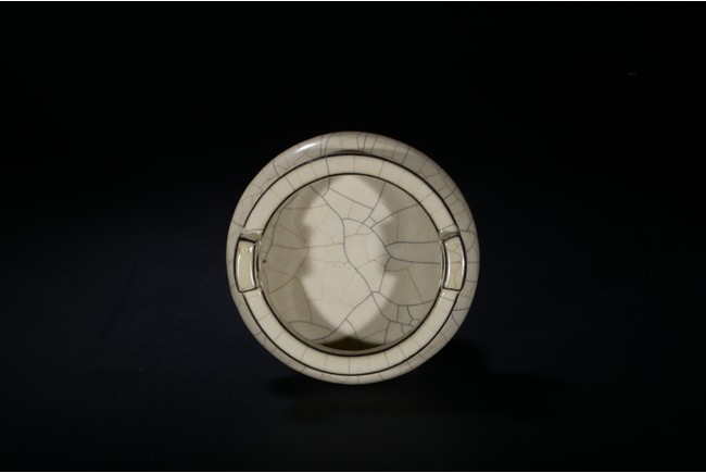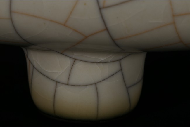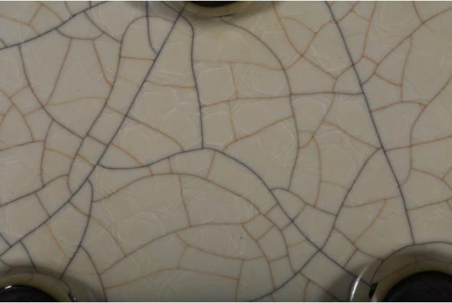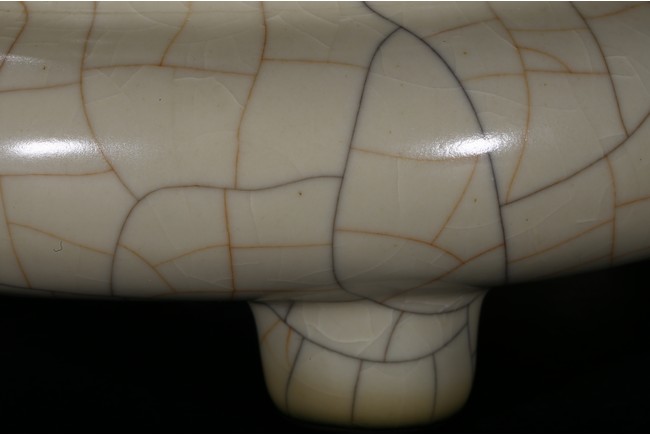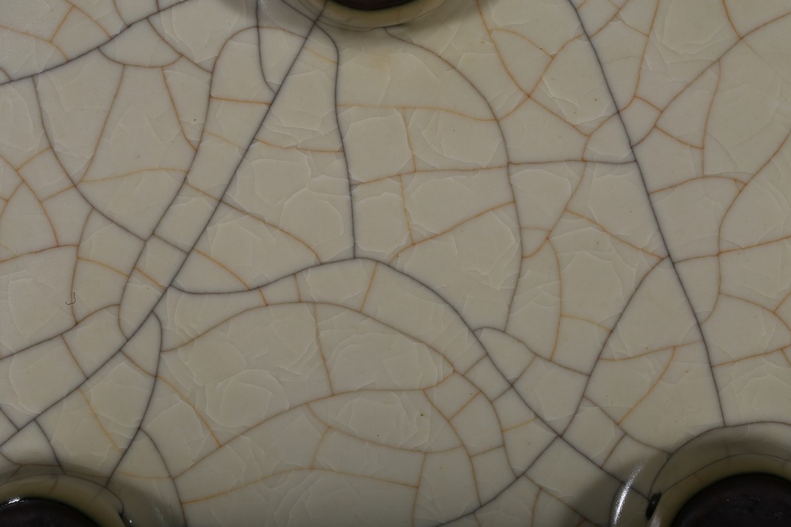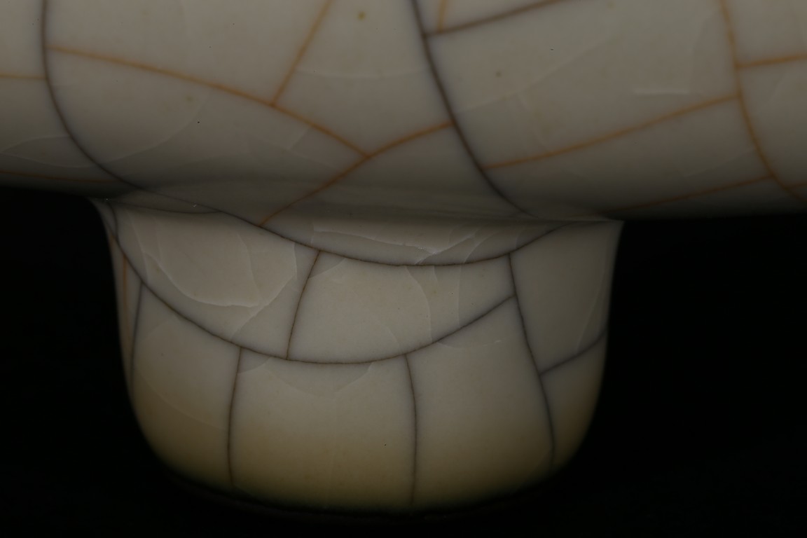 of compressed circular form, the shallow sides rising to an everted rim, set to either side with a pair of upright lug handles, all supported on three short tapering feet, the rounded base with circular recess at the center, covered overall in an opaque pale gray glaze suffused with a network of crackles in simulating the 'iron wire' and 'gold thread' of Song dynasty Guan ware.Qing Dynasty period.