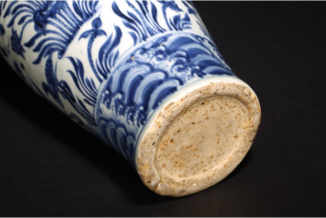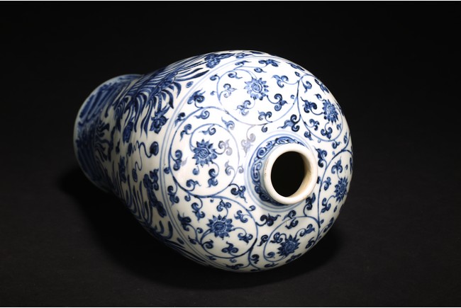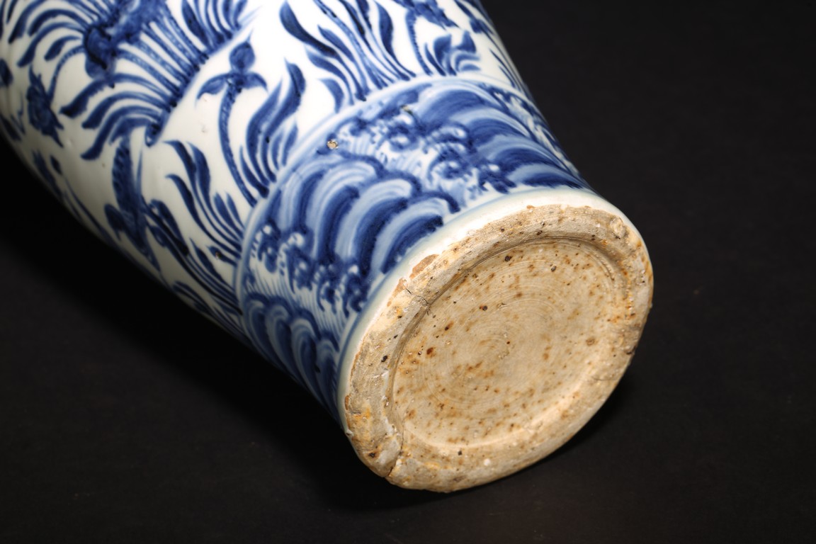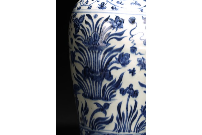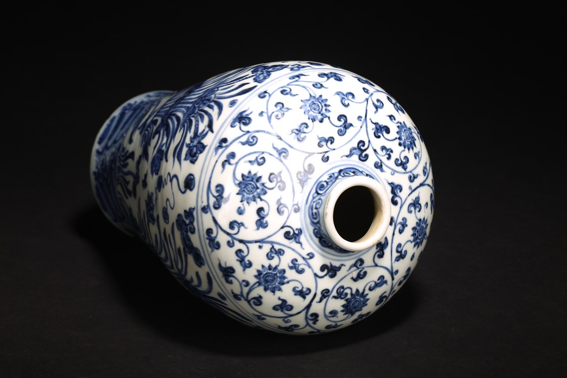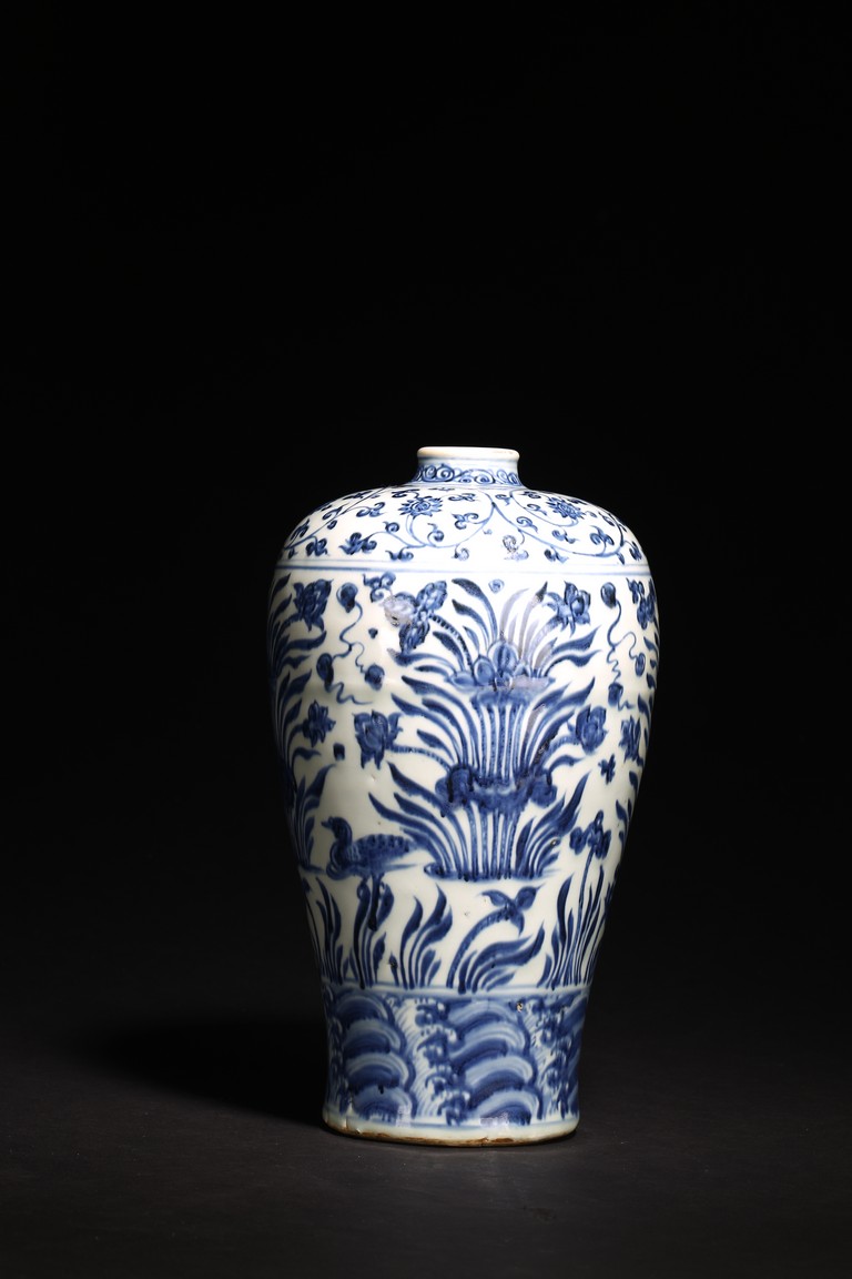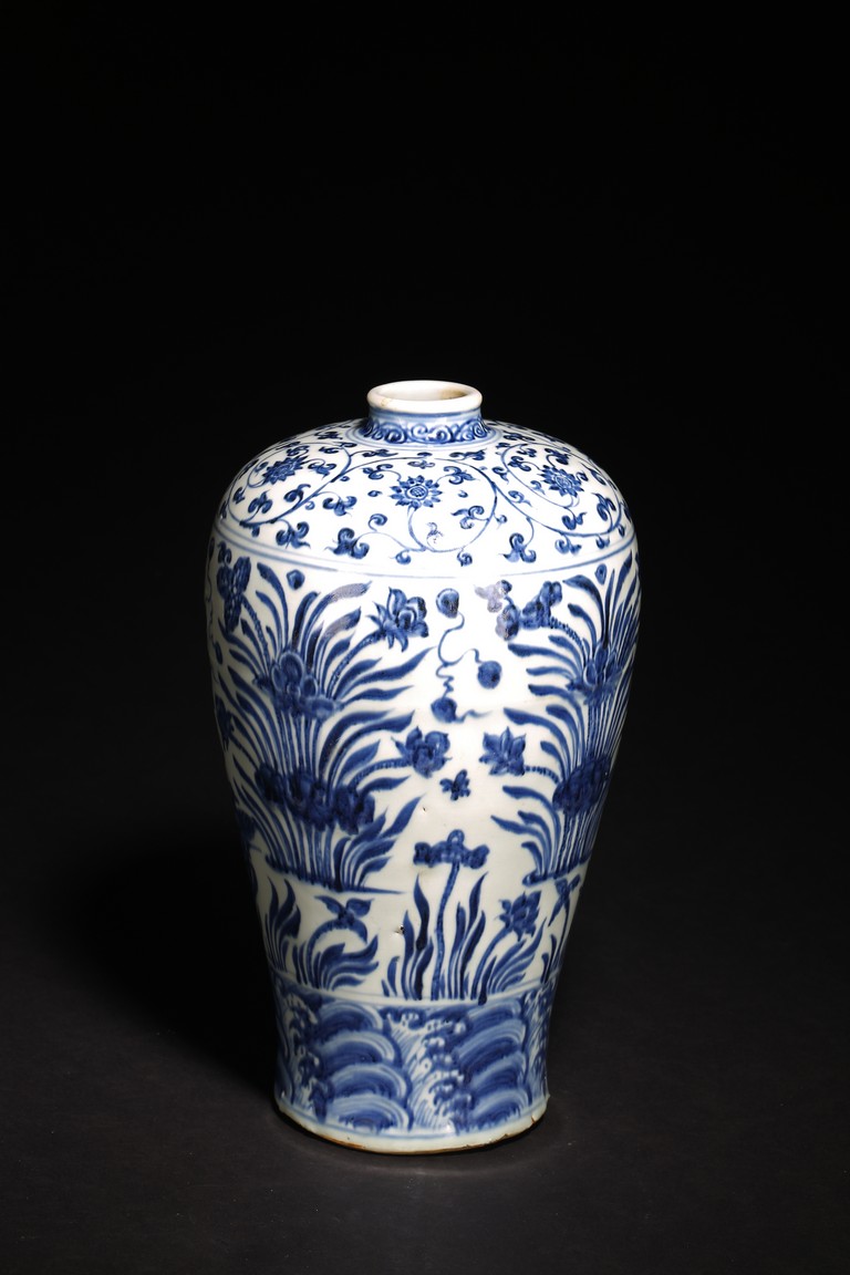 梅瓶是中國傳統瓷器造型,始見於唐,盛行於宋金,元後延盛。梅瓶出現之初是作儲酒器皿,因造型雅緻,逐漸發展成為陳設花器。本器小口短頸,豐肩弧腹,脛部內斂,圈足微外撇,胎體細膩潔白,造型規整,比例和諧,俊秀穩重,端莊大方。器身青花繪“卷草紋”“纏枝花卉紋”“水仙花紋”“海水紋”,枝繁葉茂,佈局嚴謹,繪畫流暢自然。來源: 北加州私人珍藏 Provenance: From a private collection in Northern California