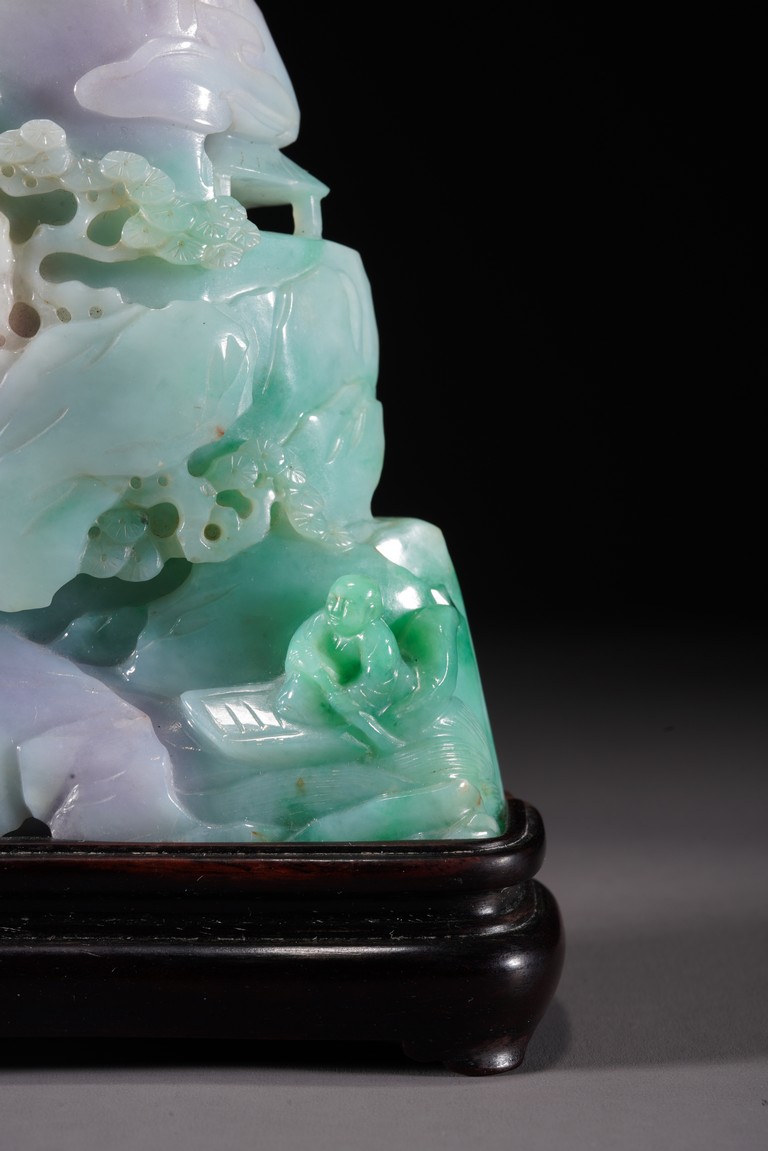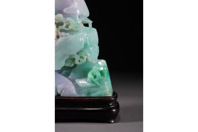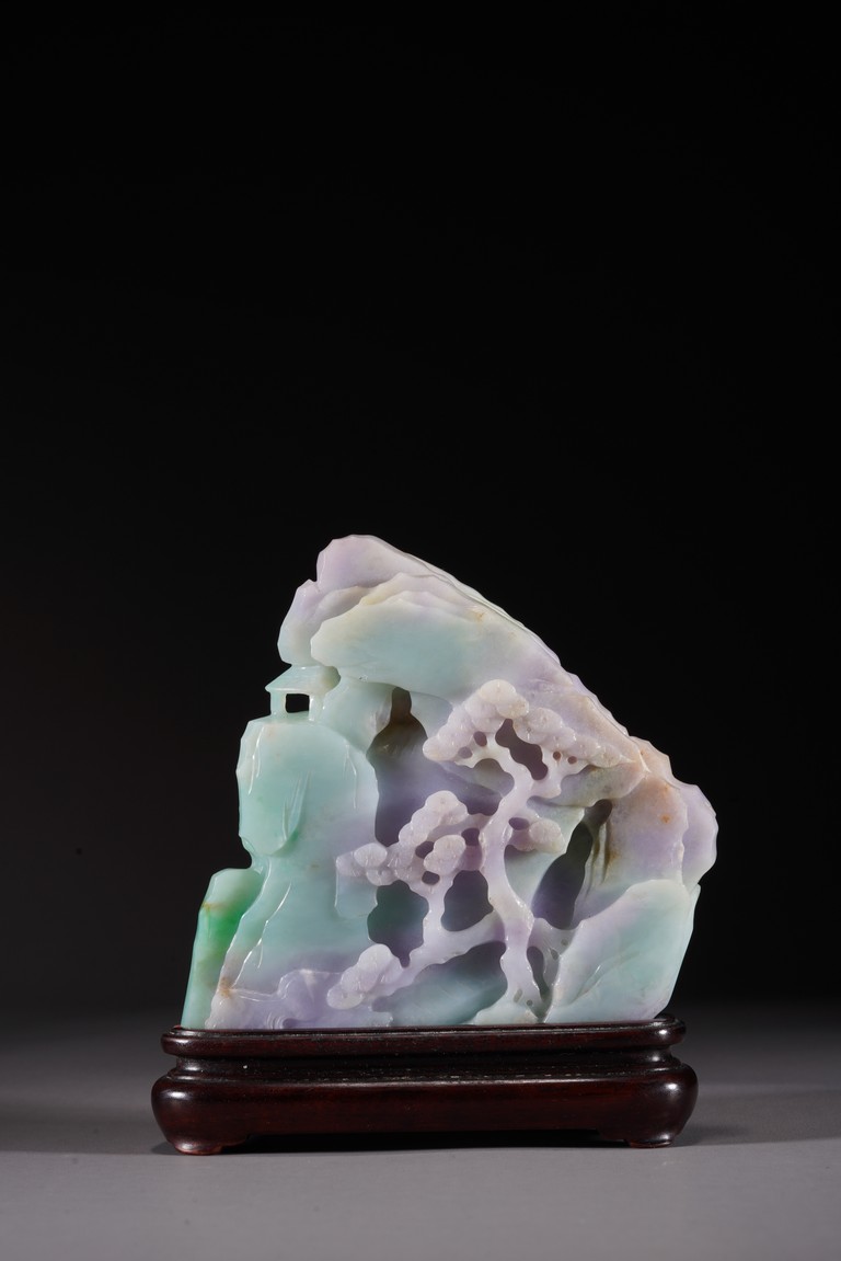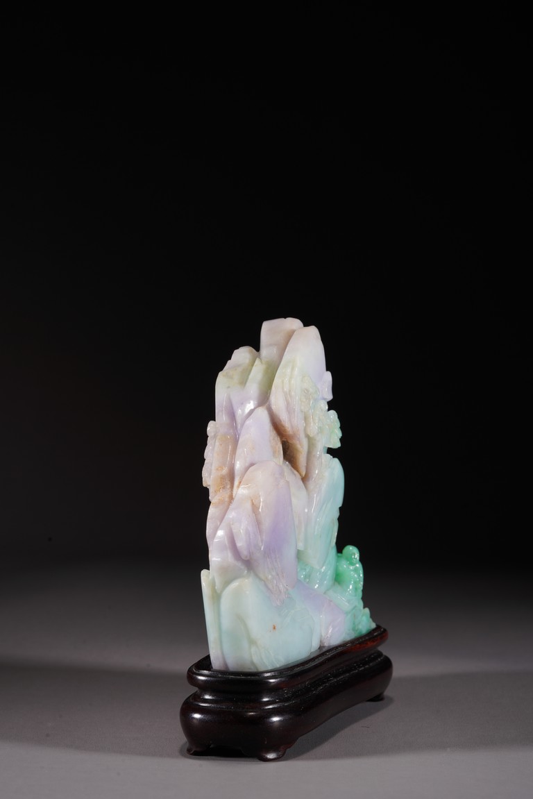 翡翠山子擺件,水頭好,綠色濃艷,料子體量適中,山水、人物、小獸雕鑿精美,帶木質底座,畫面佈局埸景設計均屬上乘,翡翠多以製作手飾為主,能取大料質好者做山水擺件的極少,不是宮庭官家難以擁有,可見其珍貴。