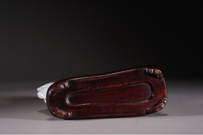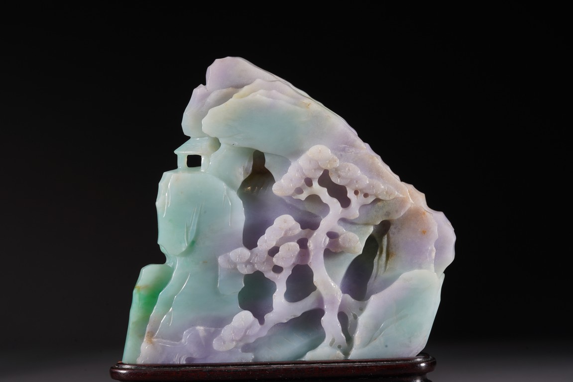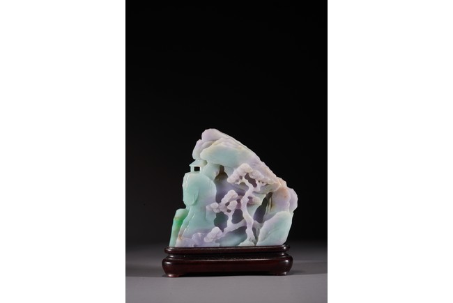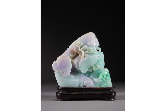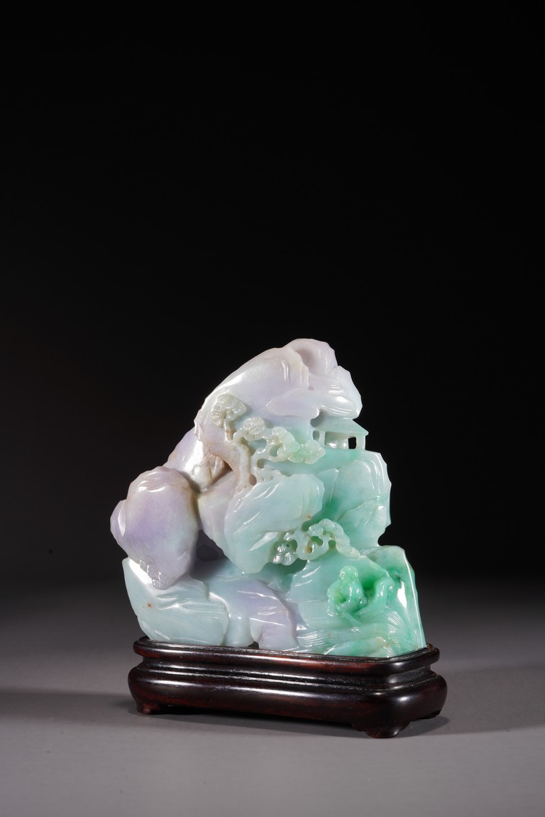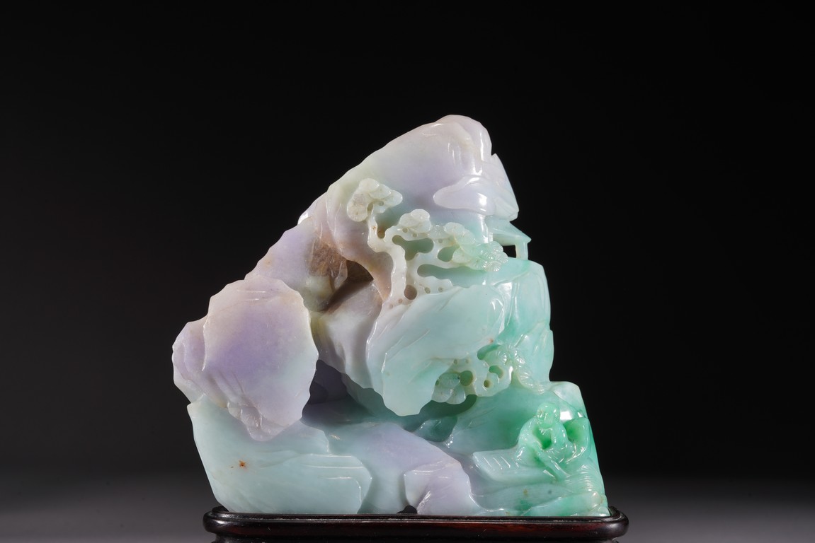 翡翠山子擺件,水頭好,綠色濃艷,料子體量適中,山水、人物、小獸雕鑿精美,帶木質底座,畫面佈局埸景設計均屬上乘,翡翠多以製作手飾為主,能取大料質好者做山水擺件的極少,不是宮庭官家難以擁有,可見其珍貴。