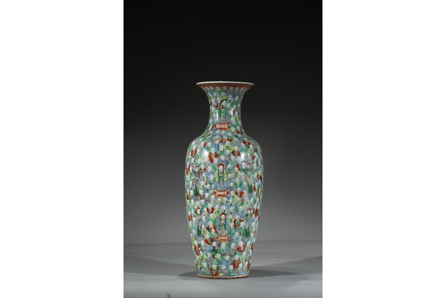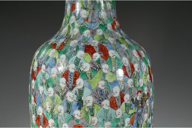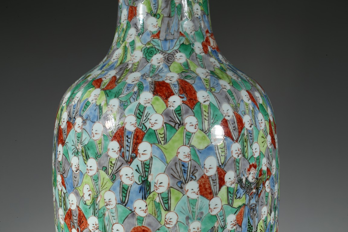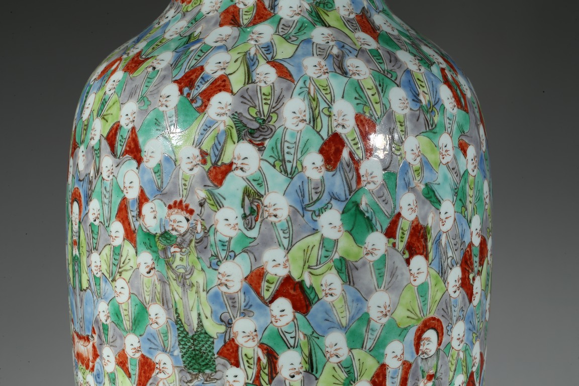 此五彩觀音瓶,束頸、豐肩、修腹、斂足。觀音瓶創燒、流行於康、雍間,器形雋雅高貴,釉面素潔溫潤,線條舒展柔美,工藝精湛細緻而無造作之痕,為康熙時期內府花器的上品。瓶身以五彩裝飾為基礎,採用通景式構圖方法勾勒出一百零八羅漢紋飾,紋樣富麗,著色豐富,歎為觀止。整器紋飾著色豐富,以敷彩濃艷的紅、黃 藍、綠為主色,間以赭、紫、黑等色,衣紋、雲彩更施以金彩,使畫面呈現出富麗吉祥之感。題材中人物描寫精到,眉毛、眼珠和頭髮鬍鬚用黑色勾勒,面部膚色也因人而異,不同神情,清晰可見。底部“大雄寶殿”款識,在佛教寺院中,大雄寶殿是供奉佛像的正殿。大雄寶殿是整座寺院的核心建築,也是僧眾朝暮集中修持的地方。