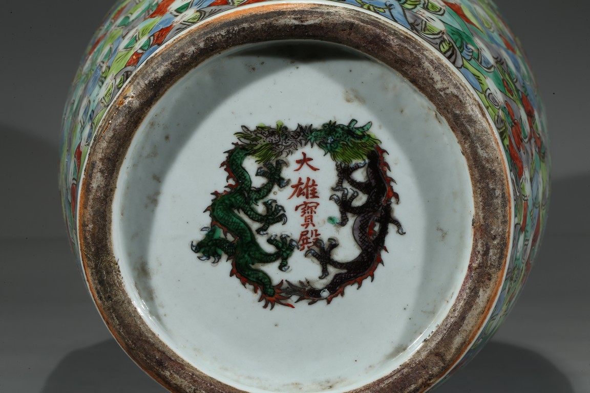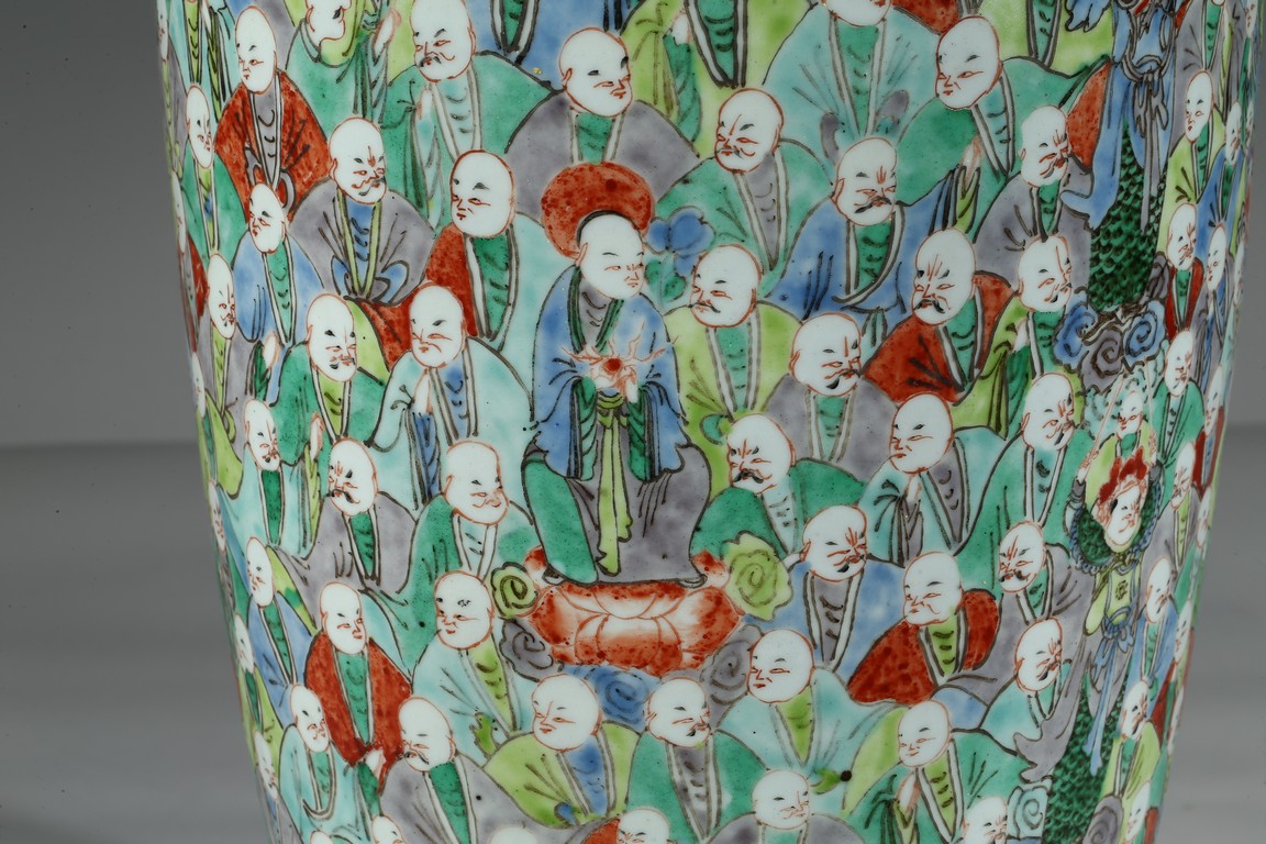 Of tall tapering form, the body exterior densely enamelled with five hundreds arhats wearing colorful robes, all below a band of ruyi pattern around the mouth rim, the base inscribed with a four character 'Da Xiong Bao Dian' mark flanked by two opposing dragons. Qing Dynasty Period.