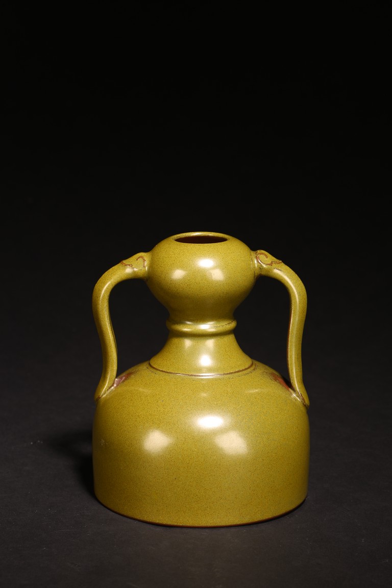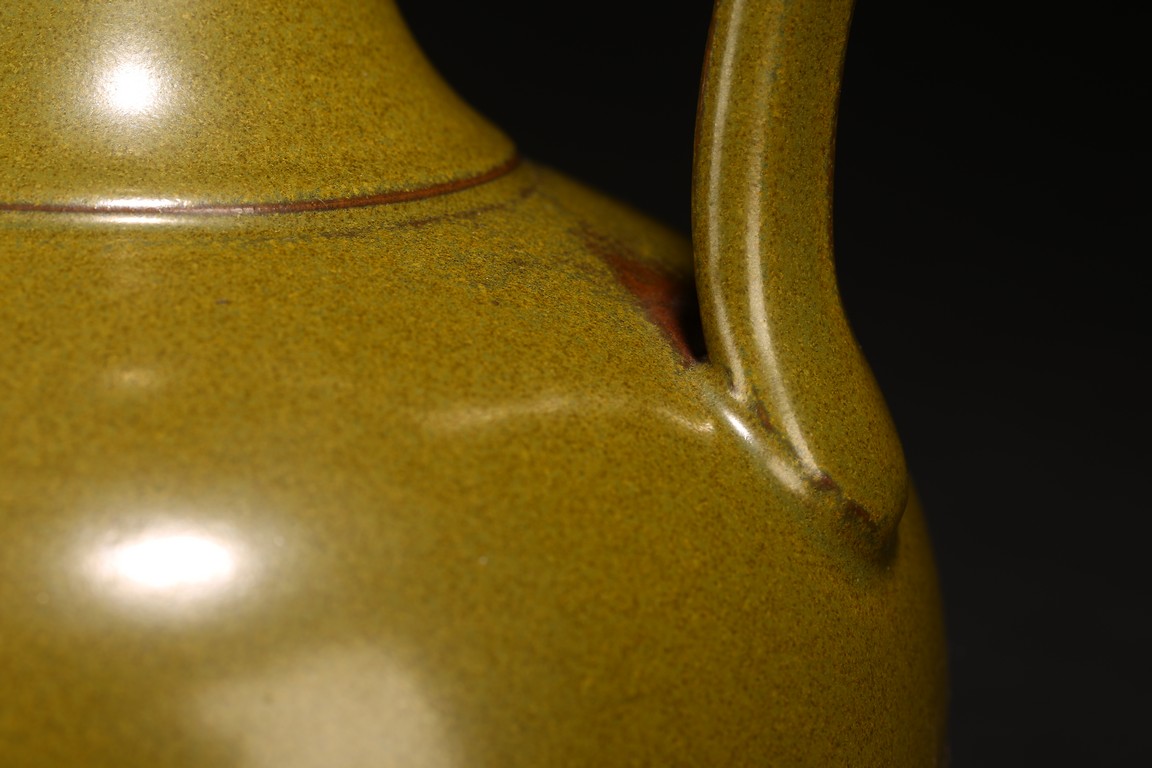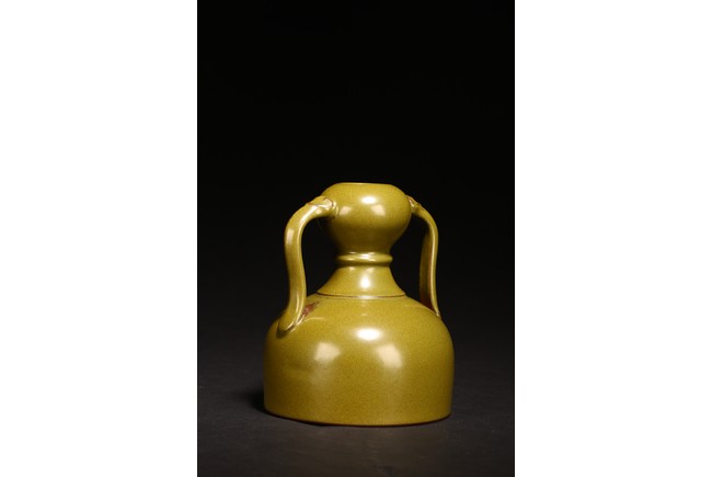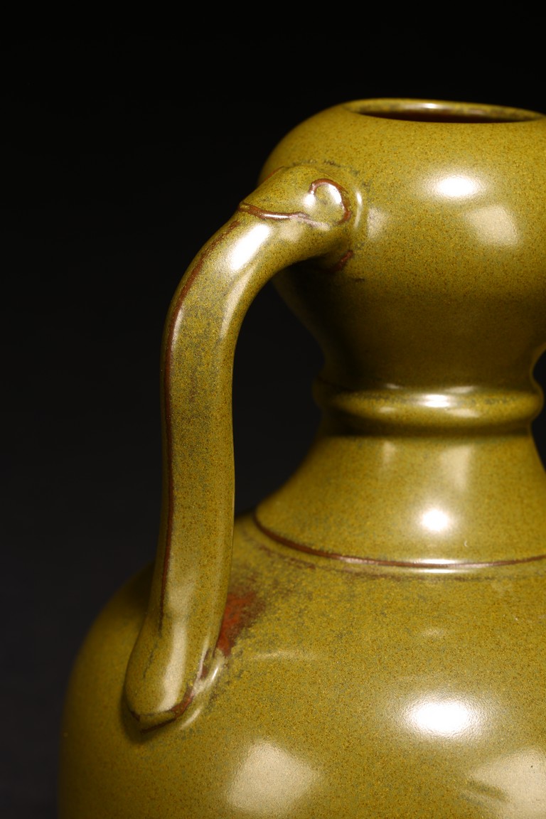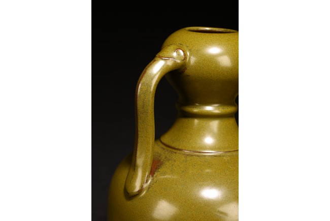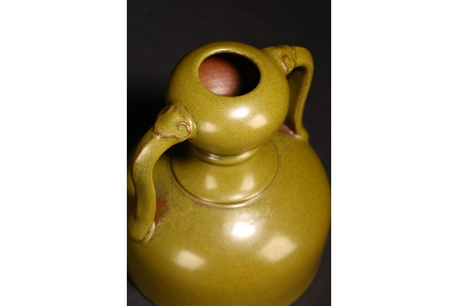 如意耳瓶,舊稱如意尊,為雍窯新出器樣。本器因肩、腹所蝕對稱綬帶耳形似如意,故稱「如意尊」。蒜頭形口,束頸,頸凸起弦紋,半圓型腹,圈足。器身滿施“茶葉末”釉色,顏色偏黃綠,滋潤細膩,其中夾雜著的黃黑色細小斑粒燦若晨星。圈足胎、釉交接處為深褐色,為早期茶葉末典型特徵。來源: 德州達拉斯私人藏家提供 Provenance: Property from a Dallas, Texas private collection