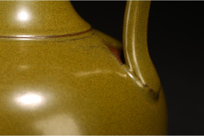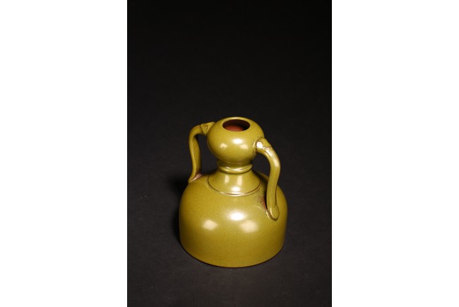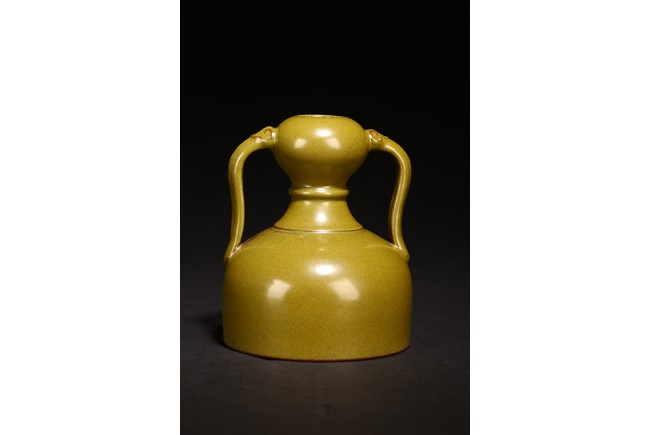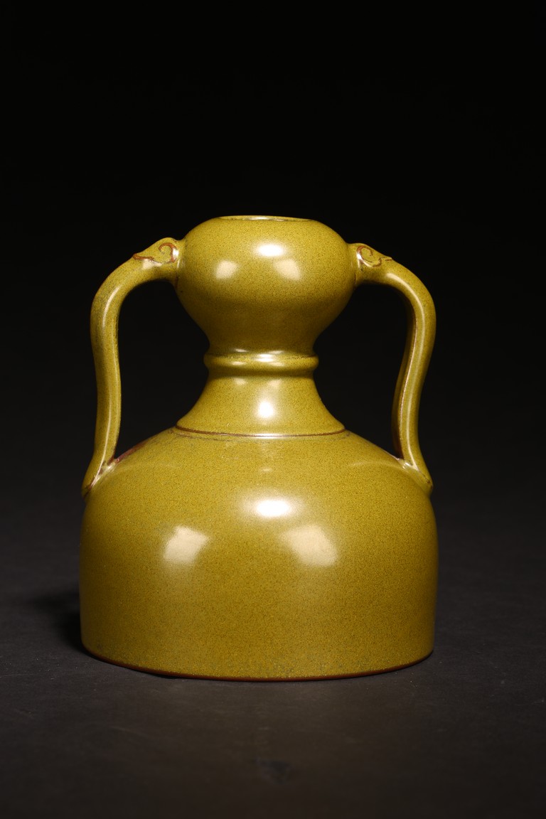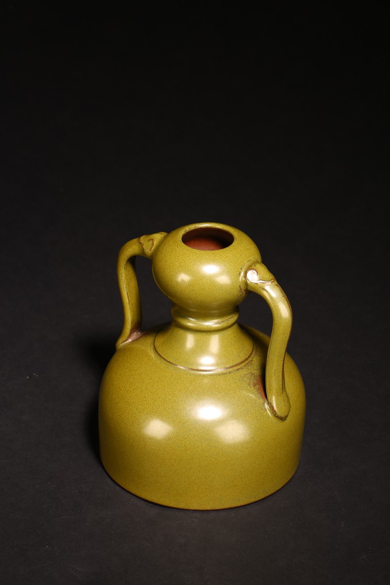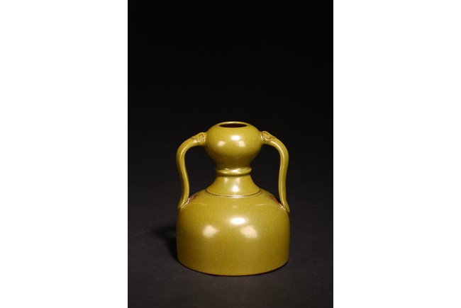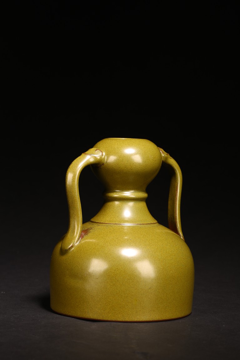 如意耳瓶,舊稱如意尊,為雍窯新出器樣。本器因肩、腹所蝕對稱綬帶耳形似如意,故稱「如意尊」。蒜頭形口,束頸,頸凸起弦紋,半圓型腹,圈足。器身滿施“茶葉末”釉色,顏色偏黃綠,滋潤細膩,其中夾雜著的黃黑色細小斑粒燦若晨星。圈足胎、釉交接處為深褐色,為早期茶葉末典型特徵。來源: 德州達拉斯私人藏家提供 Provenance: Property from a Dallas, Texas private collection