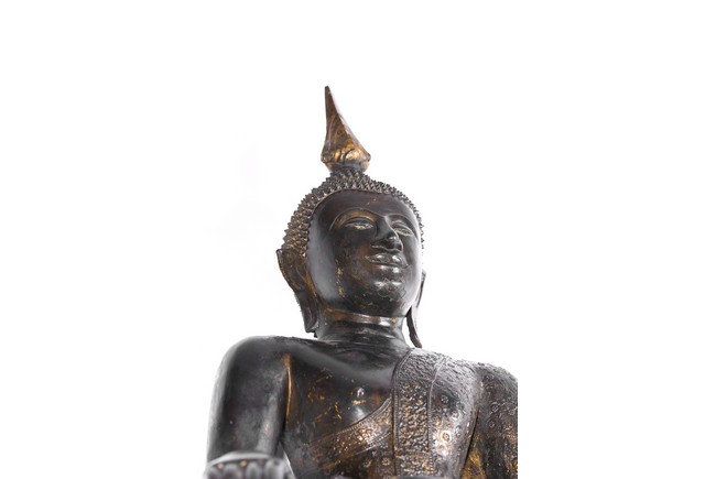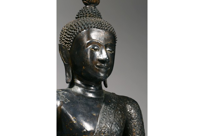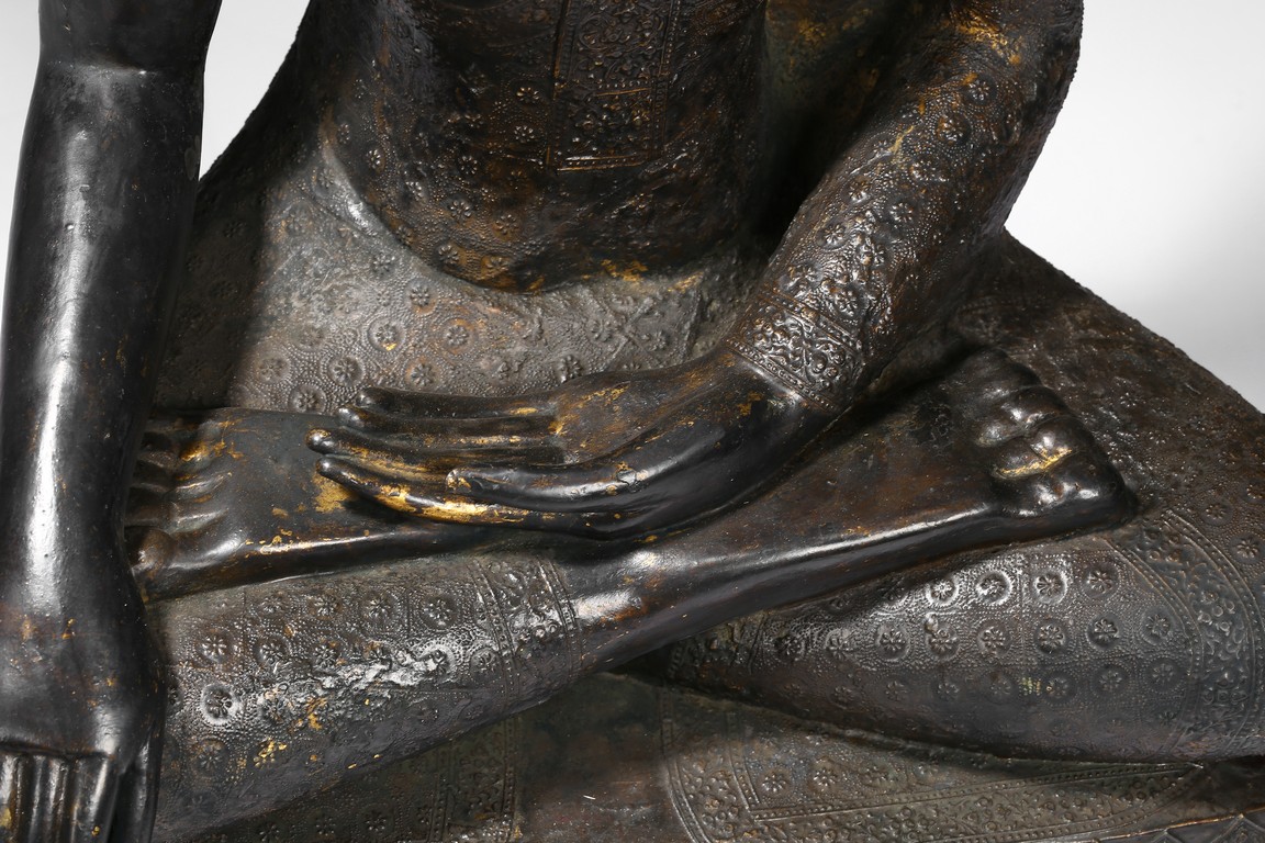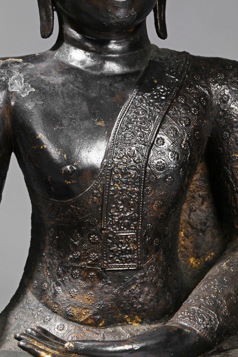 "Sukhothai Kingdom. The Buddha is depicted seated on a elegantly stepped throne, his right hand placed in bhumisparsa mudra, the "earth-touching" gesture, his monastic robes covering one shoulder, the face with a meditative expression and the hair rising to form an usnisha topped with a jar-shaped finial, body overall with traces of gilt. 14th century. "