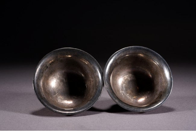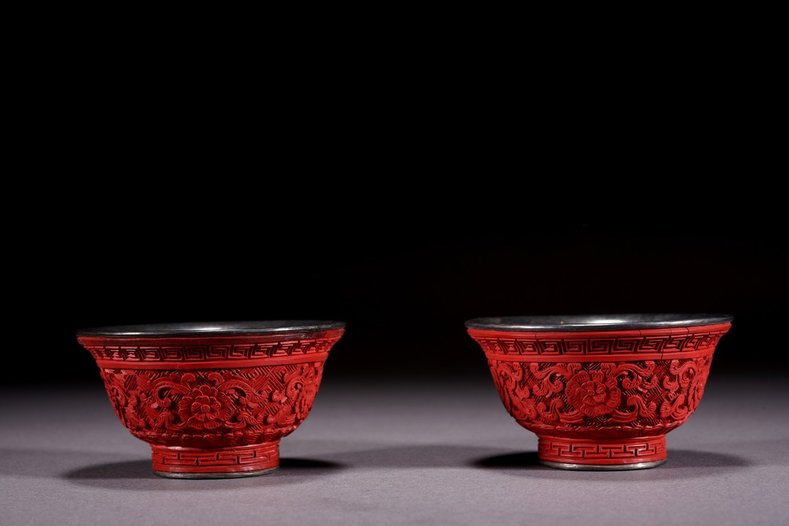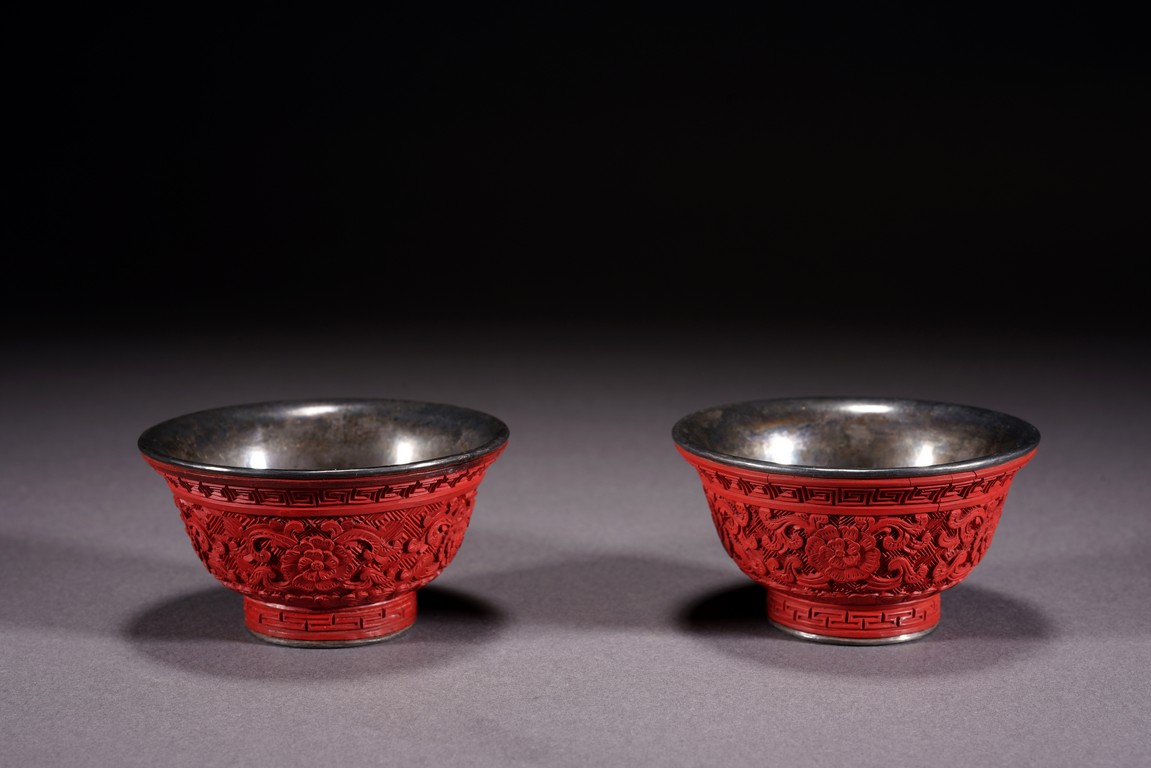 此杯成對,內膽為純銀材質,外壁為剔紅工藝,撇口與圈足處均為迴紋裝飾,周身花卉紋飾,刀工精湛細膩,色澤朱紅可人,成對保存完整,不可多得。