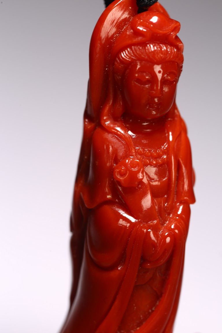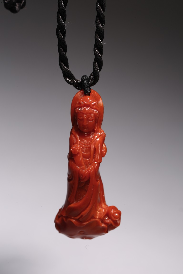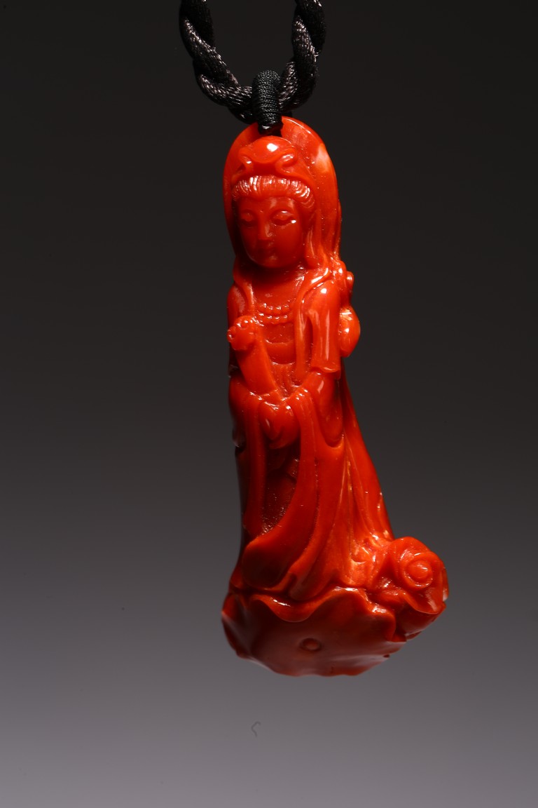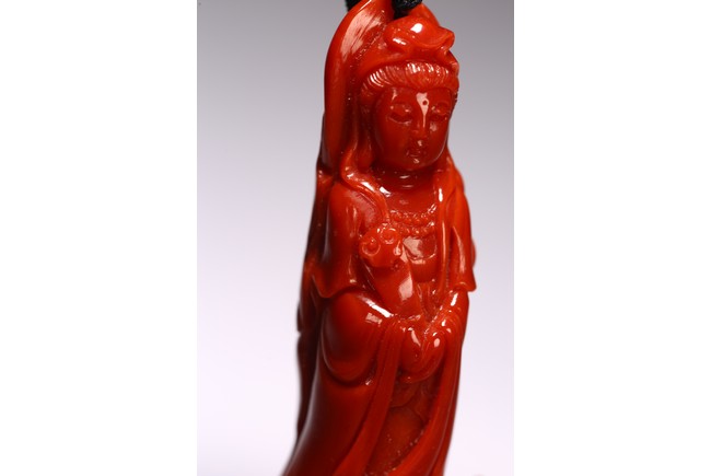 The Aka coral carved in the form of buddhist female immortal Guanyin, holding a ruyi scepter, the face with meditative expression, overall with deep opaque red tone. 20th century.