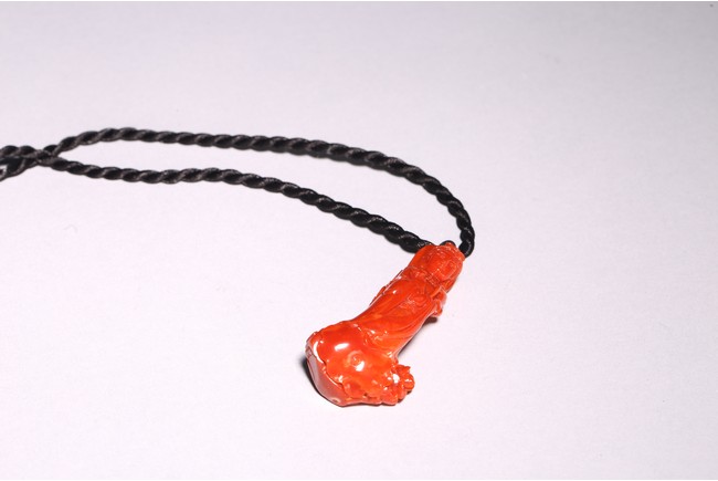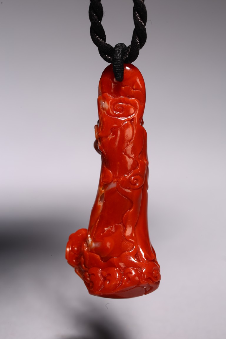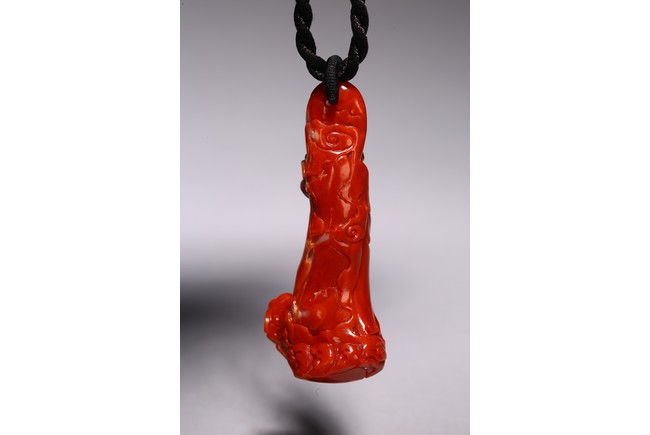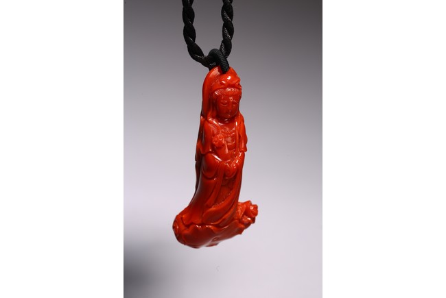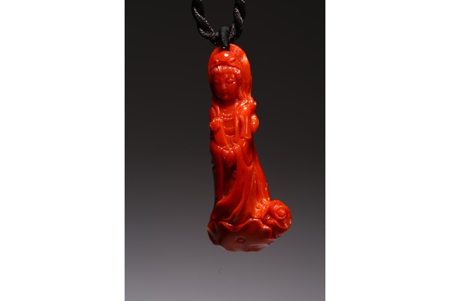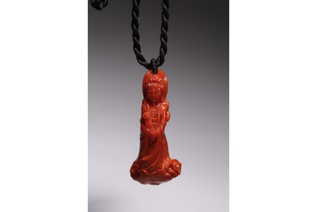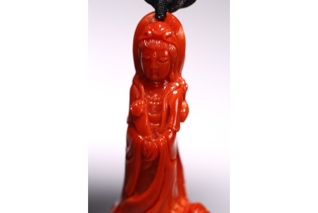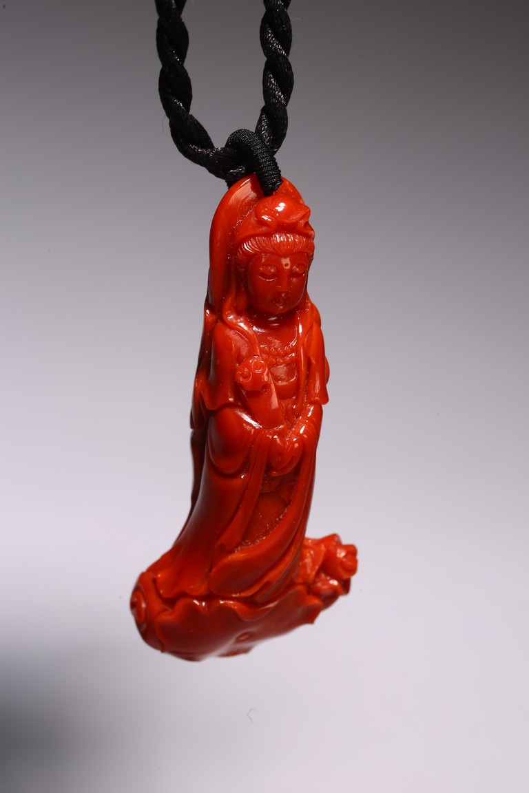 The Aka coral carved in the form of buddhist female immortal Guanyin, holding a ruyi scepter, the face with meditative expression, overall with deep opaque red tone. 20th century.