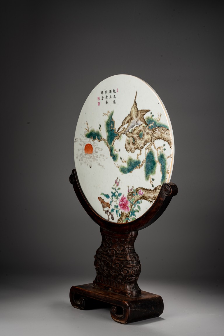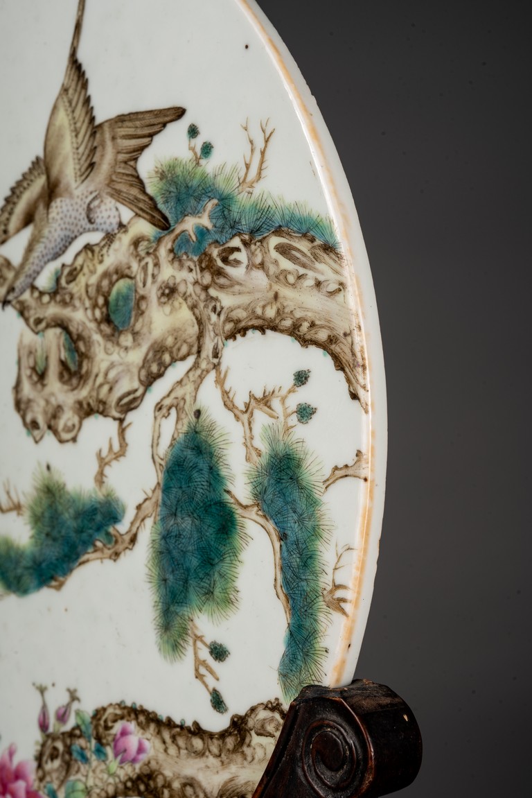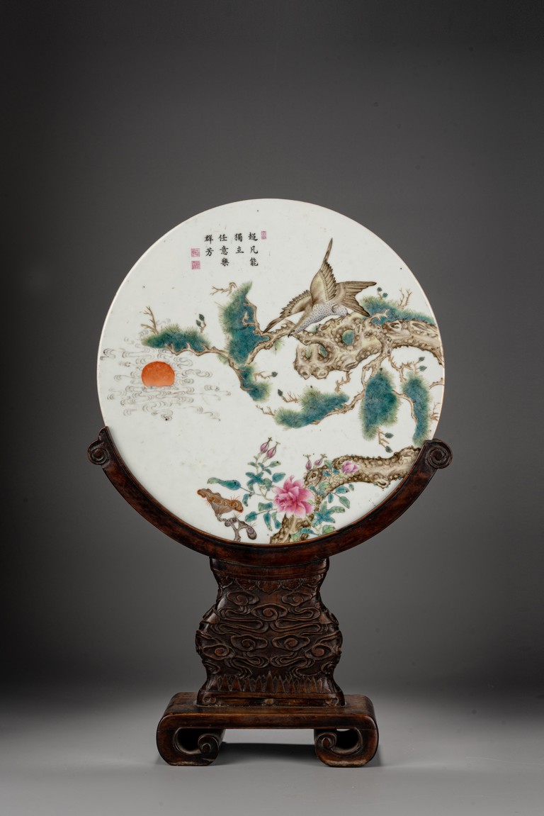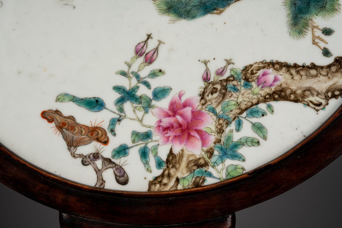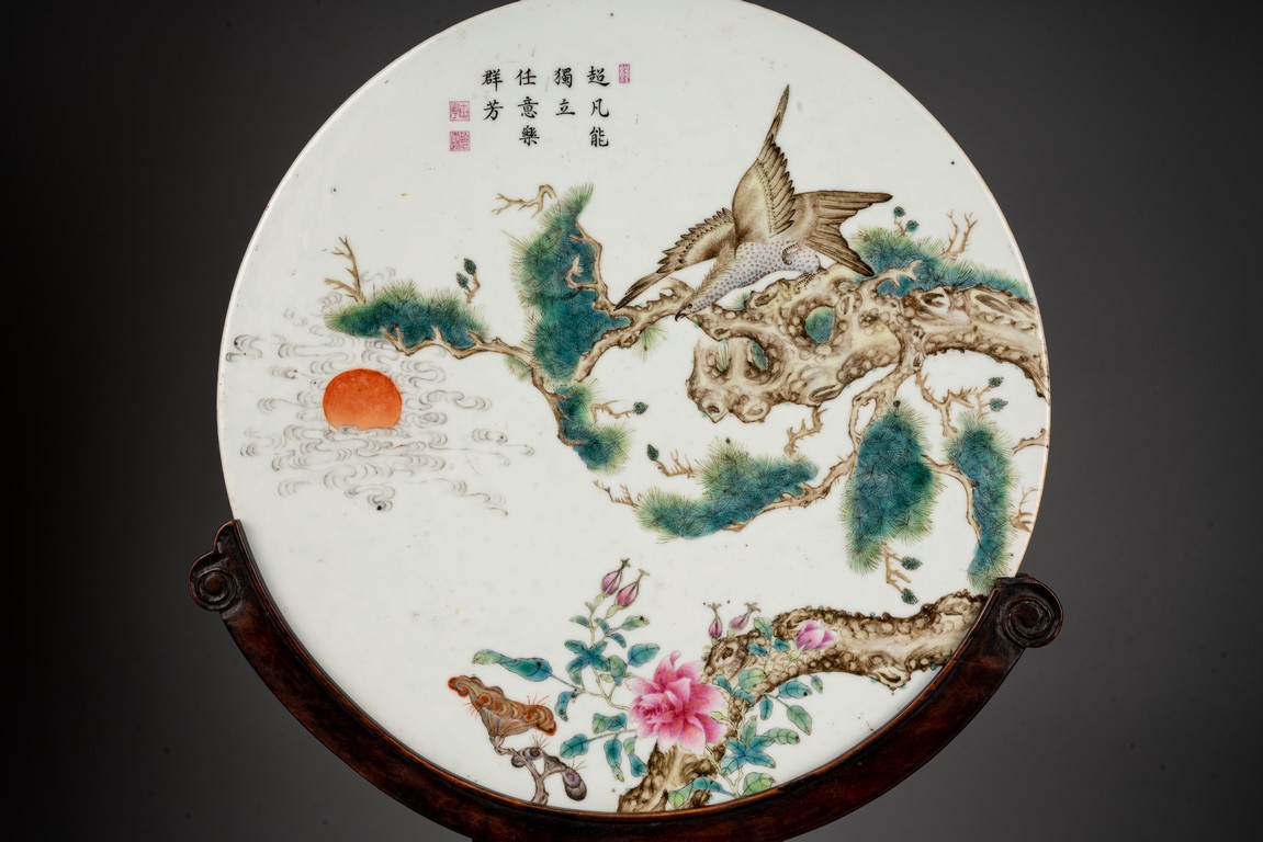 此插屏為瓷質,呈圓形,正面施白釉,以粉彩繪制松樹蒼鷹圖,鷹的淩厲,鬆的遒勁,花的嬌艷,日的朝氣表現的淋漓盡致,並落有詩文“超凡能獨立,任意樂群芳”,書寫流暢,構圖飽滿,繪制精細,胎質堅實細膩,釉面潔凈,修胎規整。帶原配木雕底座,包漿自然老到,十分難得。來源:洛杉磯私人藏家收藏 Provenance: Private collection, Los Angeles