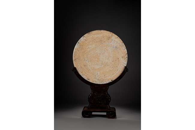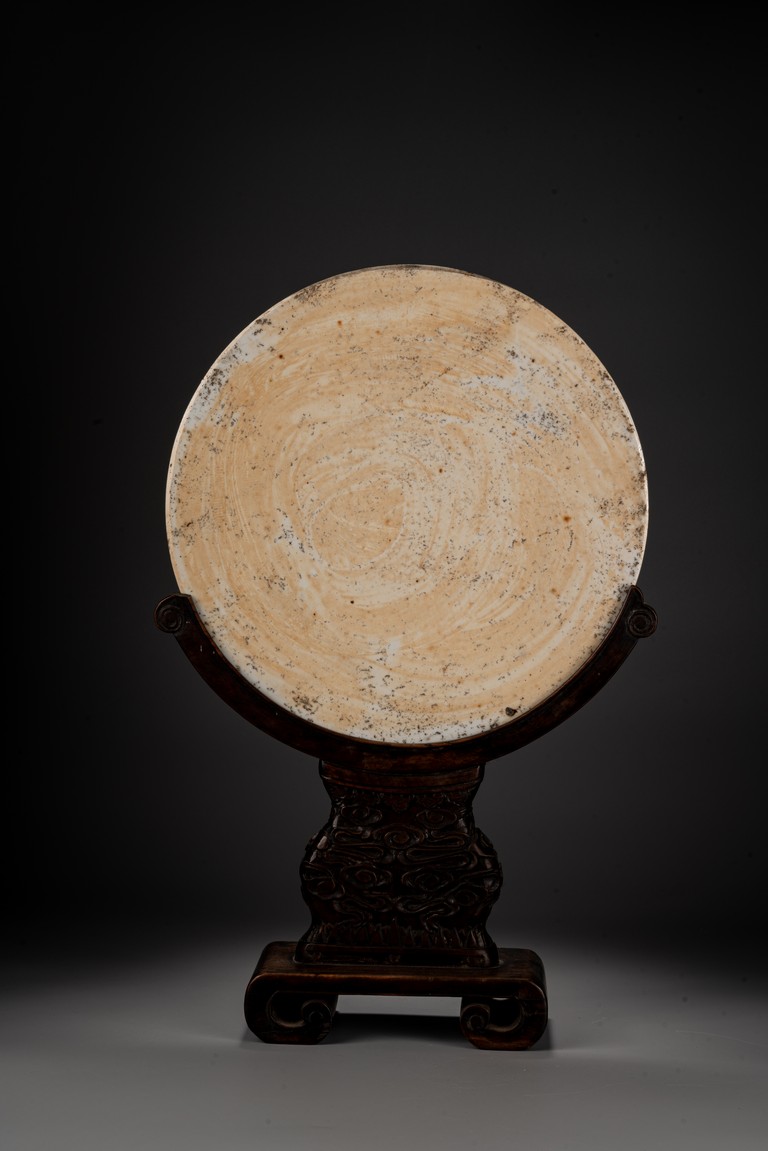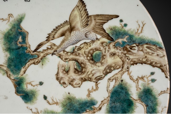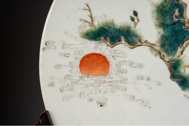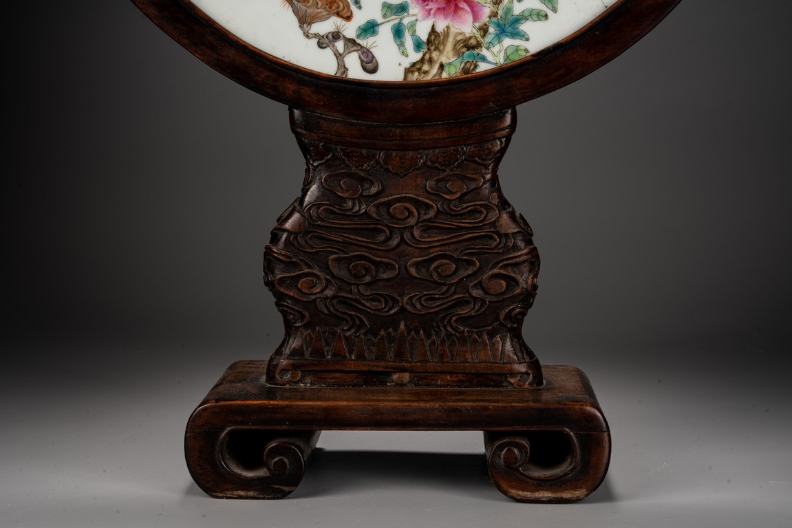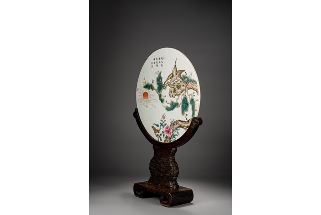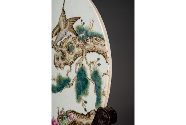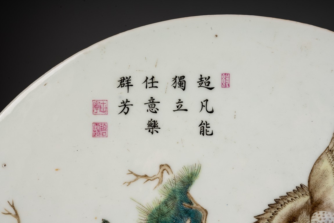此插屏為瓷質,呈圓形,正面施白釉,以粉彩繪制松樹蒼鷹圖,鷹的淩厲,鬆的遒勁,花的嬌艷,日的朝氣表現的淋漓盡致,並落有詩文“超凡能獨立,任意樂群芳”,書寫流暢,構圖飽滿,繪制精細,胎質堅實細膩,釉面潔凈,修胎規整。帶原配木雕底座,包漿自然老到,十分難得。來源:洛杉磯私人藏家收藏 Provenance: Private collection, Los Angeles