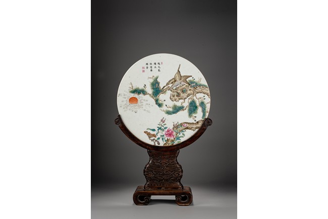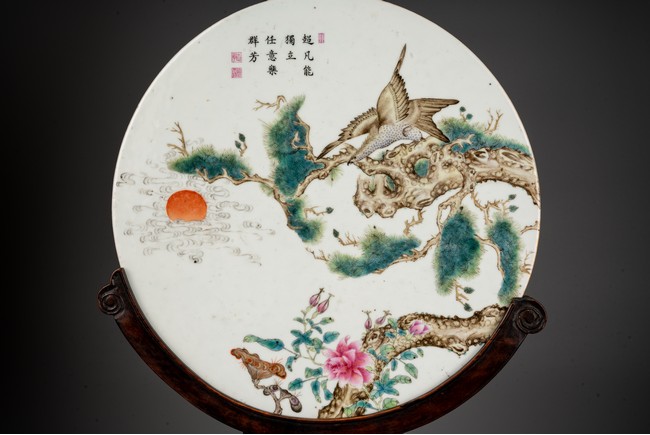 The circular porcelain panel finely enamelled to depict an eagle about to take off from standing upon a large gnarled pine tree branch, above leafy peonies and lingzhi fungus, with sun rising from auspicious clouds, all below a calligraphy inscription and three seal marks, all supported on carved hardwood stand. Late Qing/Republic period.