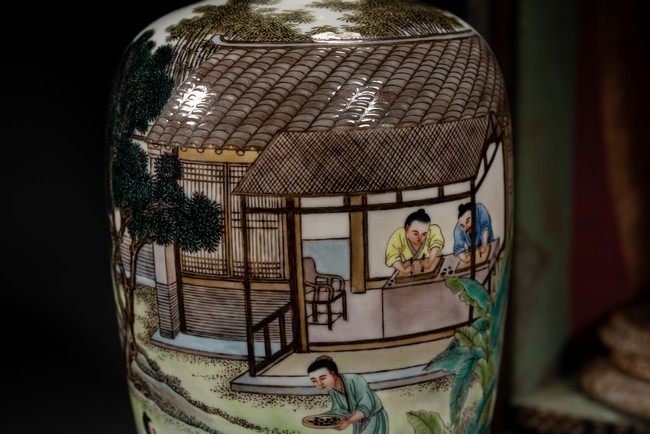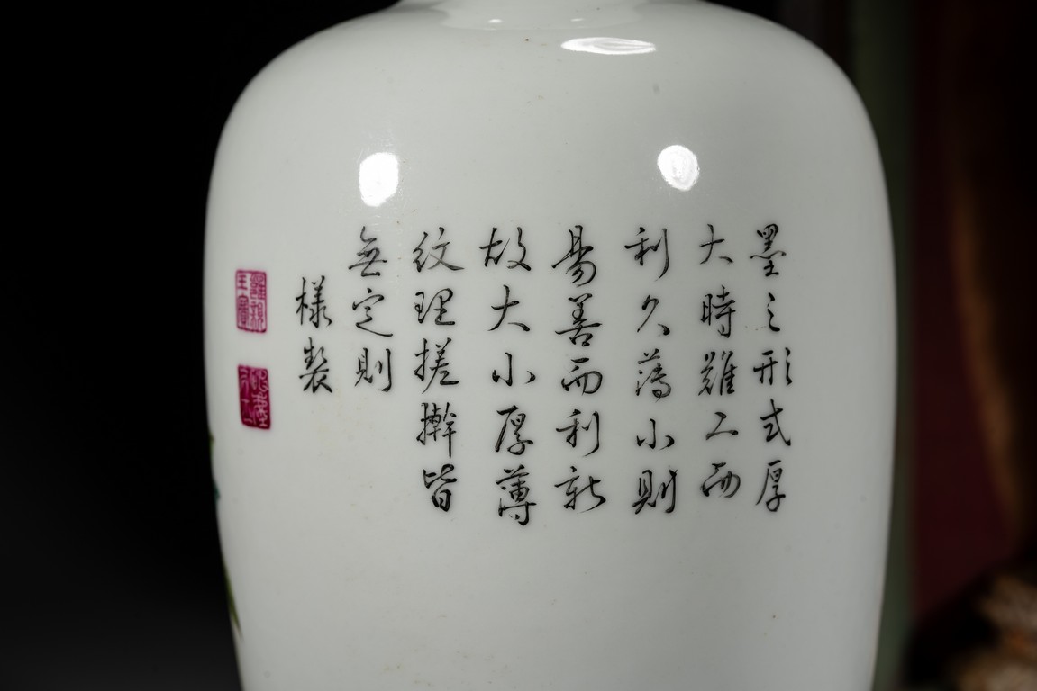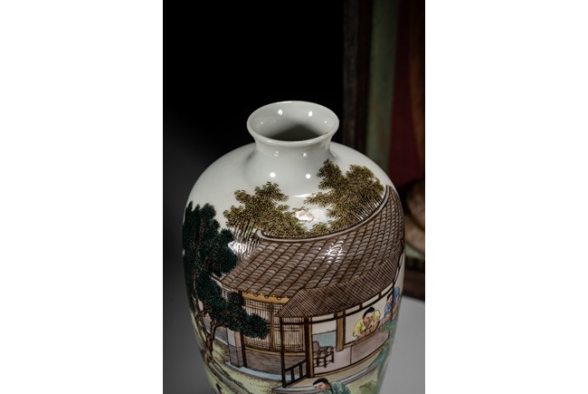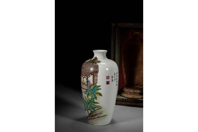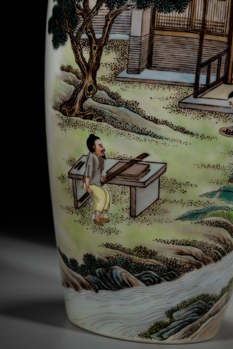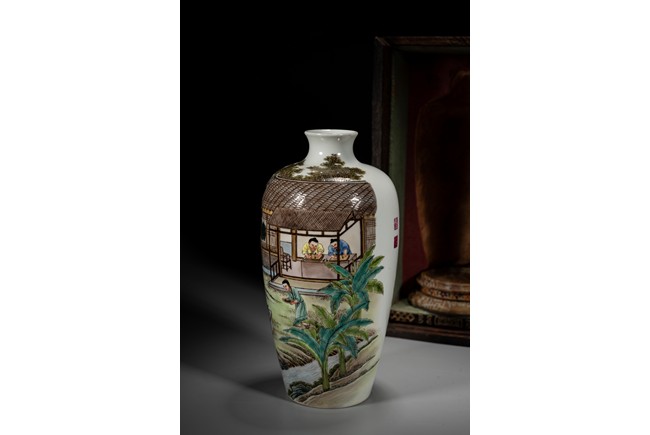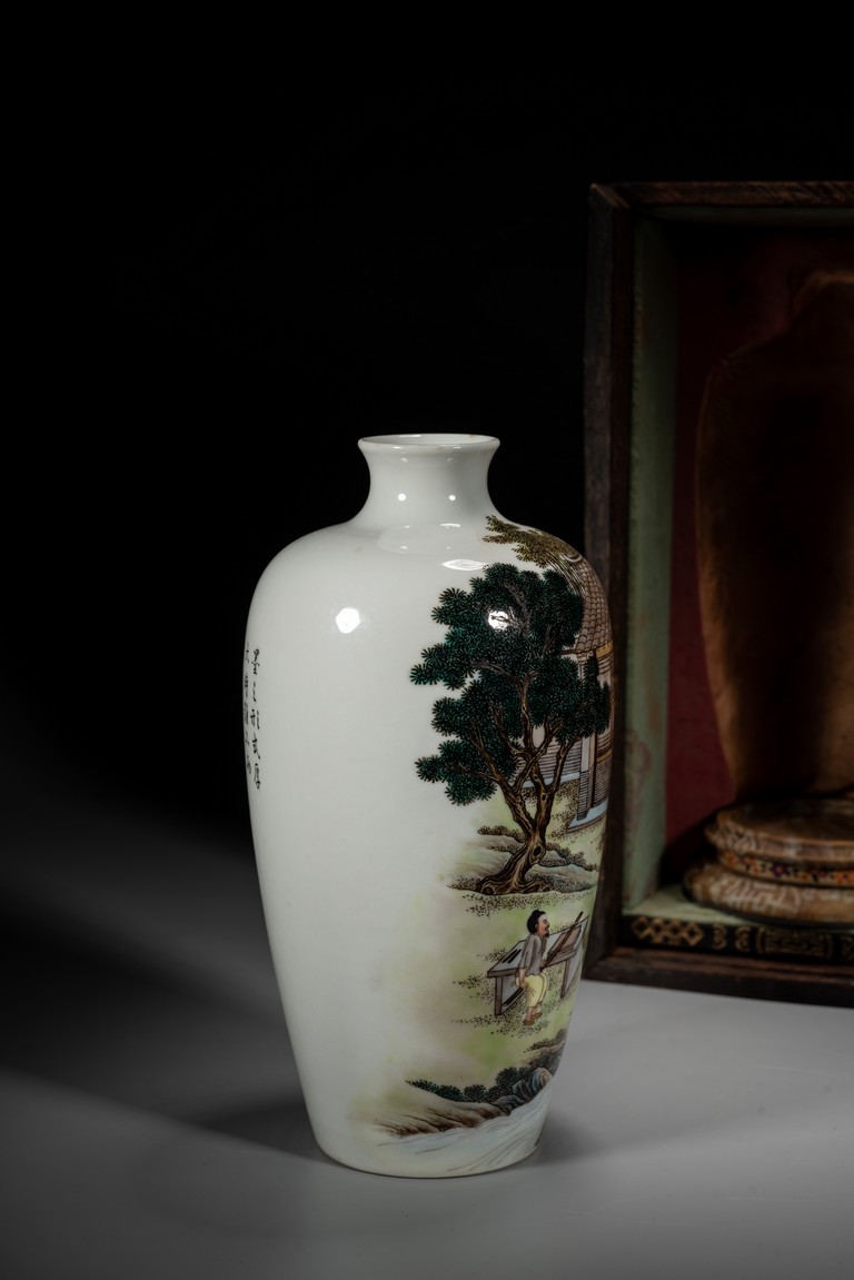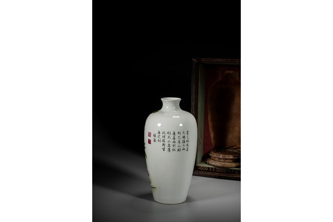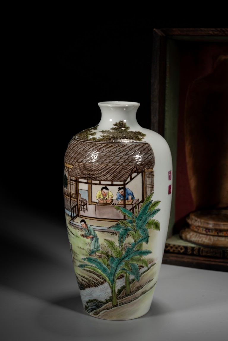此瓶圓口外撇,束短頸,豐肩,長弧腹,圈足外撇。通體以粉彩繪製墨圖,畫面生動,人物刻畫細膩入微,表情動作極為逼真。整體胎體輕薄,胎質細膩,釉面潔白亮潤,造型秀美端莊,施彩濃淡有致,保存完好,值得收藏。