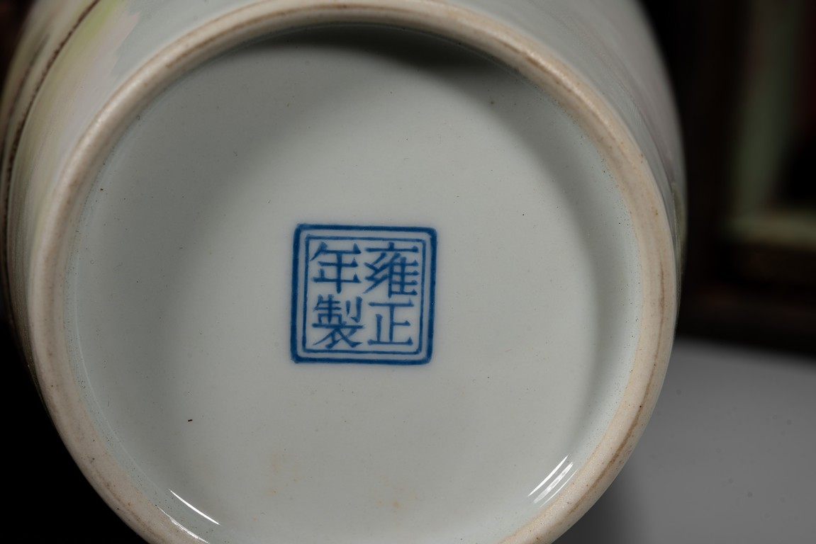 Of ovoid form, the exterior finely painted the scene of figures making ink cakes, the other side inscribed with inscriptions in running script and two seal marks, the base with apocryphal Yongzheng mark. Republic period.