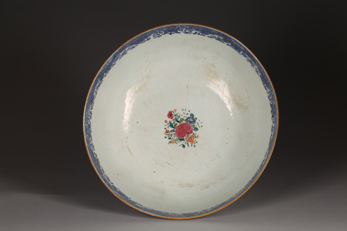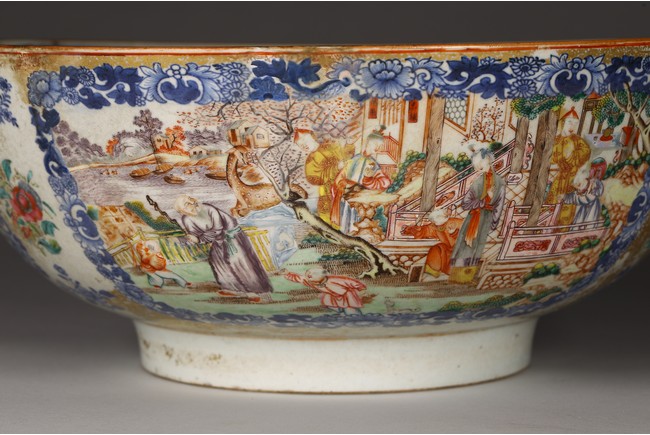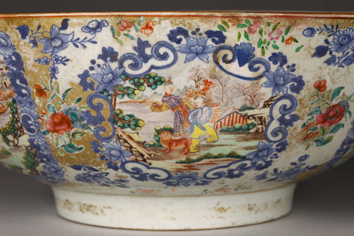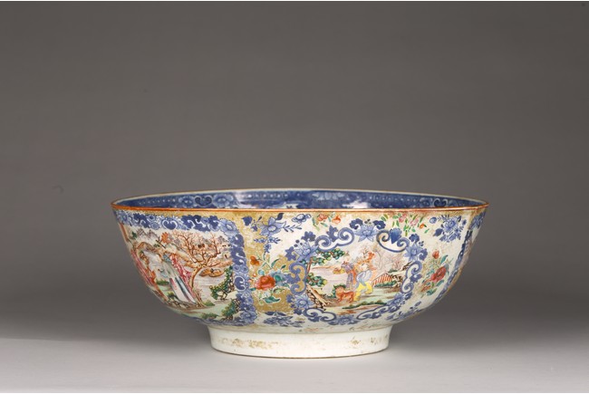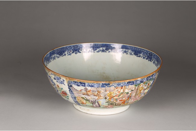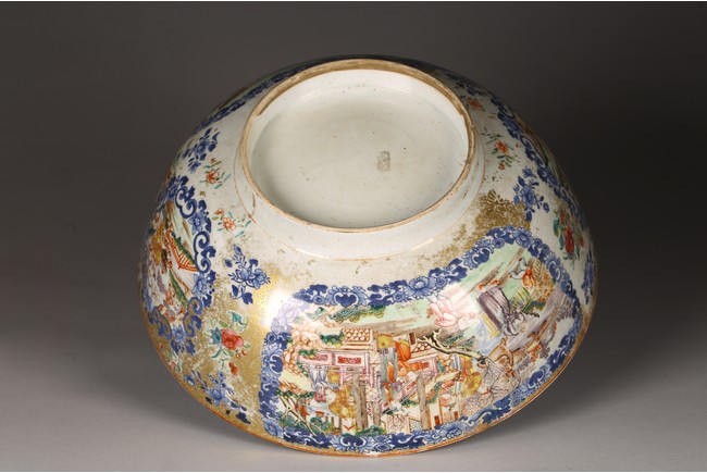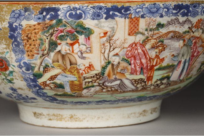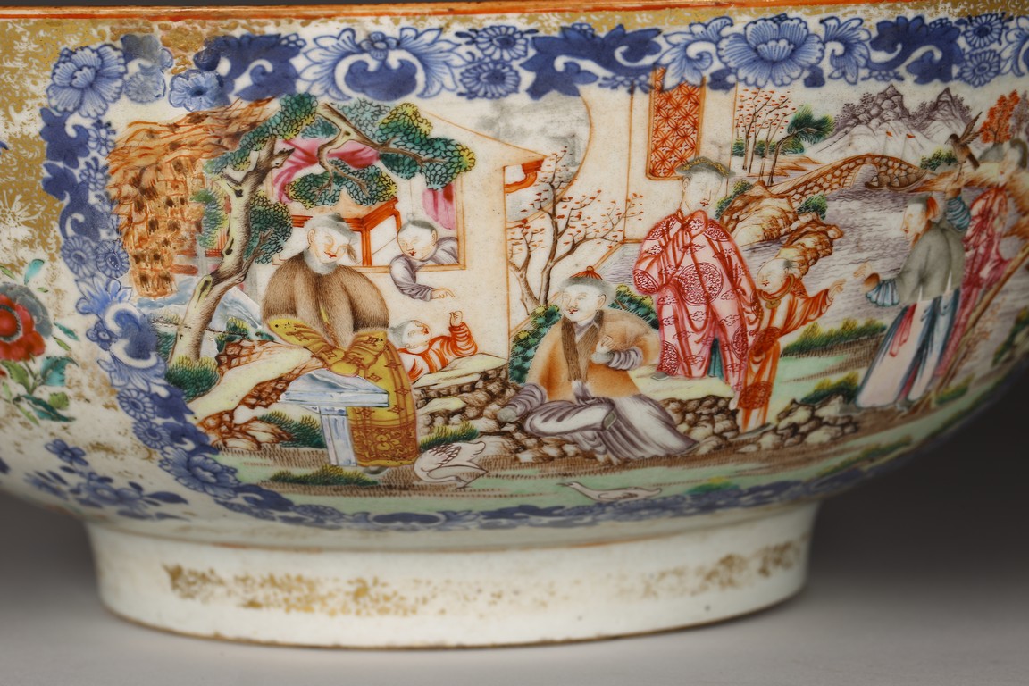 Chinese. Circular, the sides finely enameled with four panels of figures in a village landscape setting reserved on an underglaze blue and gilt foliate ground, the interior with leafy blossoms. Qing Dynasty Qianlong period, 18th century.