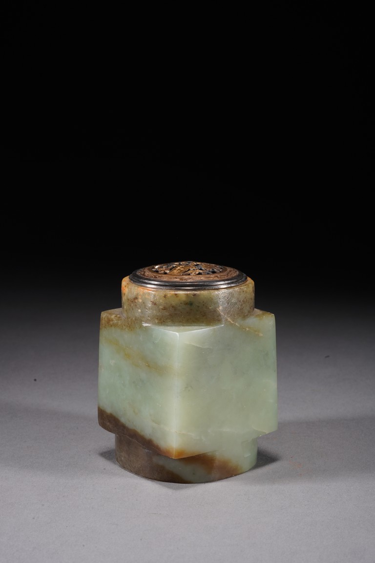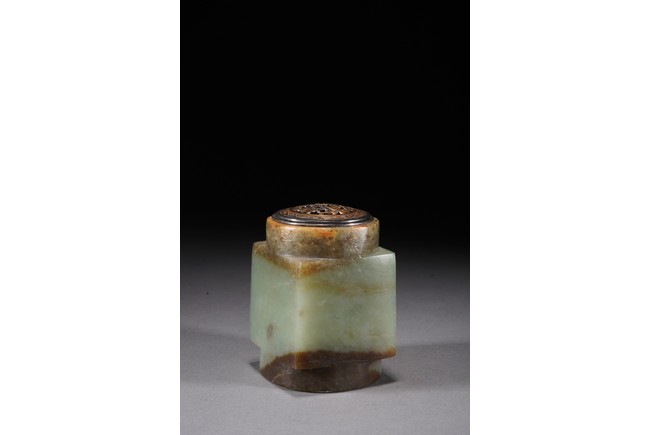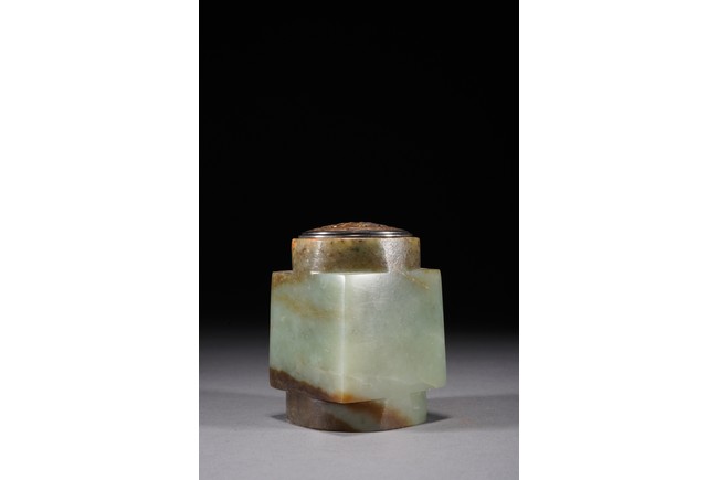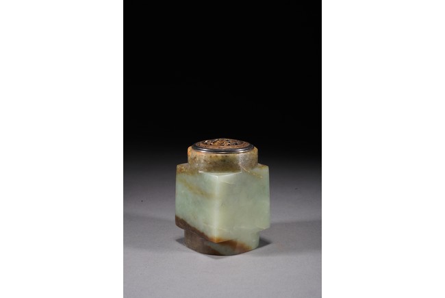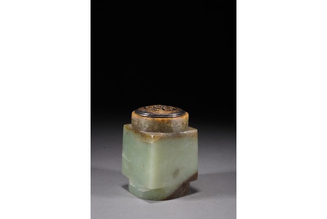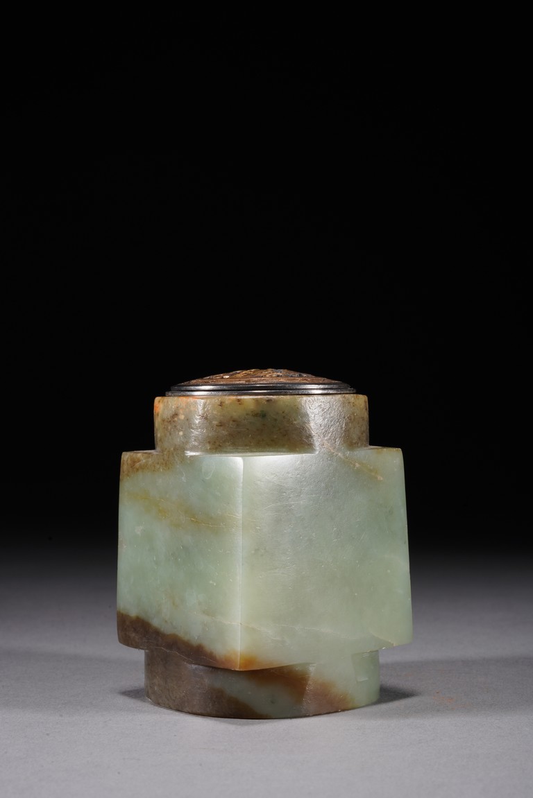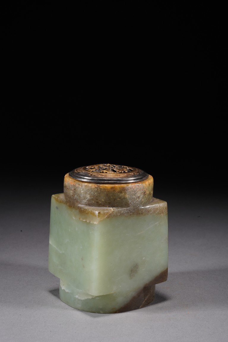 Chinese. Of square section with short neck and foot, the stone of a irregular celadon and russet-brown colour. Ming Dynasty period or later.