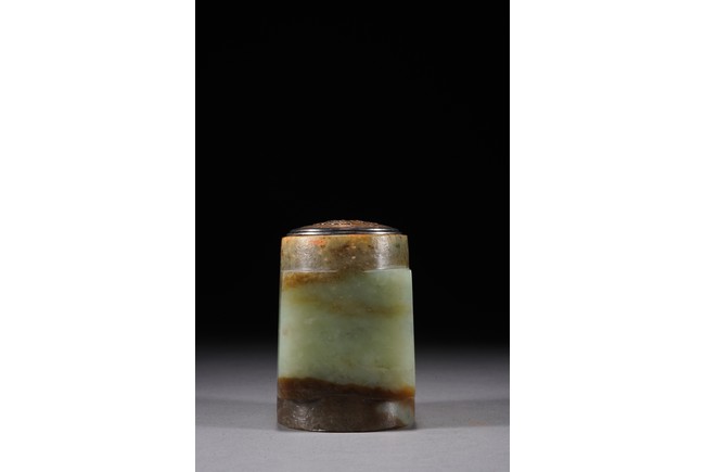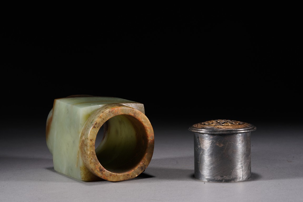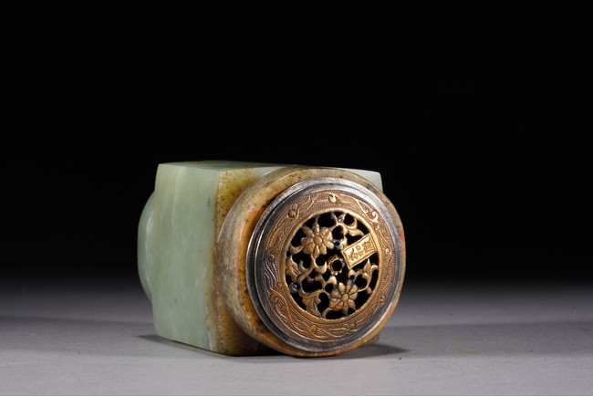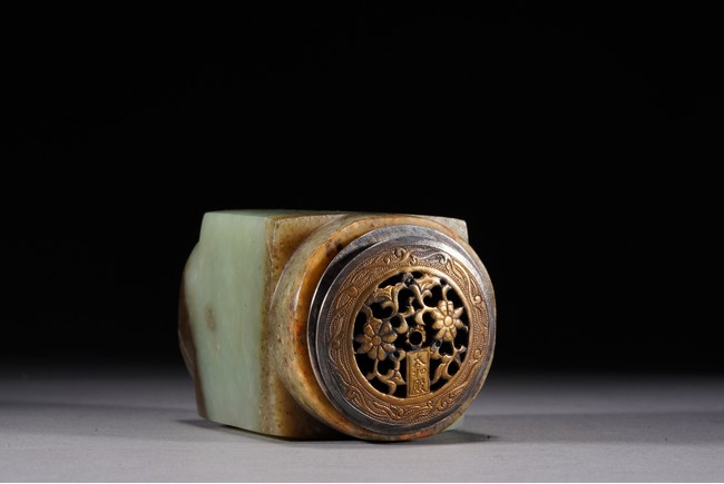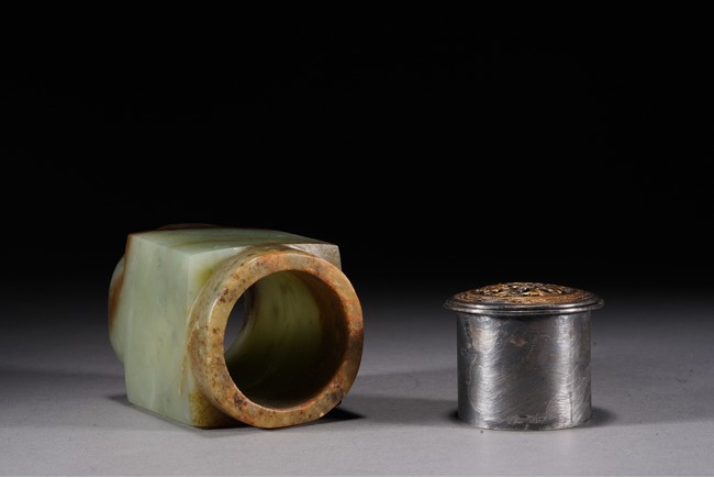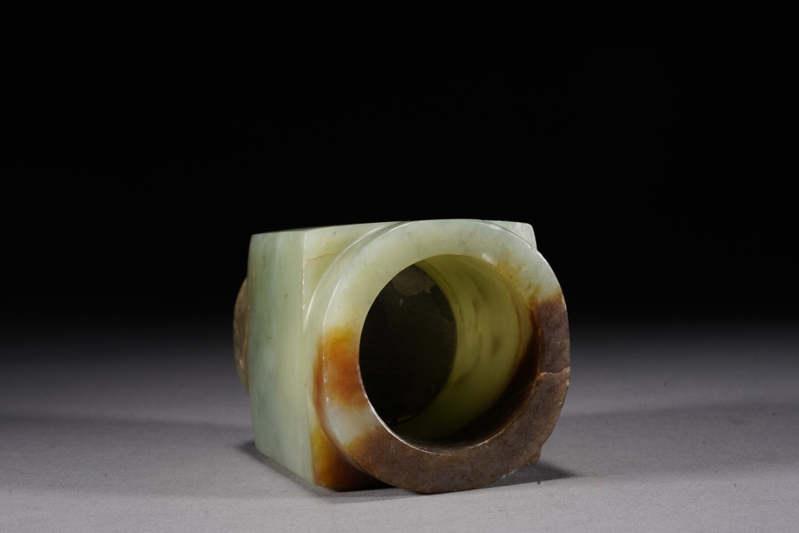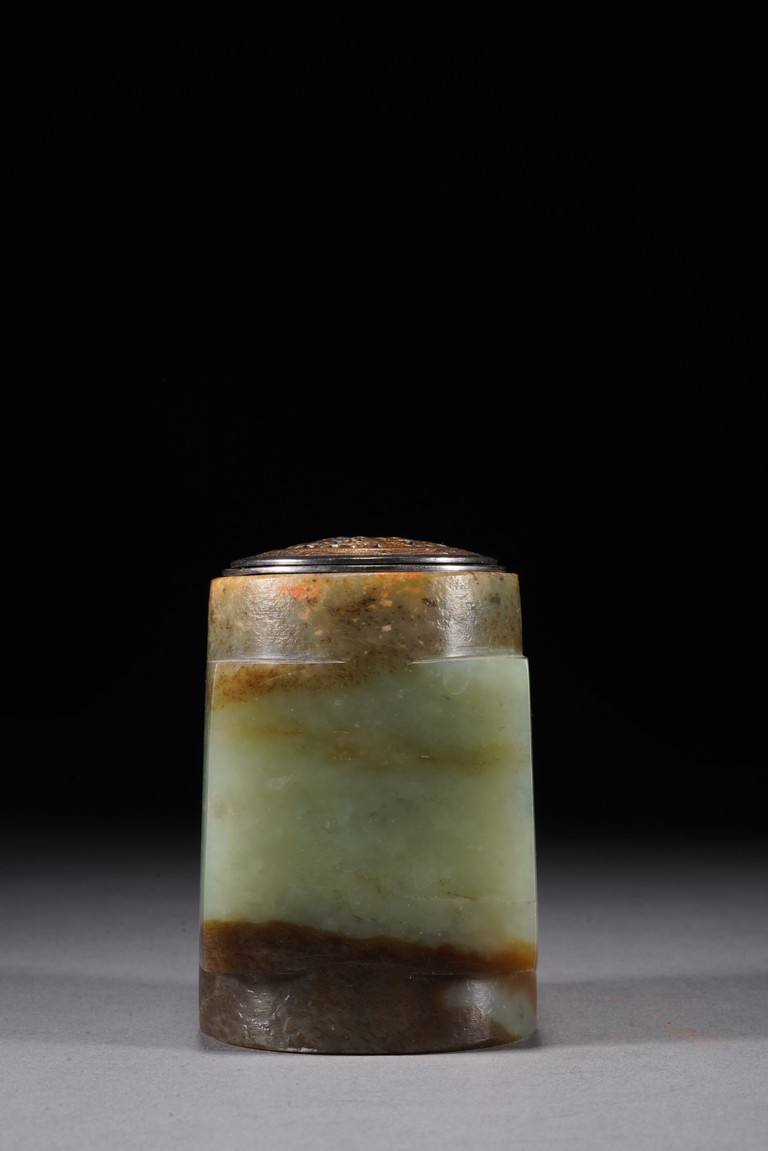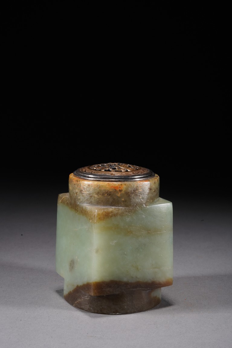 Chinese. Of square section with short neck and foot, the stone of a irregular celadon and russet-brown colour. Ming Dynasty period or later.